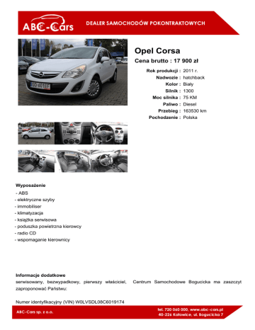 Opel Corsa Cena brutto : 17 900 zł Rok produkcji : 2011 r. Nadwozie : hatchback Kolor : Biały Silnik : 1300 Moc silnika : 75 KM Paliwo : Diesel Przebieg : 163530 km Pochodzenie : Polska Wyposażenie - ABS - elektryczne szyby - immobiliser - klimatyzacja - książka serwisowa - poduszka powietrzna kierowcy - radio CD - wspomaganie kierownicy Informacje dodatkowe serwisowany, bezwypadkowy, pierwszy właściciel, zaproponować Państwu: Numer identyfikacyjny (VIN) W0LVSDL08C6019174 Centrum Samochodowe Bogucicka ma zaszczyt Marka, model OPEL Corsa Van 1.3 CDTI Eur... Typ, wersja Corsa Van 1.3 CDTI Numer rejestracyjny GD601EF Silnik (rodz./poj./moc) diesel/1248 ccm/55 kW Stan licznika 163 528 km Data 1. rej./rok prod. 14-11-2011 /2011 Wyposażenie pojazdu ABS, Airbag kierowcy, Felgi stalowe 14 z ogumieniem, Immobilizer, Lusterka boczne regulowane elektrycznie, Schowki w przednich drzwiach, Wspomaganie układu kierowniczego, Wycieraczka szyby tylnej, Zderzaki w kolorze nadwozia, Ścianka działowa metalowa ażurowa, Gumowa wykładzina części ładunkowej, Lusterka sterowane i podgrzewane elektrycznie w kolorze nadwozia Wszelkich informacji na temat pojazdu udzielą handlowcy pod numerem telefonu: ( 32 441 71 11 ) Zapraszamy do jazdy próbnej i sprawdzenia auta na serwisie. Wszystkie oferowane przez Nas auta, - pochodzą z krajowej sieci dealerskiej, - są serwisowane w autoryzowanych stacjach obsługi, - w bieżącej ofercie handlowej oferujemy ponad 100 używanych samochodów o udokumentowanej historii napraw i przeglądów, - w stałej ofercie posiadamy pełny wybór aut, zarówno pod względem marek, modeli, jak i przebiegów, - z możliwością zakupu za gotówkę lub w leasing, - z możliwością finansowania z Pakietem serwisowo-gwarancyjnym - z możliwością odliczenia VAT ( pełna faktura VAT). Firma ABC-CARS Sp. z o.o., to prężnie rozwijający się, dealer samochodów używanych na terenie Górnego Śląska. Zapraszamy do odwiedzenia Naszej strony internetowej Master1.otomoto.pl. Jesteśmy tak pewni naszych samochodów, że naszym klientom gwarantujemy ich ponowne nabycie jeśli zdecydują się ponownie skorzystać z naszych usług. Co oznacza, że posiadamy centrum samochodowe? U nas można nie tylko kupić samochód. Oferujemy pomoc w kredycie, leasingu i ubezpieczeniu, doposażenie auta w interesujące ich akcesoria już w momencie zakupu, bieżącą obsługę serwisową oraz likwidowanie szkód komunikacyjnych. Zapraszamy do naszego centrum samochodowego w Katowicach na ulicy Bogucickiej 7. Niniejsze ogłoszenie jest wyłącznie informacją handlową i nie stanowi oferty w myśl art. 66, § 1. Kodeksu Cywilnego. Sprzedający nie odpowiada za ewentualne błędy lub nieaktualność ogłoszenia.