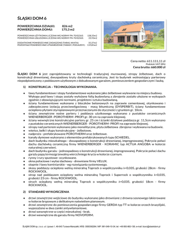 ŚLĄSKI DOM D 6 POWIERZC CHNIA DZIAŁ ŁKI: POWIERZC CHNIA DOMU: 826 6 m2 175 5,3 m2 POWIERZCHNIA A UŻYTKOWA LIC CZONA WG NORMY PN-70/02365 5: POWIERZCHNIA A USŁUGOWA LIC CZONA WG NORMY PN-70/02365 5: 138,35m2 25,93m2 35,37m2 DODATKOWE POWIERZCHNIE P Z ZADASZONE (TAR RAS, WIATA): POZOSTAŁE PO OWIERZCHNIE UT TWARDZONE (TA ARASY, PODJAZDY): 119,85m2 C Cena netto: 611.111,11 złł Po odatek VAT (8%)) Cena brutto o: 660.000 złł ŚLĄSKI DO OM 6 jest zaprojektow z wany w tech hnologii trad dycyjnej murrowanej, strropy żelbeto owe, dach o konstrukcji drewnianej, dwuspadow wy kryty dach hówką ceram miczną. Jest to budynek wolnostojący parterowy y niepodpiwniczony z poddaszem użyttkowym z dob budowanym garażem, pom mieszczeniem m gospodarczym i laubą. A – TECHNO OLOGIA WYK KONANIA. 1) KONSTRUKCJA ♦ ♦ ♦ ♦ ♦ ♦ ♦ ♦ ♦ ♦ ♦ ♦ ♦ ♦ ♦ ♦ ław wy fundamenttowe i stopy fundamentow f we wykonano jako żelbettowe wylewa ane na miejscu budowy. Wy ykopy pod ław wy i stopy zo ostały wyłożo one folią bud dowlaną a zb brojenie zosta ało ułożone w wykopach h zgo odnie z obowiiązującymi no ormami, projektem i sztuk ka budowlaną. ścia any fundame entowe wyko onano z blocczków beton nowych na zaprawie z cem mentowej, ottynkowano i zab bezpieczono izolacją prze eciwwilgocio ową - masą bitumiczną (DYSPERBIT ( T), ściany fun ndamentowe e ocie eplono płytam mi styropiano owymi przezznaczonymi do d styczności z gruntem gr. 10cm. ścia any zewnętrrzne nośne parteru i po oddasza uży ytkowego wykonano z pustaków ce eramicznych h WIE ENERBERGE ER -POROTH HERM -PROF FI gr. 30 cm na zaprawie klejowej. ścia any wewnętrrzne konstruk kcyjne parterru gr. 25 cm i ścianki dzia ałowe poddassza gr. 11,5cm m wykonano o z pu ustaków cera amicznych WIENERBERG W GER - POROT THERM- PRO OFI na zapraw wie klejowej. stro opy nad parte erem wykona ano jako mon nolityczne, płłyta żelbetow wa zbrojona i wylewana na n budowie. wie eńce, belki i słłupy konstrukcyjne - żelbetowe. nad dproża - prefa abrykowane POROTHER RM oraz żelbe etowe. kan nały dymowe wykonano z elementów prefabrykow p wanych typu SCHIEDEL. S dacch budynku mieszkalnego m o - dwuspado owy o konstru ukcji drewnia anej, impregn nowanej. Pok krycie połacii dacchu dachówk ką ceramiczn ną firmy WIE ENERBERGER - KORAM MIC typ ACTUA ANGOBA A w kolorze e naturalnej czerw wieni. dacch budynku garażu - jedno ospadowy o konstrukcji k drewnianej, im mpregnowan nej. Pokrycie połaci dachu u gara ażu papą term mozgrzewaln ną wierzchnie ego krycia w kolorze czarrnym. rynny i rury spusstowe- ocynk kowane. okn na połaciowe i wyłaz dach howy - drewn niane firmy VELUX. stop pnie i ławy ko ominiarskie - wg rozwiąza ania systemo owego. sko osy poddaszy y ocieplono wełną w minera alną Toprock o współczyn nniku λ=0,03 35, grubości 28cm 2 - firmy y ROCKWOOL. stro op nad podd daszem ociep plony wełna a mineralną Toprock i Superrock o współczynniku λ=0,035,, grubości 23 cm - firmy ROCK KWOOL. stry ych ocieplon ny wełną mineralną m To oprock o współczynniku u λ=0,035, grubości 18 8cm - firmy y ROCKWOOL. 2) STA ANDARD WY YKOŃCZENIA ♦ ♦ ♦ ♦ drzw wi zewnętrzn ne wejściowe e do budynku u wykonano jako j drewnia ane z drewna a sosnowego lakierowane e w kolorze brązo owym z delika atnym naświe etlem pionow wym. drzw wi zewnętrzn ne do pomiesszczenia gospodarczego firmy f GERDA A typ TT w kolorze orzecch brazylijski,, wyp posażone w dwa d zamki an ntywłamaniowe. drzw wi wewnętrzzne w części mieszkalnej m – –brak. drzw wi wewnętrzzne do garażu u firmy NOVO OFERM. ŚLĄSKI DO OM sp. z o.o. ul. Lipowa 1, 46-045 Turaawa-Marszałki; KR RS: 0000392264; NIP: 991-049-10-34; tel: +48 693-863-1136; e-mail: biuro@ @slaskidom.pl ♦ ♦ ♦ ♦ ♦ ♦ ♦ ♦ ♦ ♦ brama garażowa firmy NOVOFERM typ ISO 45, segmentowe w kolorze macore z napędem elektrycznym, wyposażone w pilot do sterowania bramą. okna i drzwi tarasowe wykonane jako drewniane firmy FILA ,sosna łączona, profil SOFT LINE, szer. 78 mm, wkład trzyszybowy Ug=0,7, kolor Afromozja Gori . rolety nadstawne z napędem elektrycznym VEGAS REVO z pancerzem aluminiowym w kolorze bieli kremowej. witryny szklane w laubie wykonane jako drewniane firmy FILA ,sosna łączona, profil SOFT LINE, szer. 68 mm, wkład trzyszybowy Ug=0,7, kolor Afromozja Gori . parapety zewnętrzne wykonane z cegły klinkierowej pełnej RÖBEN typ DARWIN z fugą w kolorze szarym. parapety wewnętrzne wykonane z marmuru BRECCIA o grubości 2cm. posadzki: parteru: dwie warstwy folii budowlanej na chudym betonie, styropian FS 100 gr.10cm, folia refleksyjna pod ogrzewanie podłogowe, jastrych cementowy gr. ok. 7cm. poddasza: styropian FS 100 gr. 5cm, ułożony na płycie żelbetowej, folia refleksyjna pod ogrzewanie podłogowe, jastrych cementowy, ok. 7cm. tynki: na ścianach w salonie, kuchni, łazienkach oraz w garażu i pomieszczeniu technicznym - tynk cementowo-wapienny III kategorii. na ścianach i sufitach w pozostałych pomieszczeniach mieszkalnych-tynki gipsowe. kratki wentylacyjne i drzwiczki rewizyjne - wg rozwiązań systemowych. schody wewnętrzne drewniane –brak. 3) ELEWACJE ♦ ♦ ♦ ♦ ♦ elewację budynku ocieplono styropianem EPS 70 - gr. 15cm. elewację budynku mieszkalnego wykonano z akrylowego cienkowarstwowego tynku strukturalnego w kolorze białym na siatce zatopionej w kleju do systemu ociepleń. elewację lauby obłożono płytką klinkierową firmy RÖBEN typ DARWIN z fugą w kolorze szarym. elewację tarasu zadaszonego i garażu obłożono płytką klinkierową firmy RÖBEN typ DARWIN z fugą w kolorze szarym. gzymsy na elewacjach budynku zostały wykonane z kształtek styropianowych pokrytych klejem z siatką, pomalowane w kolorze elewacji głównej budynku mieszkalnego. 4) INSTALACJE SANITARNE Ilość i lokalizacja elementów grzewczych oraz podejść do odbiorników sanitarnych w budynku zgodna ze szczegółowym projek