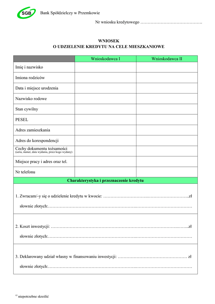 Bank Spółdzielczy w Przemkowie Nr wniosku kredytowego ……………………………………. WNIOSEK O UDZIELENIE KREDYTU NA CELE MIESZKANIOWE Wnioskodawca I Wnioskodawca II Imię i nazwisko Imiona rodziców Data i miejsce urodzenia Nazwisko rodowe Stan cywilny PESEL Adres zamieszkania Adres do korespondencji Cechy dokumentu tożsamości (seria, numer, data wydania, przez kogo wydany) Miejsce pracy i adres oraz tel. Nr telefonu Charakterystyka i przeznaczenie kredytu 1. Zwracam/-y się o udzielenie kredytu w kwocie: ………………………….………………………..zł słownie złotych:…………………………………………………….………………………………… 2. Koszt inwestycji: …………………………………………………………………………….……..zł słownie złotych:…………………………………………………….………………………………… 3. Deklarowany udział własny w finansowaniu inwestycji: ………………………………………… zł słownie złotych:…………………………………………………….………………………………… x) niepotrzebne skreślić 4. Okres kredytowania: ………………………… miesięcy w tym okres wykorzystania i karencji w spłacie kredytu: …………………………….. miesięcy 5. Przedmiot finansowania: Budowa domu jednorodzinnego: ………………………………………………………………………………………………………………… ………………………………………………………………………………………………………………… Nadbudowa, przebudowa, rozbudowa budynku mieszkalnego, lub adaptacja budynku/ lokalu o innym przeznaczeniu na cele mieszkalne, w celu uzyskania lokalu mieszkalnego stanowiącego odrębną nieruchomość: ………………………………………………………………………………………………………………… ………………………………………………………………………………………………………………… Zakup będącego w budowie lub nowo wybudowanego domu jednorodzinnego/ lokalu mieszkalnego, stanowiącego odrębną nieruchomość, od gminy lub osoby, która wybudowała ten budynek w ramach wykonywanej działalności gospodarczej: ………………………………………………………………………………………………………………… ………………………………………………………………………………………………………………… Pokrycie kosztów budowy lokalu mieszkalnego, budowanego przez spółdzielnię mieszkaniową w celu ustanowienia odrębnej własności tego lokalu: ………………………………………………………………………………………………………………… ………………………………………………………………………………………………………………… Wniesienie wkładu do spółdzielni mieszkaniowej w celu uzyskania spółdzielczego prawa do zasiedlanego po raz pierwszy lokalu mieszkalnego: ………………………………………………………………………………………………………………… ………………………………………………………………………………………………………………… Remont budynku mieszkalnego (z wyłączeniem remontu nie wymagającego pozwolenia na budowę oraz remontu lokalu w budynku wielorodzinnym): ………………………………………………………………………………………………………………… ………………………………………………………………………………………………………………… 6. Przewidywane terminy wykorzystania kredytu i wysokość poszczególnych transz: Termin Kwota Kwota słownie 1) 2) 3) 4) x) niepotrzebne skreślić Prawne zabezpieczenie kredytu: 7. Jako prawne zabezpieczenie kredytu proponuję: 1. hipotekę na nieruchomości stanowiącej własność/ użytkowanie wieczyste lub na ograniczone prawnie rzeczowym x) ………………………………….………………………………………….. dla której/-ego prowadzona jest przez …………………………………………………………….. (określenie sądu) księga wieczysta KW nr ………………………………., wraz z cesją praw z umowy ubezpieczenia nieruchomości; 2. weksel własny In blanco wraz z deklaracją wekslową; 3. inne zabezpieczenia: ………………………………………………………………………………………………………………… ………………………………………………………………………………………………………………… Do czasu ustanowienia hipoteki proponuję ustanowienie następującego zabezpieczenia przejściowego: ………………………………………………………………………………………………………………… ………………………………………………………………………………………………………………… Oświadczam/-y, iż inwestycja finansowana kredytem udzielonym przez Bank Spółdzielczy w Przemkowie, wskazana w rubryce 5 niniejszego wniosku kredytowego, służy zaspokojeniu moich/naszych własnych potrzeb mieszkaniowych i nie jest dokonywana w ramach prowadzonej przeze mnie/ przez nas działalności gospodarczej. Oświadczam pod rygorem odpowiedzialności karnej przewidzianej w art. 297§1 Kodeksu karnego (Dz. U. Nr 88 póz. 553 z 1997 r. z późn. zmianami), że informacje podane w tym wniosku są zgodne że stanem faktycznym. Wyrażam zgodę na sprawdzenie przez Bank podanych powyżej informacji. Niniejszym wyrażam zgodę na włączenie moich danych osobowych do zbioru danych przetwarzanych w Banku w związku z ubieganiem si