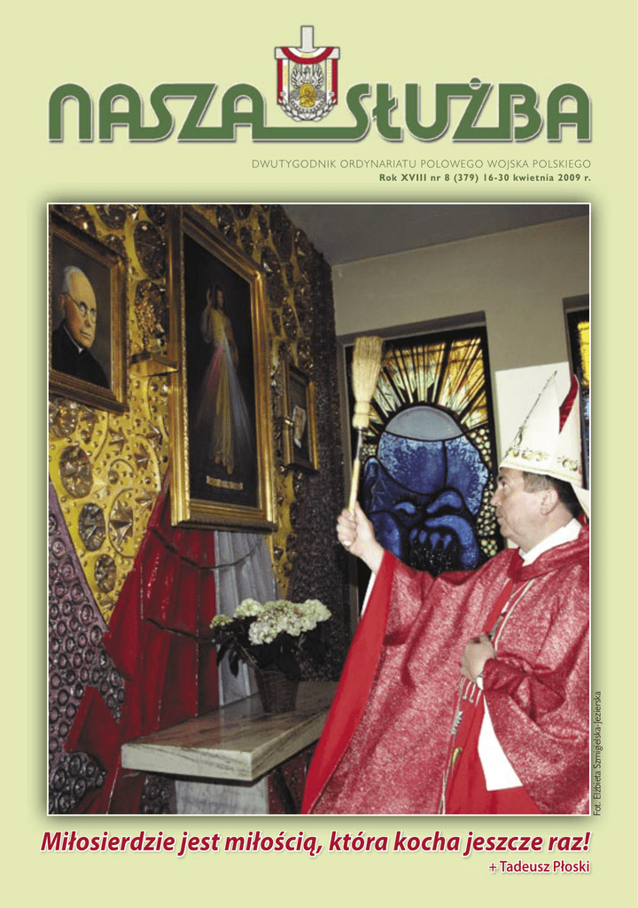 DWUTYGODNIK ORDYNARIATU POLOWEGO WOJSKA POLSKIEGO Fot. Elżbieta Szmigielska-Jezierska Rok XVIII nr 8 (379) 16-30 kwietnia 2009 r. Miłosierdzie jest miłością, która kocha jeszcze raz! + Tadeusz Płoski Z nauczania Koœcio³a Katolickiego „Mi³osierna mi³oœæ Boga dziœ, tak jak wczoraj jednoczy mocno Koœció³”. (Przemówienie Benedykta XVI przed modlitw¹ „Regina Caeli”) Zmartwychwstawszy Jezus obdarzył swoich nową jednością, silniejszą niż kiedyś, niezwyciężoną, ponieważ opartą nie na ludzkich zdolnościach, lecz na Bożym miłosierdziu, które sprawiło, że wszyscy czuli, że On ich ukochał i im przebaczył Drodzy bracia i siostry! Wam tu obecnym oraz tym, którzy łączą się z nami za pośrednictwem radia i telewizji ponawiam z serca gorące życzenia wielkanocne w tę niedzielę, która kończy oktawę Wielkanocy. W atmosferze radości, jaka płynie z wiary w zmartwychwstałego Chrystusa, pragnę wyrazić serdeczne podziękowanie tym wszystkim – a jest ich naprawdę wielu – którzy zechcieli nadesłać mi wyrazy miłości i duchowej bliskości w tych dniach, zarówno z okazji świąt wielkanocnych, jak i moich urodzin – 16 kwietnia – jak również z okazji przypadającej dziś właśnie czwartej rocznicy mojego wyboru na Stolicę Piotrową. Dziękuję Panu za chóralność tak wielkiej miłości. Jak miałem możność stwierdzić niedawno, nie czuję się nigdy sam. Tym bardziej w tym wyjątkowym tygodniu, który dla liturgii jest jednym dniem, zaznałem jedności, która mnie otacza i wspiera: duchowej solidarności, karmiącej się zasadniczo modlitwą, która wyraża się na tysiące sposobów. Poczynając od moich współpracowników z Kurii Rzymskiej po parafie geograficznie dalekie, my katolicy stanowimy i musimy czuć się jedną rodziną, ożywianą tymi samymi uczuciami, co pierwsza wspólnota chrześcijańska, o której czytany dzisiejszej niedzieli tekst Dziejów Apostolskich, powiada: Fatima – znak czasu „Jeden duch i jedno serce ożywiały wszystkich wierzących” (Dz 4, 32). Opowiada bowiem Ewangelia, że w chwili męki, gdy boski Nauczyciel został aresztowany i skazany na śmierć, uczniowie rozpierzchli się. Tylko Maryja i niewiasty z apostołem Janem pozostali razem i poszli za Nim aż na kalwarię. Zmartwychwstawszy Jezus obdarzył swoich nową jednością, silniejszą niż kiedyś, niezwyciężoną, ponieważ opartą nie na ludzkich zdolnościach, lecz na Bożym miłosierdziu, które sprawiło, że wszyscy czuli, że On ich ukochał i im przebaczył. „Miłosierna miłość Boga dziś, tak jak wczoraj jednoczy mocno Kościół. To zatem czyni z ludzkości jedną rodzinę; miłość Boża, która za pośrednictwem Jezusa ukrzyżowanego i zmartwychwstałego, przebacza nam grzechy i wewnętrznie nas odnawia. Powodowany głębokim przekonaniem o tym mój umiłowany poprzednik Jan Paweł II zechciał dedykować tę niedzielę, drugą wielkanocną, Bożemu Miłosierdziu, i wskazał wszystkim w zmartwychwstałym Chrystusie źródło ufności i nadziei, podejmując duchowe orędzie duchowe przekazane przez Pana św. Faustynie Kowalskiej, zawierające się w inwokacji „Jezu, ufam Tobie!”. Jak w pierwszej wspólnocie, to Maryja towarzyszy nam w codziennym życiu. Wzywamy Ją jako „Królową Niebios”, wiedząc, że Jej królewskość jest taka, jak królewskość Jej Syna: samą miłością i to miłością miłosierną. Proszę was, byście powierzyli Jej znowu moją posługę Kościołowi, gdy z ufnością mówimy Jej: Mater misericordiae, ora pro nobis. ml (KAI Rzym) / Castel Gandolfo Sługa Boży Jan Paweł II mówił nam: „Znaki czasu przemawiają za tym, że znajdujemy się w orbicie wielkiego zmagania pomiędzy dobrem a złem, pomiędzy potwierdzeniem a zaprzeczeniem Boga, Jego obecności w świecie oraz zbawienia, które w Nim ma swój początek i kres. Znaki te wskazują na Niewiastę, wespół z którą winniśmy zejść nad tę krawędź czasu, jaką wytycza kończące się stulecie i tysiąclecie. Właśnie z Nią powinniśmy stawić czoła tym zmaganiom, których nasz czas jest pełen”. Dlaczego właśnie z Maryją? Może dlatego, że jak mówiła Siostra Łucja, „Bóg jest jedynym, który może nas uratować”, a chce to uczynić nie inaczej, tylko „za pośrednictwem Niepokalanego Serca Maryi, naszej niebieskiej Matki, która jest taka dobra!”. Przecież fatimska wizjonerka zapewniała, że „cześć oddawana Niepokalanemu Sercu Maryi jest środkiem zbawienia na trudne czasy Kościoła i świata”. W kolejną rocznicę pierwszego objawienia w Fatimie (13 maja 1917 r.) musimy pochylić się z uwagą nad największą „eksplozją nadprzyrodzo- 1 maja – Wspomnienie Józefa Rzemieślnika (J 6, 52-59) Św. Józef jest wzorem chrześcijan w spełnianiu czynności domowych i zawodowych. Pracował w stałej zażyłości z Jezusem i Maryją. Podobnie chrześcijanin powinien pamiętać, że pracując spełnia nakaz Boży „czyńcie sobie ziemię poddaną” i przygotowuje się do życia wiecznego. 3 maja – IV Niedziela Wielkanocna J 10, 11-18 „Jezus jest dobrym pasterzem” Jezus mówi o sobie jako o dobrym pasterzu w szeregu obrazów. Ich głębię i prawdę zrozumiemy dopiero w świetle Jego śmierci i zmartwychwstania: zwłaszcza jedność Jezusa z Ojcem i wspólnotę, która Go łączy z uczniami. Oprócz tego słowa Jezusa zawierają dwa poważne napomnienia. Pierwsze dotyczy wszystkich: mamy zachować jedność w wierze i miłości. Drugie zwrócone jest do pasterzy: mają oni naśladować Jezusa, Dobrego Pasterza, i jak On służyć powierzonej sobie trzodzie. 10 maja – V Niedziela Wielkanocna (J 15, 1-8) „Ja Jestem krzewem winnym a wy latoroślami. Kto trwa we Mnie a Ja w nim, ten przynosi owoc obfity, ponieważ beze Mnie nic uczyni nie możecie” (J 15,5 n.) Latorośl sama owocu przynieść nie może jak tylko przez Jezusa Chrystusa. On jest Tym który przez swe człowieczeństwo 