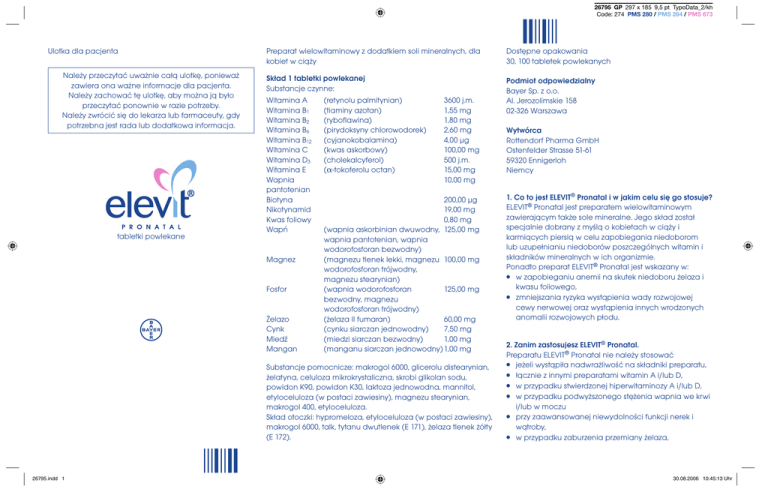 26795 GP 297 x 185 9,5 pt TypoData_2/kh Code: 274 PMS 280 / PMS 284 / PMS 673 Ulotka dla pacjenta Należy przeczytać uważnie całą ulotkę, ponieważ zawiera ona ważne informacje dla pacjenta. Należy zachować tę ulotkę, aby można ją było przeczytać ponownie w razie potrzeby. Należy zwrócić się do lekarza lub farmaceuty, gdy potrzebna jest rada lub dodatkowa informacja. tabletki powlekane Preparat wielowitaminowy z dodatkiem soli mineralnych, dla kobiet w ciąży Dostępne opakowania 30, 100 tabletek powlekanych Skład 1 tabletki powlekanej Substancje czynne: 3600 j.m. (retynolu palmitynian) Witamina A 1,55 mg (tiaminy azotan) Witamina B1 1,80 mg (ryboflawina) Witamina B2 2,60 mg (pirydoksyny chlorowodorek) Witamina B6 4,00 μg (cyjanokobalamina) Witamina B12 (kwas askorbowy) Witamina C 100,00 mg (cholekalcyferol) Witamina D3 500 j.m. (␣-tokoferolu octan) 15,00 mg Witamina E 10,00 mg Wapnia pantotenian Biotyna 200,00 μg Nikotynamid 19,00 mg Kwas foliowy 0,80 mg Wapń (wapnia askorbinian dwuwodny, 125,00 mg wapnia pantotenian, wapnia wodorofosforan bezwodny) Magnez (magnezu tlenek lekki, magnezu 100,00 mg wodorofosforan trójwodny, magnezu stearynian) Fosfor (wapnia wodorofosforan 125,00 mg bezwodny, magnezu wodorofosforan trójwodny) (żelaza II fumaran) Żelazo 60,00 mg (cynku siarczan jednowodny) Cynk 7,50 mg (miedzi siarczan bezwodny) Miedź 1,00 mg (manganu siarczan jednowodny) 1,00 mg Mangan Podmiot odpowiedzialny Bayer Sp. z o.o. Al. Jerozolimskie 158 02-326 Warszawa Substancje pomocnicze: makrogol 6000, glicerolu distearynian, żelatyna, celuloza mikrokrystaliczna, skrobi glikolan sodu, powidon K90, powidon K30, laktoza jednowodna, mannitol, etyloceluloza (w postaci zawiesiny), magnezu stearynian, makrogol 400, etyloceluloza. Skład otoczki: hypromeloza, etyloceluloza (w postaci zawiesiny), makrogol 6000, talk, tytanu dwutlenek (E 171), żelaza tlenek żółty (E 172). 26795.indd 1 Wytwórca Rottendorf Pharma GmbH Ostenfelder Strasse 51-61 59320 Ennigerloh Niemcy 1. Co to jest ELEVIT® Pronatal i w jakim celu się go stosuje? ELEVIT® Pronatal jest preparatem wielowitaminowym zawierającym także sole mineralne. Jego skład został specjalnie dobrany z myślą o kobietach w ciąży i karmiących piersią w celu zapobiegania niedoborom lub uzupełnianiu niedoborów poszczególnych witamin i składników mineralnych w ich organizmie. Ponadto preparat ELEVIT® Pronatal jest wskazany w: ● w zapobieganiu anemii na skutek niedoboru żelaza i kwasu foliowego, ● zmniejszania ryzyka wystąpienia wady rozwojowej cewy nerwowej oraz wystąpienia innych wrodzonych anomalii rozwojowych płodu. 2. Zanim zastosujesz ELEVIT® Pronatal. Preparatu ELEVIT® Pronatal nie należy stosować ● jeżeli wystąpiła nadwrażliwość na składniki preparatu, ● łącznie z innymi preparatami witamin A i/lub D, ● w przypadku stwierdzonej hiperwitaminozy A i/lub D, ● w przypadku podwyższonego stężenia wapnia we krwi i/lub w moczu ● przy zaawansowanej niewydolności funkcji nerek i wątroby, ● w przypadku zaburzenia przemiany żelaza, 30.08.2006 10:45:13 Uhr Preparatu ELEVIT® Pronatal nie należy stosować równocześnie z lekami zobojętniającymi sok żołądkowy lub tetracyklinami, chloramfenikolem, werapamilem i atenololem oraz związkami fluoru, między innymi fluorochinolonami. W przypadku ich przyjmowania należy zachować odstęp co najmniej 2 godzin. Pokarm bogaty w błonnik i fityniany, alkohol oraz palenie tytoniu zmniejsza wchłanianie składników preparatu. Okres ciąży i karmienia piersią: Preparat ELEVIT® Pronatal jest szczególnie polecany kobietom w ciąży oraz karmiącym piersią, ale wyłącznie po uprzedniej konsultacji z lekarzem. Prowadzenie pojazdów i obsługa maszyn: Preparat nie ma wpływu. 3. Jak stosować ELEVIT® Pronatal? Zaleca się przyjmowanie 1 tabletki na dobę. Lekarz może zlecić inne dawkowanie. Tabletkę należy połknąć i popić wodą w ilości równej zawartości jednej szklanki. W razie porannych mdłości wskazane jest przyjmować tabletkę w porze kolejnego posiłku. Zaleca się przyjmowanie tabletek w ciągu miesiąca przed planowaną ciążą, a następnie przez cały okres ciąży i karmienia piersią. 4. Możliwe działania niepożądane. Przy stosowaniu zaleconego dawkowania preparat ELEVIT® Pronatal jest na ogół dobrze tolerowany przez organizm. W nielicznych przypadkach zdarzają się w początkowym okresie przyjmowania preparatu zaburzenia żołądkowo-jelitowe (np. zaparcia), ale zwykle nie powoduje to konieczności przerwania stosowania. W przypadku wystąpienia innych objawów niepożądanych należy poinformować o nich lekarza. Przy regularnym stosowaniu preparatu może wystąpić pomarańczowe zabarwienie moczu (witamina B1) i 26795.indd 2 czarno-brunatne zabarwienie kału (żelazo), są to objawy nieszkodliwe dla zdrowia. Brak lub znacząco zmniejszony efekt działania występuje u osób z upośledzonym wchłanianiem jelitowym. 5. Przechowywanie. Szczególnie przestrzegać przechowywania preparatu w miejscu niewidocznym i niedostępnym dla dzieci, bowiem przy niekontrolowanej ilości spożycia tabletek przez dziecko żelazo zawarte w preparacie może spowodować silne zatrucie, a nawet śmierć. Lek należy przechowywać w temperaturze poniżej 25°C, w oryginalnym opakowaniu. Nie należy stosować leku po upływie terminu ważności podanego na opakowaniu. W razie pytań lub wątpliwości należy zwrócić się do lekarza lub farmaceuty. Pozwolenie MZ nr: 9112 Data opracowania ulotki: 16.06.2005 26795 30.08.2006 10:45:14 Uhr