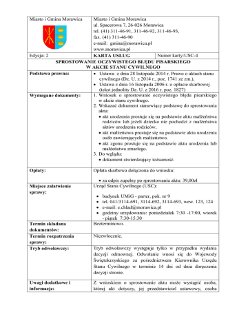 Miasto i Gmina Morawica Miasto i Gmina Morawica ul. Spacerowa 7, 26-026 Morawica tel. (41) 311-46-91, 311-46-92, 311-46-93, fax. (41) 311-46-90 e-mail: [email protected] www.morawica.pl Edycja: 2 Numer karty:USC-4 KARTA USŁUG SPROSTOWANIE OCZYWISTEGO BŁĘDU PISARSKIEGO W AKCIE STANU CYWILNEGO Podstawa prawna: Ustawa z dnia 28 listopada 2014 r. Prawo o aktach stanu cywilnego (Dz. U. z 2014 r., poz. 1741 ze zm.), Ustawa z dnia 16 listopada 2006 r. o opłacie skarbowej (tekst jednolity Dz. U. z 2016 r. poz. 1827) 1. Wniosek o sprostowanie oczywistego błędu pisarskiego Wymagane dokumenty: w akcie stanu cywilnego. 2. Wskazać dokument stanowiący podstawę do sprostowania aktu: akt urodzenia prostuje się na podstawie aktu małżeństwa rodziców lub jeżeli dziecko nie pochodzi z małżeństwa aktów urodzenia rodziców, akt małżeństwa prostuje się na podstawie aktu urodzenia osób zawierających małżeństwo. akt zgonu prostuje się na podstawie aktu urodzenia lub małżeństwa zmarłego. 3. Do wglądu: dokument stwierdzający tożsamość. Opłaty: Miejsce załatwienie sprawy: Termin składana dokumentów: Termin rozpatrzenia sprawy: Tryb odwoławczy: Uwagi dodatkowe i informacje: Opłata skarbowa dołączona do wniosku: za odpis zupełny po sprostowaniu aktu: 39,00zł Urząd Stanu Cywilnego (USC): budynek UMiG - parter, pok. nr 9 tel. 041/3114-691, 3114-692, 3114-693, wew. 123, 124 e-mail: [email protected] godziny urzędowania: poniedziałek 7:30 -17:00, wtorek - piątek 7:30-15:30 Bezterminowo. Niezwłocznie. Tryb odwoławczy występuje tylko w przypadku wydania decyzji odmownej. Odwołanie wnosi się do Wojewody Świętokrzyskiego za pośrednictwem Kierownika Urzędu Stanu Cywilnego w terminie 14 dni od dnia doręczenia decyzji stronie. Z wnioskiem o sprostowanie aktu może wystąpić osoba, której akt dotyczy, jej przedstawiciel ustawowy, osoba mająca w tym interes prawny lub prokurator. Sprostowanie błędu odbywa się w formie czynności materialnotechnicznej. Formularze wniosków i druki do pobrania: Załącznik nr 1 –Wniosek o sprostowanie błędu pisarskiego.