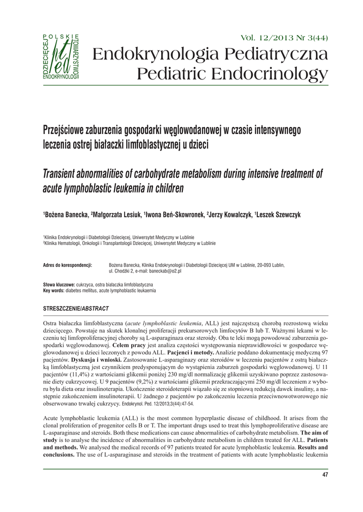 Banecka B. i inni: Przejściowe zaburzenia gospodarki węglowodanowej w czasie intensywnego leczenia ostrej białaczki limfoblastycznej u dzieci Vol. 12/2013 Nr 3(44) Endokrynologia Pediatryczna Pediatric Endocrinology Przejściowe zaburzenia gospodarki węglowodanowej w czasie intensywnego leczenia ostrej białaczki limfoblastycznej u dzieci Transient abnormalities of carbohydrate metabolism during intensive treatment of acute lymphoblastic leukemia in children Bożena Banecka, 2Małgorzata Lesiuk, 1Iwona Beń-Skowronek, 2Jerzy Kowalczyk, 1Leszek Szewczyk 1 Klinika Endokrynologii i Diabetologii Dziecięcej, Uniwersytet Medyczny w Lublinie Klinika Hematologii, Onkologii i Transplantologii Dziecięcej, Uniwersytet Medyczny w Lublinie 1 2 Adres do korespondencji: Bożena Banecka, Klinika Endokrynologii i Diabetologii Dziecięcej UM w Lublinie, 20-093 Lublin, ul. Chodźki 2, e-mail: [email protected] Słowa kluczowe: cukrzyca, ostra białaczka limfoblastyczna Key words: diabetes mellitus, acute lymphoblastic leukaemia STRESZCZENIE/ABSTRACT Ostra białaczka limfoblastyczna (acute lymphoblastic leukemia, ALL) jest najczęstszą chorobą rozrostową wieku dziecięcego. Powstaje na skutek klonalnej proliferacji prekursorowych limfocytów B lub T. Ważnymi lekami w leczeniu tej limfoproliferacyjnej choroby są L-asparaginaza oraz steroidy. Oba te leki mogą powodować zaburzenia gospodarki węglowodanowej. Celem pracy jest analiza częstości występowania nieprawidłowości w gospodarce węglowodanowej u dzieci leczonych z powodu ALL. Pacjenci i metody. Analizie poddano dokumentację medyczną 97 pacjentów. Dyskusja i wnioski. Zastosowanie L-asparaginazy oraz steroidów w leczeniu pacjentów z ostrą białaczką limfoblastyczną jest czynnikiem predysponującym do wystąpienia zaburzeń gospodarki węglowodanowej. U 11 pacjentów (11,4%) z wartościami glikemii poniżej 230 mg/dl normalizację glikemii uzyskiwano poprzez zastosowanie diety cukrzycowej. U 9 pacjentów (9,2%) z wartościami glikemii przekraczającymi 250 mg/dl leczeniem z wyboru była dieta oraz insulinoterapia. Ukończenie steroidoterapii wiązało się ze stopniową redukcją dawek insuliny, a następnie zakończeniem insulinoterapii. U żadnego z pacjentów po zakończeniu leczenia przeciwnowotworowego nie obserwowano trwałej cukrzycy. Endokrynol. Ped. 12/2013;3(44):47-54. Acute lymphoblastic leukemia (ALL) is the most common hyperplastic disease of childhood. It arises from the clonal proliferation of progenitor cells B or T. The important drugs used to treat this lymphoproliferative disease are L-asparaginase and steroids. Both these medications can cause abnormalities of carbohydrate metabolism. The aim of study is to analyse the incidence of abnormalities in carbohydrate metabolism in children treated for ALL. Patients and methods. We analysed the medical records of 97 patients treated for acute lymphoblastic leukemia. Results and conclusions. The use of L-asparaginase and steroids in the treatment of patients with acute lymphoblastic leukemia 47 Praca oryginalna Endokrynol. Ped., 12/2013;3(44):47-54 is a predisposing factor for abnormalities in carbohydrate metabolism. In 11 patients (11,4%) with glycaemia below 230 mg /dl, glucose normalization was achieved through the use of a diabetic diet. In 9 patients (9,2%) with glycaemia exceeding 250 mg /dl, the treatment of choice was diet and insulin. Completion of steroid therapy was associated with a gradual reduction in insulin dose and next cessation of the insulinotherapy. There was no permanent diabetes in any of the patients after cancer therapy. Pediatr. Endocrinol. 12/2013;3(44):47-54. Wstęp Ostra białaczka limfoblastyczna (acute lymphoblastic leukemia, ALL) jest najczęstszą chorobą rozrostową wieku dziecięcego. Powstaje na skutek klonalnej proliferacji prekursorowych limfocytów B lub T. Częstość występowania ALL wynosi około 4 nowych przypadków białaczki na 100 000 dzieci w wieku do 14 roku życia [1]. Leczenie ALL składa się z czterech etapów i trwa łącznie ok. 3 lat. Protokół leczenia chorych z ALL zależy od kwalifikacji do grup zaawansowania na podstawie objawów klinicznych, wyników badań diagnostycznych i reakcji na wstępne leczenie. W przypadku ALL u dzieci od roku 2002 w Europie stosowany jest protokół ALL-IC (trzy grupy ryzyka: SR – standard risk, ryzyko standardowe, IR – intermediate risk, ryzyko pośrednie, HR – high risk, wysokie ryzyko). Obecnie pacjenci z ostrą białaczką limfoblastyczną leczeni są według Programu ALLIC 2002, który składa się z trzech protokołów leczniczych: I, Mm i II [1–4]. I etap terapii to leczenie indukujące (indukcja remisji), mające na celu osiągnięcie prawidłowego stanu dziecka, prawidłowego mielogramu oraz obrazu krwi obwodowej i płynu mózgowo-rdzeniowego. Na tym etapie pełną remisję choroby uzyskuje się u 97–98% dzieci. Stosowane są: winkrystyna, antracykliny (dauno- lub doksorubicyna), L-asparaginaza, glikokortykosterydy (prednizon, deksametazon) oraz leczenie wspomagające, które obejmuje profilaktykę zakażeń, nefropatii moczanowej i leukostazy (w białaczkach hiperleukocytarnych) oraz podawanie koncentratu krwinek czerwonych przy niedokrwistości. II etap to leczenie konsolidujące (konsolidacja remisji), trwające kilka kolejnych miesięcy, w celu redukcji resztkowych komórek białaczkowych: cyklofosfamid, arabinozyd cytozyny, metotreksat podawany w dużych dawkach, 6-merkaptopuryna, 6-tioguanina. Ten etap kończy się tzw. reindukcją (powtórzeniem zestawu leków z I etapu). III etap to profilaktyka lub leczenie zajęcia OUN: duże dawki metotreksatu (do płynu mózgowo-rdzeniowego jako profilaktyka zajęcia ośrodko48 wego układu nerwowego) w monoterapii lub razem z arabinozydem cytozyny i prednizonem. IV etap to leczenie podtrzymujące: przez co najmniej 2 lata od rozpoznania ALL: 6-merkaptopuryna doustnie, metotreksat okresowo (najczęściej raz w tygo