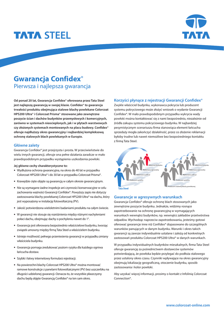 Gwarancja Confidex® Pierwsza i najlepsza gwarancja Od ponad 20 lat, Gwarancja Confidex® oferowana przez Tata Steel jest najlepszą gwarancją w swojej klasie. Confidex® to gwarancja trwałości produktu obejmująca stalowe blachy powlekane Colorcoat HPS200 Ultra® i Colorcoat Prisma® stosowane jako zewnętrzne poszycie ścian i dachów budynków przemysłowych i komercyjnych, zarówno w systemach nieocieplonych, jak i w płytach warstwowych czy złożonych systemach montowanych na placu budowy. Confidex® oferuje najdłuższy okres gwarancyjny i najbardziej kompleksową ochronę stalowych blach powlekanych w Europie. Korzyści płynące z rejestracji Gwarancji Confidex® Zwykle właściciel budynku, wykonawca pokrycia lub producent systemu pokryciowego może złożyć wniosek o wydanie Gwarancji Confidex®. W mało prawdopodobnym przypadku wykrycia wady powłoki można kontaktować się z nami bezpośrednio, niezależnie od źródła zakupu systemu pokryciowego budynku. W najbardziej pesymistycznym scenariuszu firma stanowiąca element łańcucha sprzedaży mogła zakończyć działalność, przez co złożenie reklamacji byłoby trudne lub nawet niemożliwe bez bezpośredniego kontaktu z firmą Tata Steel. Główne zalety Gwarancja Confidex® jest przejrzysta i prosta. W przeciwieństwie do wielu innych gwarancji, oferuje ona pełne działania zaradcze w mało prawdopodobnym przypadku wystąpienia uszkodzenia powłoki. Jej główne cechy charakterystyczne to: • Wydłużona ochrona gwarancyjna, na okres do 40 lat w przypadku Colorcoat HPS200 Ultra® i do 30 lat w przypadku Colorcoat Prisma®. • Krawędzie cięte objęte są gwarancją w całym okresie gwarancyjnym. • Nie są wymagane żadne inspekcje ani czynności konserwacyjne w celu zachowania ważności Gwarancji Confidex®. Powyższy zapis nie dotyczy zastosowania blachy powlekanej Colorcoat HPS200 Ultra® na dachu, który jest wyposażony w instalację fotowoltaiczną (PV). • Jakość potwierdzona wieloletnimi badaniami produktu na całym świecie. • W gwarancji nie stosuje się rozróżnienia między różnymi nachyleniami połaci dachu, obejmując dachy o pochyleniu nawet do 1°. • Gwarancja jest oferowana bezpośrednio właścicielowi budynku, tworząc związek umowny między firmą Tata Steel a właścicielem budynku. • Istnieje możliwość pełnego przeniesienia gwarancji w przypadku zmiany właściciela budynku. • Gwarancja pomaga zredukować poziom ryzyka dla każdego ogniwa łańcucha dostaw. • Szybki i łatwy internetowy formularz rejestracji. • Na powierzchni blachy Colorcoat HPS200 Ultra® można montować ramowe konstrukcje z panelami fotowoltaicznymi (PV) bez uszczerbku na długości udzielonej gwarancji. Oznacza to, że wszystkie płaszczyzny dachu będą objęte Gwarancją Confidex® na ten sam okres. Właściciel budynku Właściciel budynku Wykonawca generalny Wykonawca generalny Wykonawca pokryć Wykonawca pokryć Producent systemu Producent systemu Producent stalowej blachy powlekanej Gwarancje w agresywnych warunkach Gwarancja Confidex® oferuje ochronę blach stosowanych jako zewnętrzne poszycie budynku. Jednakże, widzimy rosnące zapotrzebowanie na ochronę gwarancyjną w wymagających warunkach wewnątrz budynków, np. wewnątrz zakładów przetwórstwa odpadów. Wychodząc naprzeciw zapotrzebowaniu, jesteśmy gotowi oferować gwarancje inne niż Confidex® dopasowane do szczególnych warunków panujących w danym budynku. Warunki i okres takich gwarancji są zawsze indywidualnie ustalane i zależą od konkretnych zastosowań produktu Colorcoat HPS200 Ultra® w danych warunkach. W przypadku indywidualnych budynków mieszkalnych, firma Tata Steel oferuje gwarancję za pośrednictwem dostawców systemów potwierdzającą, że powłoka będzie przylegać do podłoża stalowego przez ustalony okres czasu. Czynniki wpływające na okres gwarancyjny obejmują lokalizację geograficzną, otoczenie budynku, sposób zastosowania i kolor powłoki. Aby uzyskać więcej informacji, prosimy o kontakt z Infolinią Colorcoat Connection®. www.colorcoat-online.com Okresy Gwarancji Confidex® dla Strefy 1 i Strefy 2 Colorcoat HPS200 Ultra® Dach y Colorcoat Prisma® Dach y 40 30 lat Ścia ny lat Ścia ny lat lat lat 25 20 lat 30 25 lat lat lat 30 30 25 20 lat W głę Pas n adm ors Dach y W głę Pas n adm ors Dach y 30 20 20 lat Ścia ny lat lat 20 lat lat lat 25 20 20 15 lat lat bi lad u Pas n adm ors W głę lat bi lad u Pas n adm ors ki Kolory Signature Kolory Classic i Matt Strefy dostępności Gwarancji Confidex® 15 lat 25 20 lat W głę Strefa 2 lat 15 lat 30 30 ki 25 20 Strefa 2 lat lat lat bi lad u ki lat Ścia ny lat lat bi lad u Strefa 1 lat 30 25 40 40 lat 30 25 Strefa 1 lat ki Kolory jednolite i metaliczne Kolory matowe Uwagi 1. Liczby podane w rubryce „Pas Nadmorski” dotyczą budynków znajdujących się w odległości do 1 km od dowolnego wybrzeża morskiego. 2. Pełne warunki Gwarancji Confidex® przedstawiono w internetowym formularzu zgłoszeniowym dostępnym na stronie: www.colorcoat-online.com/registration 3. Niezbędnym warunkiem utrzymania ważności Gwarancji Confidex® jest jej zarejestrowanie w ciągu 3 miesięcy od daty ukończenia budynku. 4. Podane na powyższym schemacie okresy obowiązywania gwarancji Confidex® dotyczą Strefy 1 i Strefy 2. Więcej informacji na temat innych stref można uzyskać pod adresem www.colorcoat-online.com/confidexmap Objaśnienia Północna Europa – Strefa 1. Północna Europa – Strefa 2. W przypadku obszarów znajdujących się poza strefami Gwarancji Confidex® prosimy o kontakt z firmą Tata Steel w celu uzyskania dodatkowych informacji. www.colorcoat-online.com Tata Steel Ul. Piastowska 7 40-005 Katowice Polska T: +48 (0) 32 256 25 47 F: +48 (0) 32 256 25 48 Infolinia Colorcoat Connection® T: +48 (0) 58 627 46 52 E: [email protected] Registered Office: 30 Millbank London SW1P 4WY. Registered in England No. 2280000. Znaki handlow