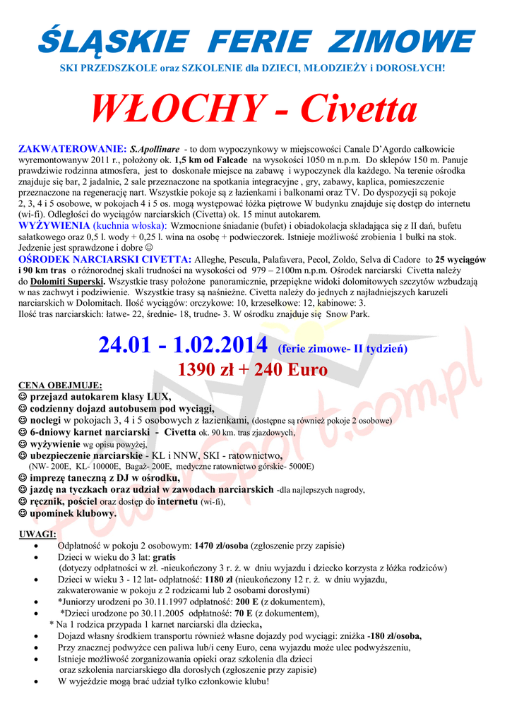 ŚLĄSKIE FERIE ZIMOWE SKI PRZEDSZKOLE oraz SZKOLENIE dla DZIECI, MŁODZIEŻY i DOROSŁYCH! WŁOCHY - Civetta ZAKWATEROWANIE: S.Apollinare - to dom wypoczynkowy w miejscowości Canale D’Agordo całkowicie wyremontowanyw 2011 r., położony ok. 1,5 km od Falcade na wysokości 1050 m n.p.m. Do sklepów 150 m. Panuje prawdziwie rodzinna atmosfera, jest to doskonałe miejsce na zabawę i wypoczynek dla każdego. Na terenie ośrodka znajduje się bar, 2 jadalnie, 2 sale przeznaczone na spotkania integracyjne , gry, zabawy, kaplica, pomieszczenie przeznaczone na regenerację nart. Wszystkie pokoje są z łazienkami i balkonami oraz TV. Do dyspozycji są pokoje 2, 3, 4 i 5 osobowe, w pokojach 4 i 5 os. mogą występować łóżka piętrowe W budynku znajduje się dostęp do internetu (wi-fi). Odległości do wyciągów narciarskich (Civetta) ok. 15 minut autokarem. WYŻYWIENIA (kuchnia włoska): Wzmocnione śniadanie (bufet) i obiadokolacja składająca się z II dań, bufetu sałatkowego oraz 0,5 l. wody + 0,25 l. wina na osobę + podwieczorek. Istnieje możliwość zrobienia 1 bułki na stok. Jedzenie jest sprawdzone i dobre OŚRODEK NARCIARSKI CIVETTA: Alleghe, Pescula, Palafavera, Pecol, Zoldo, Selva di Cadore to 25 wyciągów i 90 km tras o różnorodnej skali trudności na wysokości od 979 – 2100m n.p.m. Ośrodek narciarski Civetta należy do Dolomiti Superski. Wszystkie trasy położone panoramicznie, przepiękne widoki dolomitowych szczytów wzbudzają w nas zachwyt i podziwienie. Wszystkie trasy są naśnieżne. Civetta należy do jednych z najładniejszych karuzeli narciarskich w Dolomitach. Ilość wyciągów: orczykowe: 10, krzesełkowe: 12, kabinowe: 3. Ilość tras narciarskich: łatwe- 22, średnie- 18, trudne- 3. W ośrodku znajduje się Snow Park. 24.01 - 1.02.2014 (ferie zimowe- II tydzień) 1390 zł + 240 Euro CENA OBEJMUJE: przejazd autokarem klasy LUX, codzienny dojazd autobusem pod wyciągi, noclegi w pokojach 3, 4 i 5 osobowych z łazienkami, (dostępne są również pokoje 2 osobowe) 6-dniowy karnet narciarski - Civetta ok. 90 km. tras zjazdowych, wyżywienie wg opisu powyżej, ubezpieczenie narciarskie - KL i NNW, SKI - ratownictwo, (NW- 200E, KL- 10000E, Bagaż- 200E, medyczne ratownictwo górskie- 5000E) imprezę taneczną z DJ w ośrodku, jazdę na tyczkach oraz udział w zawodach narciarskich -dla najlepszych nagrody, ręcznik, pościel oraz dostęp do internetu (wi-fi), upominek klubowy. UWAGI: Odpłatność w pokoju 2 osobowym: 1470 zł/osoba (zgłoszenie przy zapisie) Dzieci w wieku do 3 lat: gratis (dotyczy odpłatności w zł. -nieukończony 3 r. ż. w dniu wyjazdu i dziecko korzysta z łóżka rodziców) Dzieci w wieku 3 - 12 lat- odpłatność: 1180 zł (nieukończony 12 r. ż. w dniu wyjazdu, zakwaterowanie w pokoju z 2 rodzicami lub 2 osobami dorosłymi) *Juniorzy urodzeni po 30.11.1997 odpłatność: 200 E (z dokumentem), *Dzieci urodzone po 30.11.2005 odpłatność: 70 E (z dokumentem), * Na 1 rodzica przypada 1 karnet narciarski dla dziecka, Dojazd własny środkiem transportu również własne dojazdy pod wyciągi: zniżka -180 zł/osoba, Przy znacznej podwyżce cen paliwa lub/i ceny Euro, cena wyjazdu może ulec podwyższeniu, Istnieje możliwość zorganizowania opieki oraz szkolenia dla dzieci oraz szkolenia narciarskiego dla dorosłych (zgłoszenie przy zapisie) W wyjeździe mogą brać udział tylko członkowie klubu! Dla dzieci i młodzieży obowiązkowe kaski! WPŁATY: I zaliczka: 500 zł/osoba -jak najszybciej II rata: reszta w złotówkach -do 15.12.2013r. III rata: Euro płatne w dniu wyjazdu Informacje i zapisy: Pałac Młodzieży w Katowicach -Klub Sportowego Reagowania „PowerSport” Paweł Nowojski +48 605-336-999 tel. kom. Witek Twardosz +48 609-500-519 tel. kom. e-mail: [email protected] www.powersport.com.pl OPIS SZKOLENIA i SKI PRZEDSZKOLA NARCIARSKIEGO W ramach szkolenia/opieki nad dziećmi i młodzieżą zapewniamy codzienne zajęcia narciarskie od rana do przerwy obiadowej. Będziemy realizowali program nauki i doskonalenia jazdy na nartach, w oparciu o formę zabawową jak również elementy formy sportowej. Planujemy szkolenie jazdy na tyczkach oraz zawody z nagrodami. Będziemy filmować na stoku postępy, a następnie wieczorem wspólnie je analizować. Chcemy dzieciom również wieczorami zapełnić czas grami i zabawami integracyjnymi oraz ciekawymi bajkami/filmami (będziemy mieli do dyspozycji rzutnik multimedialny) ZGŁOSZENIE PRZY ZAPISIE! SKI PRZEDSZKOLE i SZKOLENIE - BORMIO 2012