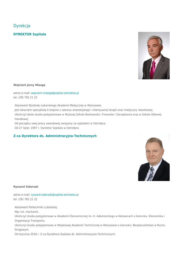 Dyrekcja DYREKTOR Szpitala Wojciech Jerzy Miazga adres e-mail: [email protected] tel. (29) 765 21 22 Absolwent Wydziału Lekarskiego Akademii Medycznej w Warszawie. Jest lekarzem specjalistą II stopnia z zakresu anestezjologii i intensywnej terapii oraz medycyny ratunkowej. Ukończył także studia podyplomowe w Wyższej Szkole Bankowości, Finansów i Zarządzania oraz w Szkole Głównej Handlowej. Od początku swej pracy zawodowej związany ze szpitalem w Ostrołęce. Od 27 lipiec 1997 r. Dyrektor Szpitala w Ostrołęce. Z-ca Dyrektora ds. Administracyjno-Technicznych Ryszard Sidorzak adres e-mail: [email protected] tel. (29) 765 21 22 Absolwent Politechniki Lubelskiej. Mgr inż. mechanik. Ukończył studia podyplomowe w Akademii Ekonomicznej im. K. Adamieckiego w Katowicach o kierunku: Ekonomika i Organizacja Transportu. Ukonczył studia podyplomowe w Wojskowej Akademii Technicznej w Warszawie o kierunku: Bezpieczeństwo w Ruchu Drogowym. Od stycznia 2016 r. Z-ca Dyrektora Szpitala ds. Administracyjno-Technicznych. ZASTĘPCA DYREKTORA ds. OPIEKI ZDROWOTNEJ Włodzimierz Kucharski tel. (29) 765 21 33, fax (29) 765 25 33 e–mail: [email protected] Absolwent Wydziału Lekarskiego Akademii Medycznej w Warszawie. Lekarz specjalista II stopnia z zakresu chirurgii ogólnej i chirurgii onkologicznej. Od 1984 r. związany ze Szpitalem w Ostrołęce. 1998 r. – specjalista wojewódzki ds. onkologii. 1998 r. - lekarz wojewódzki. Od 16.07.2004 r. Zastępca Dyrektora ds. Opieki Zdrowotnej. ZASTĘPCA DYREKTORA ds. PIELĘGNIARSTWA Bogusława Rentflejsz tel. (29) 765 21 25, fax (29) 765 25 33 e-mail: [email protected] Absolwentka Wydziału Pielęgniarskiego Śląskiej Akademii Medycznej im. L. Waryńskiego w Katowicach. Magister Pielęgniarstwa z II stopniem specjalizacji z Organizacji Ochrony Zdrowia i z I stopniem specjalizacji z Medycyny Społecznej. Od 1988r. Zastępca Naczelnej Pielęgniarki. Od 2000r. do lipca 2009r. Naczelna Pielęgniarka. Od 1 sierpnia 2009r. Zastępca Dyrektora ds. Pielęgniarstwa.