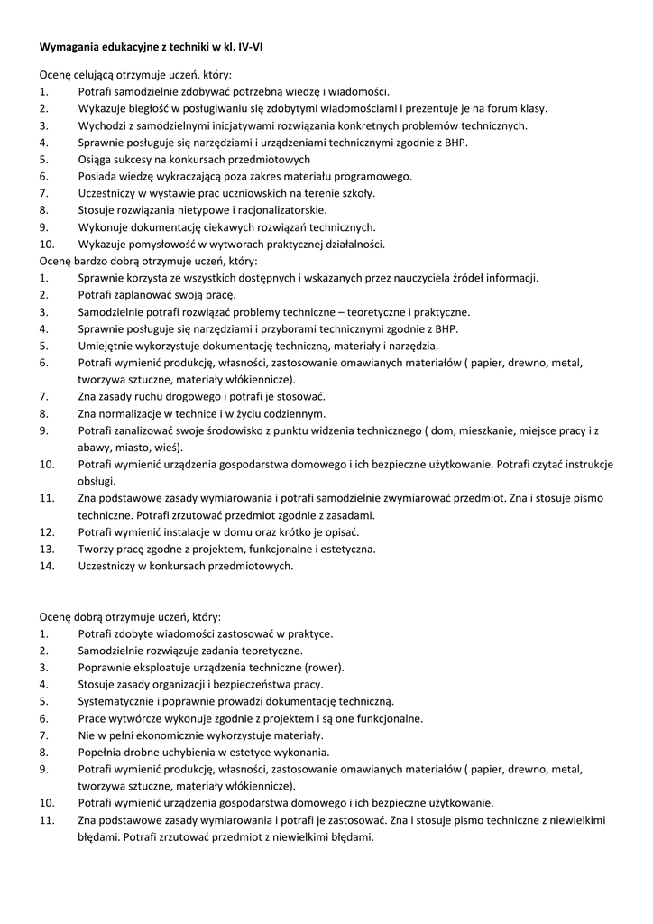 Wymagania edukacyjne z techniki w kl. IV-VI Ocenę celującą otrzymuje uczeń, który: 1. Potrafi samodzielnie zdobywać potrzebną wiedzę i wiadomości. 2. Wykazuje biegłość w posługiwaniu się zdobytymi wiadomościami i prezentuje je na forum klasy. 3. Wychodzi z samodzielnymi inicjatywami rozwiązania konkretnych problemów technicznych. 4. Sprawnie posługuje się narzędziami i urządzeniami technicznymi zgodnie z BHP. 5. Osiąga sukcesy na konkursach przedmiotowych 6. Posiada wiedzę wykraczającą poza zakres materiału programowego. 7. Uczestniczy w wystawie prac uczniowskich na terenie szkoły. 8. Stosuje rozwiązania nietypowe i racjonalizatorskie. 9. Wykonuje dokumentację ciekawych rozwiązań technicznych. 10. Wykazuje pomysłowość w wytworach praktycznej działalności. Ocenę bardzo dobrą otrzymuje uczeń, który: 1. Sprawnie korzysta ze wszystkich dostępnych i wskazanych przez nauczyciela źródeł informacji. 2. Potrafi zaplanować swoją pracę. 3. Samodzielnie potrafi rozwiązać problemy techniczne – teoretyczne i praktyczne. 4. Sprawnie posługuje się narzędziami i przyborami technicznymi zgodnie z BHP. 5. Umiejętnie wykorzystuje dokumentację techniczną, materiały i narzędzia. 6. Potrafi wymienić produkcję, własności, zastosowanie omawianych materiałów ( papier, drewno, metal, tworzywa sztuczne, materiały włókiennicze). 7. Zna zasady ruchu drogowego i potrafi je stosować. 8. Zna normalizacje w technice i w życiu codziennym. 9. Potrafi zanalizować swoje środowisko z punktu widzenia technicznego ( dom, mieszkanie, miejsce pracy i z abawy, miasto, wieś). 10. Potrafi wymienić urządzenia gospodarstwa domowego i ich bezpieczne użytkowanie. Potrafi czytać instrukcje obsługi. 11. Zna podstawowe zasady wymiarowania i potrafi samodzielnie zwymiarować przedmiot. Zna i stosuje pismo techniczne. Potrafi zrzutować przedmiot zgodnie z zasadami. 12. Potrafi wymienić instalacje w domu oraz krótko je opisać. 13. Tworzy pracę zgodne z projektem, funkcjonalne i estetyczna. 14. Uczestniczy w konkursach przedmiotowych. Ocenę dobrą otrzymuje uczeń, który: 1. Potrafi zdobyte wiadomości zastosować w praktyce. 2. Samodzielnie rozwiązuje zadania teoretyczne. 3. Poprawnie eksploatuje urządzenia techniczne (rower). 4. Stosuje zasady organizacji i bezpieczeństwa pracy. 5. Systematycznie i poprawnie prowadzi dokumentację techniczną. 6. Prace wytwórcze wykonuje zgodnie z projektem i są one funkcjonalne. 7. Nie w pełni ekonomicznie wykorzystuje materiały. 8. Popełnia drobne uchybienia w estetyce wykonania. 9. Potrafi wymienić produkcję, własności, zastosowanie omawianych materiałów ( papier, drewno, metal, tworzywa sztuczne, materiały włókiennicze). 10. Potrafi wymienić urządzenia gospodarstwa domowego i ich bezpieczne użytkowanie. 11. Zna podstawowe zasady wymiarowania i potrafi je zastosować. Zna i stosuje pismo techniczne z niewielkimi błędami. Potrafi zrzutować przedmiot z niewielkimi błędami. Ocenę dostateczną otrzymuje uczeń, który: 1. Opanował wiadomości na poziomie minimum, ale nie potrafi ich zastosować w praktyce. 2. Potrafi samodzielnie wykonać zadania o średnim stopniu trudności. 3. Potrafi rozróżniać podstawowe materiały, które zastosował w swojej pracy. 4. Prace wytwórcze wykonuje nieestetycznie, niedokładnie. 5. Poprawnie posługuje się przyrządami i narzędziami. 6. Mało efektywnie wykorzystuje czas pracy. 7. Dokumentację wykonuje nieestetycznie , z niewielkimi błędami. 8. Potrafi wymienić zastosowanie omawianych materiałów ( papier, drewno, metal, tworzywa sztuczne, materiały włókiennicze). 9. Zna przepisy ruchu drogowego dotyczące pieszego i rowerzysty. 10. Zna obowiązkowe wyposażenie roweru i jego ogólną budowę. 11. Potrafi prawidłowo wykonać podstawowe manewry na drodze. 12. Potrafi wymienić urządzenia gospodarstwa domowego i ich bezpieczne użytkowanie. Ocenę dopuszczającą otrzymuje uczeń, który: 1. Posługuje się podstawowymi narzędziami i przyrządami. 2. Wykonuje proste operacje technologiczne związane z obróbką materiałów papierniczych. 3. Ma trudności z samodzielnym zorganizowaniem swojego stanowiska pracy. 4. Przedstawia mało czytelną dokumentację pracy. 5. Wykonuje zadanie wytwórcze niedokładnie i nieestetycznie. 6. Nie zna zasad ruchu drogowego, nie opanował minimum wiedzy wymaganej do uzyskania karty rowerowej.