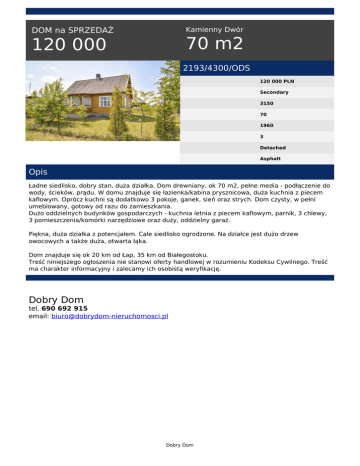 Kamienny Dwór DOM na SPRZEDAŻ 70 m2 120 000 2193/4300/ODS 120 000 PLN Secondary 3150 70 1960 3 Detached Asphalt Opis Ładne siedlisko, dobry stan, duża działka. Dom drewniany, ok 70 m2, pełne media - podłączenie do wody, ścieków, prądu. W domu znajduje się łazienka/kabina prysznicowa, duża kuchnia z piecem kaflowym. Oprócz kuchni są dodatkowo 3 pokoje, ganek, sień oraz strych. Dom czysty, w pełni umeblowany, gotowy od razu do zamieszkania. Dużo oddzielnych budynków gospodarczych - kuchnia letnia z piecem kaflowym, parnik, 3 chlewy, 3 pomieszczenia/komórki narzędziowe oraz duży, oddzielny garaż. Piękna, duża działka z potencjałem. Cale siedlisko ogrodzone. Na działce jest dużo drzew owocowych a także duża, otwarta łąka. Dom znajduje się ok 20 km od Łap, 35 km od Białegostoku. Treść niniejszego ogłoszenia nie stanowi oferty handlowej w rozumieniu Kodeksu Cywilnego. Treść ma charakter informacyjny i zalecamy ich osobistą weryfikację. Dobry Dom tel. 690 692 915 email: [email protected] Dobry Dom Powered by TCPDF (www.tcpdf.org)