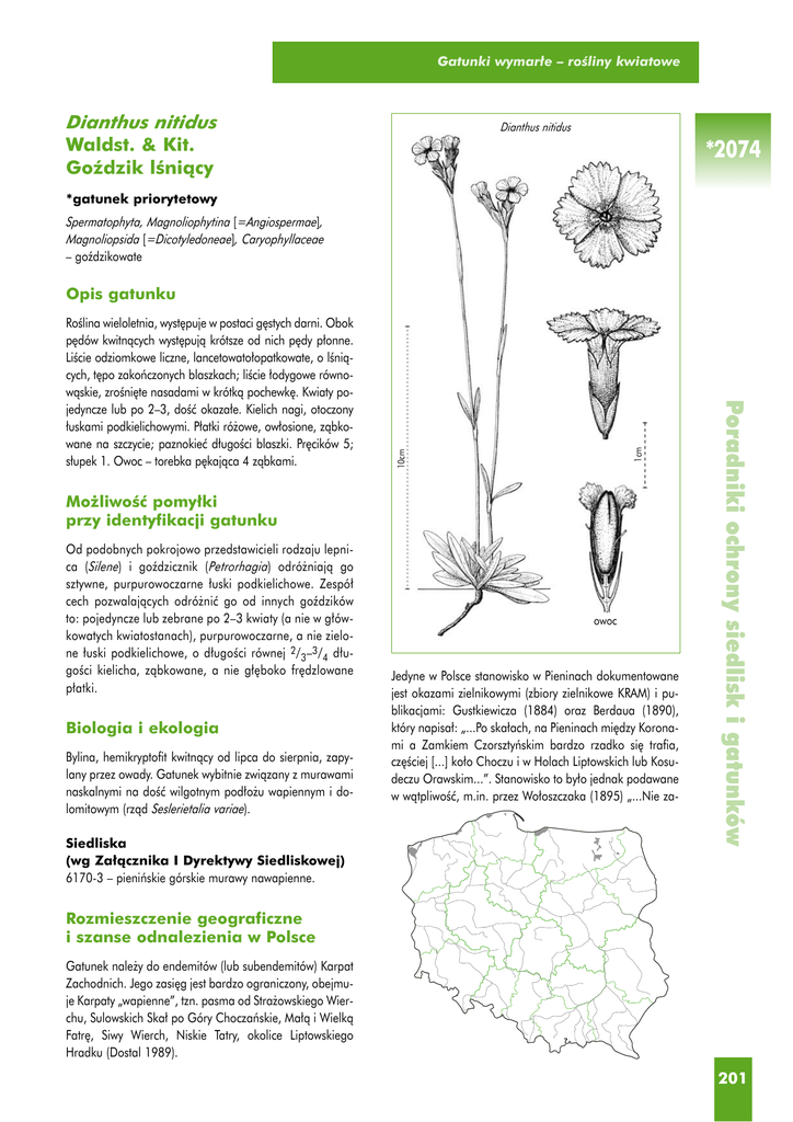 Gatunki wymar∏e – roÊliny kwiatowe Dianthus nitidus Waldst. & Kit. Goêdzik lÊniàcy Dianthus nitidus *2074 *gatunek priorytetowy Spermatophyta, Magnoliophytina [=Angiospermae], Magnoliopsida [=Dicotyledoneae], Caryophyllaceae – goêdzikowate 10cm Mo˝liwoÊç pomy∏ki przy identyfikacji gatunku Od podobnych pokrojowo przedstawicieli rodzaju lepnica (Silene) i goêdzicznik (Petrorhagia) odró˝niajà go sztywne, purpurowoczarne ∏uski podkielichowe. Zespó∏ cech pozwalajàcych odró˝niç go od innych goêdzików to: pojedyncze lub zebrane po 2–3 kwiaty (a nie w g∏ówkowatych kwiatostanach), purpurowoczarne, a nie zielone ∏uski podkielichowe, o d∏ugoÊci równej 2/3–3/4 d∏ugoÊci kielicha, zàbkowane, a nie g∏´boko fr´dzlowane p∏atki. Biologia i ekologia Bylina, hemikryptofit kwitnàcy od lipca do sierpnia, zapylany przez owady. Gatunek wybitnie zwiàzany z murawami naskalnymi na doÊç wilgotnym pod∏o˝u wapiennym i dolomitowym (rzàd Seslerietalia variae). Siedliska (wg Za∏àcznika I Dyrektywy Siedliskowej) 6170-3 – pieniƒskie górskie murawy nawapienne. owoc Jedyne w Polsce stanowisko w Pieninach dokumentowane jest okazami zielnikowymi (zbiory zielnikowe KRAM) i publikacjami: Gustkiewicza (1884) oraz Berdaua (1890), który napisa∏: „...Po ska∏ach, na Pieninach mi´dzy Koronami a Zamkiem Czorsztyƒskim bardzo rzadko si´ trafia, cz´Êciej [...] ko∏o Choczu i w Holach Liptowskich lub Kosudeczu Orawskim...”. Stanowisko to by∏o jednak podawane w wàtpliwoÊç, m.in. przez Wo∏oszczaka (1895) „...Nie za- Poradniki ochrony siedlisk i gatunków RoÊlina wieloletnia, wyst´puje w postaci g´stych darni. Obok p´dów kwitnàcych wyst´pujà krótsze od nich p´dy p∏onne. LiÊcie odziomkowe liczne, lancetowato∏opatkowate, o lÊniàcych, t´po zakoƒczonych blaszkach; liÊcie ∏odygowe równowàskie, zroÊni´te nasadami w krótkà pochewk´. Kwiaty pojedyncze lub po 2–3, doÊç okaza∏e. Kielich nagi, otoczony ∏uskami podkielichowymi. P∏atki ró˝owe, ow∏osione, zàbkowane na szczycie; paznokieç d∏ugoÊci blaszki. Pr´cików 5; s∏upek 1. Owoc – torebka p´kajàca 4 zàbkami. 1cm Opis gatunku Rozmieszczenie geograficzne i szanse odnalezienia w Polsce Gatunek nale˝y do endemitów (lub subendemitów) Karpat Zachodnich. Jego zasi´g jest bardzo ograniczony, obejmuje Karpaty „wapienne”, tzn. pasma od Stra˝owskiego Wierchu, Sulowskich Ska∏ po Góry Choczaƒskie, Ma∏à i Wielkà Fatr´, Siwy Wierch, Niskie Tatry, okolice Liptowskiego Hradku (Dostal 1989). 201 Gatunki roÊlin *2074 przeczam, ˝e roÊlina w Pieninach roÊnie, lecz podane stanowisko Berdaua nadzwyczaj niedok∏adne, bo od Czorsztyna po Kronenberg jest wielkie oddalenie...”. Zarzycki (2001) nie wyklucza, ˝e mog∏o dojÊç do pomylenia etykiet zielnikowych. Mimo poszukiwaƒ, gatunek od ponad 100 lat nie zosta∏ odnaleziony. Goêdzik lÊniàcy, o ile w ogóle tam wyst´powa∏, powinien byç uznany za wymar∏y, chocia˝ nale˝y podkreÊliç, ˝e odpowiadajàce mu siedliska istniejà w wy˝szych partiach Pienin. Problem wprowadzenia gatunku w Pieniny, z wykorzystaniem nasion spoza Pienin, wydaje si´ kontrowersyjny i raczej nie powinien byç brany pod uwag´. Poradniki ochrony siedlisk i gatunków Status gatunku 202 Prawo mi´dzynarodowe: Konwencja Berneƒska (1979) – nie uwzgl´dniono; Dyrektywa Siedliskowa (1992) – gatunek proponowany przez Polsk´ jako uzupe∏nienie do Za∏àcznika II DS, uzyska∏ akceptacj´ ekspertów Unii Europejskiej (Makomaska-Juchiewicz i in. 2001); w∏àczony na mocy Traktatu Akcesyjnego podpisanego w Atenach w 2003 r. Prawo krajowe: Ochrona gatunkowa – gdyby gatunek zosta∏ odnaleziony, podlega∏by ochronie prawnej. Kategorie IUCN: „Czerwona lista IUCN” (1996) – V; „Polska czerwona ksi´ga roÊlin” (Kaêmierczakowa, Zarzycki 2001) – EX. Bibliografia BERDAU F. 1890. Flora Tatr, Pienin i Beskidu Zachodniego. Flora of the Tatra Mts., Pieniny and Beskid Zachodni. Kasa im. J. Mianowskiego, Warszawa. DOSTAL J. 1989. Nová květena ČSSR 1. Academia. Praha. GUSTKIEWICZ B. 1894. Dodatek do flory pieniƒskiej. Spraw. Komis. Fizyogr. AU 29: 96–107. JASIEWICZ A. (red.) 1992. Flora Polski. RoÊliny naczyniowe. Tom 3. Instytut Botaniki im W. Szafera PAN, Kraków. KAèMIERCZAKOWA R., ZARZYCKI K. (red.) 2001. Polska czerwona ksi´ga roÊlin. Paprotniki i roÊliny kwiatowe. Polish red data book of plants. Pteridophytes and flowering plants. Instytut Botaniki im. W. Szafera PAN i Instytut Ochrony Przyrody PAN, Kraków. KMETOVÁ E. 1973. Rozširenie druhu Dianthus nitidus Waldst. et Kit. na Slovensku. W: Botanické prace (k 20. výročiu botanického výskumu v SAV). Botanický ústav SAV, Bratislava. MAKOMASKA-JUCHIEWICZ M., PERZANOWSKA J., ZAJÑC K. 2001. Dyrektywa Siedliskowa – wyst´pujàce w Polsce gatunki wa˝ne dla Wspólnoty Europejskiej. Chroƒmy Przyr. Ojcz. 57.2: 5–60. WO¸OSZCZAK E. 1895. Zapiski botaniczne z Karpat Sàdeckich. Spraw. Komis. Fizyogr. AU 30: 174–206. ZARZYCKI K. 2001. Dianthus nitidus Waldst. & Kit. Goêdzik lÊniàcy. W: Kaêmierczakowa R., Zarzycki K. (red.) Polska czerwona ksi´ga roÊlin. Paprotniki i roÊliny kwiatowe. Polish red data book of plants. Pteridophytes and flowering plants. Instytut Botaniki im. W. Szafera PAN i Instytut Ochrony Przyrody PAN, Kraków. Barbara Sudnik-Wójcikowska