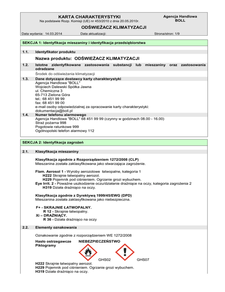 KARTA CHARAKTERYSTYKI Na podstawie Rozp. Komisji (UE) nr 453/2010 z dnia 20.05.2010r. Agencja Handlowa BOLL ODŚWIEŻACZ KLIMATYZACJI Data wydania: 14.03.2014 Data aktualizacji: Strona/stron: 1/9 SEKCJA 1: Identyfikacja mieszaniny i identyfikacja przedsiębiorstwa 1.1. Identyfikator produktu Nazwa produktu: ODŚWIEŻACZ KLIMATYZACJI 1.2. 1.3. 1.4. Istotne zidentyfikowane zastosowania substancji lub mieszaniny odradzane Środek do odświeżania klimatyzacji Dane dotyczące dostawcy karty charakterystyki Agencja Handlowa "BOLL" Wojciech Dalewski Spółka Jawna ul. Chemiczna 3 65-713 Zielona Góra tel.: 68 451 99 99 fax: 68 451 99 00 e-mail osoby odpowiedzialnej za opracowanie karty charakterystyki: [email protected] Numer telefonu alarmowego Agencja Handlowa "BOLL" 68 451 99 99 (czynny w godzinach 08.00 - 16.00) Straż pożarna 998 Pogotowie ratunkowe 999 Ogólnopolski telefon alarmowy 112 oraz zastosowania SEKCJA 2: Identyfikacja zagrożeń 2.1. Klasyfikacja mieszaniny Klasyfikacja zgodnie z Rozporządzeniem 1272/2008 (CLP) Mieszanina została zaklasyfikowana jako stwarzająca zagrożenie. Flam. Aerosol 1 - Wyroby aerozolowe łatwopalne, kategoria 1 H222 Skrajnie łatwopalny aerozol. H229 Pojemnik pod ciśnieniem. Ogrzanie grozi wybuchem. Eye Irrit. 2 - Poważne uszkodzenie oczu/działanie drażniące na oczy, kategoria zagrożenia 2 H319 Działa drażniąco na oczy. Klasyfikacja zgodnie z Dyrektywą 1999/45/EWG (DPD) Mieszanina została zaklasyfikowana jako niebezpieczna. F+ - SKRAJNIE ŁATWOPALNY. R 12 - Skrajnie łatwopalny. Xi – DRAŻNIĄCY. R 36 - Działa drażniąco na oczy 2.2. Elementy oznakowania Oznakowanie zgodnie z rozporządzeniem WE 1272/2008 Hasło ostrzegawcze Piktogramy NIEBEZPIECZEŃSTWO GHS02 GHS07 H222 Skrajnie łatwopalny aerozol. H229 Pojemnik pod ciśnieniem. Ogrzanie grozi wybuchem. H319 Działa drażniąco na oczy. Agencja Handlowa BOLL KARTA CHARAKTERYSTYKI Na podstawie Rozp. Komisji (UE) nr 453/2010 z dnia 20.05.2010r. ODŚWIEŻACZ KLIMATYZACJI Data wydania: 14.03.2014 Data aktualizacji: Strona/stron: 2/9 Zwroty wskazujące środki ostrożności Ogólne P102 Chronić przed dziećmi. Zapobieganie P210 Przechowywać z dala od źródeł ciepła, gorących powierzchni, źródeł iskrzenia, otwartego ognia i innych źródeł zapłonu. Nie palić. P280 Stosować rękawice ochronne/odzież ochronną/ochronę oczu/ochronę twarzy. P264 Dokładnie umyć ręce po użyciu. Reagowanie P305 + P351+ P338 W PRZYPADKU DOSTANIA SIĘ DO OCZU: Ostrożnie płukać wodą przez kilka minut. Wyjąć soczewki kontaktowe, jeżeli są i można je łatwo usunąć. Nadal płukać. P337 + P313 W przypadku utrzymywania się działania drażniącego na oczy: Zasięgnąć porady/zgłosić się pod opiekę lekarza. Przechowywanie P403 Przechowywać w dobrze wentylowanym miejscu. Usuwanie Brak Informacje uzupełniające Zawartość detergentów zgodnie z rozporządzeniem 648/2004/WE: Węglowodory alifatyczne 5-15% fosforany < 5% środki powierzchniowo-czynne < 5% Kompozycja zapachowa (amylu cinnamal) Pojemnik pod ciśnieniem: chronić przed słońcem i nagrzaniem powyżej temperatury 50oC. Nie przekuwać ani nie spalać, także po zużyciu. Nie rozpylać nad otwartym płomieniem lub żarzącym się materiałem. Nie przechowywać w pobliżu źródeł zapłonu – nie palić tytoniu. Chronić przed dziećmi. 2.3. Inne zagrożenia Wyrób aerozolowy. Produkt nie zawiera składników spełniających kryteria PBT lub vPvB. SEKCJA 3: Skład/informacja o składnikach 3.2. Mieszaniny Charakter chemiczny: mieszanina aktywnych składników z propelentem. Gaz wypychający – propan- butan. Nazwa substancji Identyfikator Klasyfikacja 67/548/EWG Klasyfikacja 1272/2008 % wag butan [zawiera <0,1% buta-1,3-dienu (WE 203-450-8)] Indeks 601-004-00-0 CAS 106-97-8 WE 203-448-7 Nr rejestr. 01-2119474691-32 F+; R12 Flam. Gas 1 Press. Gas H220 H280 3 - <10 propan Indeks 601-003-00-5 CAS 74-98-6 WE 200-827-9 Nr rejestr. 01-2119486944-21 F+; R12 Flam. Gas 1 Press. Gas H220 1 - <2,5 1-metoksypropan-2-ol Indeks 603-064-00-3 CAS 107-98-2 WE 203-539-1 Nr rejestr. R10 R67 Flam. Liq. 3 STOT SE 3 H226 H336 3 - <10 KARTA CHARAKTERYSTYKI Na podstawie Rozp. Komisji (UE) nr 453/2010 z dnia 20.05.2010r. Agencja Handlowa BOLL ODŚWIEŻACZ KLIMATYZACJI Data wydania: 14.03.2014 Data aktualizacji: Strona/stron: 3/9 01-2119457435-35 pirofosforan tetrapotasu Indeks --CAS 7320-34-5 WE 230-785-7 Xi; R36 Eye Irrit. 2 H319 1 - <2,5 eter polietylenowego glikolu dodecylowego [Laureth-8] Indeks --CAS 9002-92-0 WE --- Xi; R41 N; R50 Eye Dam. 1 Aquatic Acute 1 H318 H400 1 - <2,5 amoniak, roztwór ... % Indeks 007-001-01-2 CAS 1336-21-6 WE 215-647-6 C; R34 N; R50 Skin Corr. 1B Aquatic Acute 1 H314 H400 0,1-<0,3 Pełne znaczenie zwrotów zagrożenia R i H ujęto w sekcji 16 SEKCJA 4: Środki pierwszej pomocy 4.1. 4.2. 4.3. Opis środków pierwszej pomocy Drogi narażenia: Drogi oddechowe, drogi pokarmowe, kontakt ze skórą, kontakt z oczami. Następstwa wdychania: • Wyprowadzić poszkodowana osobę na świeże powietrze. Ułożyć w wygodnej pozycji. Zapewnić ciepło i spokój. • W razie potrzeby zapewnić pomoc lekarską. Następstwa połknięcia: • Przepłukać usta wodą, dać do wypicia 2-3 szklanki wody, skontaktować się z lekarzem. Nie wywoływać wymiotów. Osobie nieprzytomnej nie podawać niczego do połknięcia. • W razie potrzeby przetransportować do szpitala. Choremu zapewnić spokój, leżenie i ciepło. Kontakt z oczami: • Usunąć szkła kontaktowe. Przemyć zanieczyszczone oczy większą ilością letniej wody przez 10 minut, przy wywiniętych powiekach. Co pewien czas nakładać górną na dolną powiekę. Oczy osłonić kompresem. • W razie potrzeby zapewnić pomoc okulisty. Kontakt ze skórą: • Zdjąć zanieczyszczone ubranie i buty. Oczyścić zanieczyszczoną skórę, przemyć dużą ilością wody a następnie wodą z łagodnym mydłem. • W przypadku gdy podrażnienie skóry nie przemija, skonsultować 