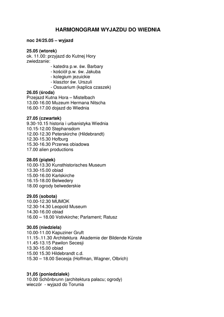 HARMONOGRAM WYJAZDU DO WIEDNIA noc 24/25.05 – wyjazd 25.05 (wtorek) ok. 11.00: przyjazd do Kutnej Hory zwiedzanie: - katedra p.w. św. Barbary - kościół p.w. św. Jakuba - kolegium jezuickie - klasztor św. Urszuli - Ossuarium (kaplica czaszek) 26.05 (środa) Przejazd Kutna Hora – Mistelbach 13.00-16.00 Muzeum Hermana Nitscha 16.00-17.00 dojazd do Wiednia 27.05 (czwartek) 9.30-10.15 historia i urbanistyka Wiednia 10.15-12.00 Stephansdom 12.00-12.30 Peterskirche (Hildebrandt) 12.30-15.30 Hofburg 15.30-16.30 Przerwa obiadowa 17.00 alien productions 28.05 (piątek) 10.00-13.30 Kunsthistorisches Museum 13.30-15.00 obiad 15.00-16.00 Karlskirche 16.15-18.00 Belwedery 18.00 ogrody belwederskie 29.05 (sobota) 10.00-12.30 MUMOK 12.30-14.30 Leopold Museum 14.30-16.00 obiad 16.00 – 18.00 Votivkirche; Parlament; Ratusz 30.05 (niedziela) 10.00-11.00 Kapuziner Gruft 11.15-.11.30 Architektura Akademie der Bildende Künste 11.45-13.15 Pawilon Secesji 13.30-15.00 obiad 15.00 15.30 Hildebrandt c.d. 15.30 – 18.00 Secesja (Hoffman, Wagner, Olbrich) 31,05 (poniedziałek) 10.00 Schönbrunn (architektura pałacu; ogrody) wieczór - wyjazd do Torunia Tematy referatów 1. Historia i urbanistyka Kutnej Hory; Ossuarium (kaplica czaszek) 2. Kolegium jezuickie i klasztor św. Urszuli w Kutnej Horze 3. katedra p.w. św Barbary i kościół p.w. św. Jakuba w Kutnej Horze 4. Historia miasta od zarania dziejów oraz urbanistyka Wiednia 5. Stephansdom architektura 6. Stephansdom wyposażenie i nagrobki 7. Hofburg - architektura 8. Hofburg – Burgkapelle, Augustinerkirche (były Hofkirche) – architektura, wyposażenie z akcentem na nagrobek autorstwa Canovy 9. Hofburg – Hofbibliothek, charakterystyczne cechy twórczości Johanna Bernharda Fischera von Erlach 10. Historia kolekcji Kunsthistorisches Museum 11. Karlskirche (architektura i malarstwo) 12. Belwedery – (architektura i ogrody + historia kolekcji) 13. Votivkirche – architektura, wyposażenie 14. Neostyle w Wiedniu (architektura budynków Parlamentu, Ratusza, ASP [Akademie der Bildenden Künste]) także Ring 15. Kunsthistorisches Museum (architektura, malarstwo ścienne), Naturhistorisches Museum (jako pendant do KHM) 16. Pawilon Secesji i twórczość Olbricha 17. Secesja- twórczość Wagnera [Pavillon na Karlsplatz in; Majolikahaus (Linken Wienzeile 40); Kamienica (Linke Wienzeile 38); Hof Pavillion] 18. Twórczość architektoniczna Hoffmana [ willa Skywa Primavesi (Gloriettestrasse 18); Ast Residence; Dom dla Richarda Beer-Hofmanna oraz twórczość Adolpha Loosa (z zaznaczeniem jego poglądów teoretycznych – ornament jako przestępstwo) 19. Johann Lucas Hildebrandt (kościół p.w. św. Piotra; kościół Pijarów; pałac Daun-Kinsky) 20. Egon Schiele; Wiener Werkstätte – cechy charakterystyczne, poblemy twórczości (Leopold Museum) 21. Gustaw Klimt; Oskar Kokoschka – cechy charakterystyczne, problemy twórczości (Leopold Museum) 22. Hans Makart - cechy charakterystyczne, problemy twórczości (wygłaszanie w Kunsthistorisches Museum) 23. Schönbrunn architektura 24. Schönbrunn ogrody i architektura ogrodowa