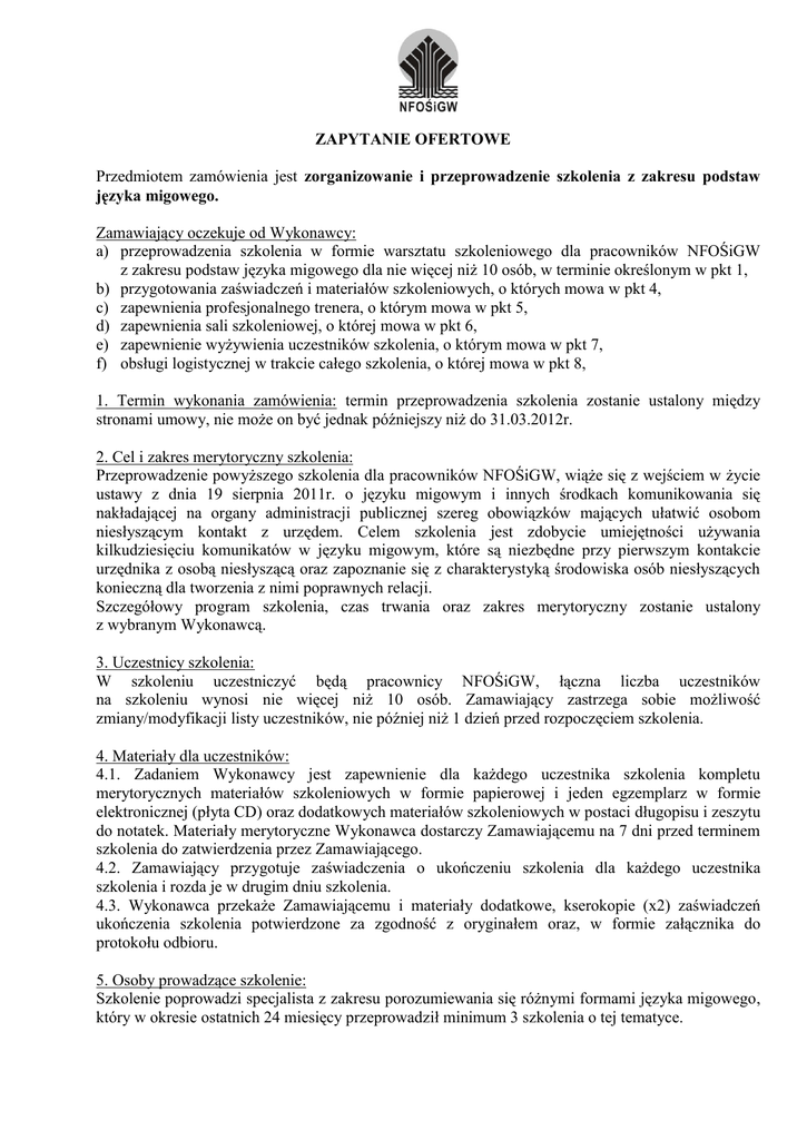 ZAPYTANIE OFERTOWE Przedmiotem zamówienia jest zorganizowanie i przeprowadzenie szkolenia z zakresu podstaw języka migowego. Zamawiający oczekuje od Wykonawcy: a) przeprowadzenia szkolenia w formie warsztatu szkoleniowego dla pracowników NFOŚiGW z zakresu podstaw języka migowego dla nie więcej niż 10 osób, w terminie określonym w pkt 1, b) przygotowania zaświadczeń i materiałów szkoleniowych, o których mowa w pkt 4, c) zapewnienia profesjonalnego trenera, o którym mowa w pkt 5, d) zapewnienia sali szkoleniowej, o której mowa w pkt 6, e) zapewnienie wyżywienia uczestników szkolenia, o którym mowa w pkt 7, f) obsługi logistycznej w trakcie całego szkolenia, o której mowa w pkt 8, 1. Termin wykonania zamówienia: termin przeprowadzenia szkolenia zostanie ustalony między stronami umowy, nie może on być jednak późniejszy niż do 31.03.2012r. 2. Cel i zakres merytoryczny szkolenia: Przeprowadzenie powyższego szkolenia dla pracowników NFOŚiGW, wiąże się z wejściem w życie ustawy z dnia 19 sierpnia 2011r. o języku migowym i innych środkach komunikowania się nakładającej na organy administracji publicznej szereg obowiązków mających ułatwić osobom niesłyszącym kontakt z urzędem. Celem szkolenia jest zdobycie umiejętności używania kilkudziesięciu komunikatów w języku migowym, które są niezbędne przy pierwszym kontakcie urzędnika z osobą niesłyszącą oraz zapoznanie się z charakterystyką środowiska osób niesłyszących konieczną dla tworzenia z nimi poprawnych relacji. Szczegółowy program szkolenia, czas trwania oraz zakres merytoryczny zostanie ustalony z wybranym Wykonawcą. 3. Uczestnicy szkolenia: W szkoleniu uczestniczyć będą pracownicy NFOŚiGW, łączna liczba uczestników na szkoleniu wynosi nie więcej niż 10 osób. Zamawiający zastrzega sobie możliwość zmiany/modyfikacji listy uczestników, nie później niż 1 dzień przed rozpoczęciem szkolenia. 4. Materiały dla uczestników: 4.1. Zadaniem Wykonawcy jest zapewnienie dla każdego uczestnika szkolenia kompletu merytorycznych materiałów szkoleniowych w formie papierowej i jeden egzemplarz w formie elektronicznej (płyta CD) oraz dodatkowych materiałów szkoleniowych w postaci długopisu i zeszytu do notatek. Materiały merytoryczne Wykonawca dostarczy Zamawiającemu na 7 dni przed terminem szkolenia do zatwierdzenia przez Zamawiającego. 4.2. Zamawiający przygotuje zaświadczenia o ukończeniu szkolenia dla każdego uczestnika szkolenia i rozda je w drugim dniu szkolenia. 4.3. Wykonawca przekaże Zamawiającemu i materiały dodatkowe, kserokopie (x2) zaświadczeń ukończenia szkolenia potwierdzone za zgodność z oryginałem oraz, w formie załącznika do protokołu odbioru. 5. Osoby prowadzące szkolenie: Szkolenie poprowadzi specjalista z zakresu porozumiewania się różnymi formami języka migowego, który w okresie ostatnich 24 miesięcy przeprowadził minimum 3 szkolenia o tej tematyce. 6. Miejsce realizacji przedmiotu zamówienia: Wszystkie szkolenia odbywać się będą w Warszawie w miejscu, do którego można dogodnie dojechać korzystając z transportu publicznego. Wykonawca zapewni salę szkoleniową wyposażoną w urządzenia i zasoby niezbędne do realizacji przedmiotu zamówienia z uwzględnieniem ergonomicznych, bezpiecznych i higienicznych warunków pracy i nauki. Propozycja miejsca szkolenia winna zostać przekazana do Zamawiającego, na co najmniej 7 dni przed terminem jego rozpoczęcia. W terminie 2 dni od otrzymania propozycji miejsca szkolenia, Wykonawca zostanie powiadomiony o jej akceptacji lub braku akceptacji. 7. Wyżywienie uczestników szkolenia: Wykonawca zapewni uczestnikom szkolenia obiad składający się z dwóch dań i deseru, z możliwością wyboru wersji wegetariańskiej oraz przerwy kawowe składające się z kawy, herbaty, słodyczy (ciasta, ciasteczka, cukierki), mleka, cukru, cytryny, soków, wody i owoców (banany, jabłka, mandarynki, itp.). Wykonawca zapewni dostęp do poczęstunku składającego się na przerwę kawową, w ciągu całego czasu trwania szkolenia. 8. Obsługa logistyczna szkolenia. Wykonawca zapewni opiekuna grupy, który będzie sprawował nadzór nad realizacją zamówienia oraz dbał o wysoki poziom obsługi uczestników szkolenia. 9. Protokół odbioru szkolenia. Po zakończeniu szkolenia Wykonawca przygotuje protokół odbioru szkolenia zawierający następujące załączniki: - oryginały list obecności, - komplet materiałów zawierający materiały merytoryczne w formie papierowej oraz jeden egzemplarz w formie elektronicznej (płyta CD), w celu zamieszczenia na dysku kadrowym w formacie PDF w/w materiałów przez okres jednego miesiąca po zakończeniu szkolenia, wyłącznie do celów edukacyjnych pracowników Zamawiającego z zastrzeżeniem zakazu ich rozpowszechniania i kopiowania, - kserokopie (x2) zaświadczeń ukończenia szkolenia potwierdzone za zgodność z oryginałem, - zdjęcia ze szkolenia. Płatność za szkolenie nastąpi po podpisaniu przez Zamawiającego protokołu odbioru szkolenia na podstawie prawidłowo wystawionej przez Wykonawcę faktury. 10. Cena szkolenia zawiera koszty: - zorganizowanie i przeprowadzenie szkolenia z zakresu podstaw języka migowego - materiały merytoryczne i dodatkowe dla każdego uczestnika, jeden egzemplarz materiałów dla Zamawiającego, - zaświadczenia ukończenia szkolenia dla każdego uczestnika oraz ich kserokopie (x2), potwierdzone za zgodność z oryginałem, - wynajęcia sali szkoleniowej (2 dni), - wyżywienia uczestników szkolenia oraz trenera i opiekuna grupy, - wynagrodzenia dla trenera za prowadzenie szkolenia (2 dni), - wynagrodzenie dla opiekuna grupy (2 dni), oraz inne koszty związane z organizacją tego szkolenia. Rozliczenie szkolenia nastąpi po zakończeniu szkolenia, na podstawie rzeczywistej liczby uczestników szkolenia, potwierdzonej ich podpisami na listach obecności, jednak nie mniejszej niż 8 osób. Zamawiający 