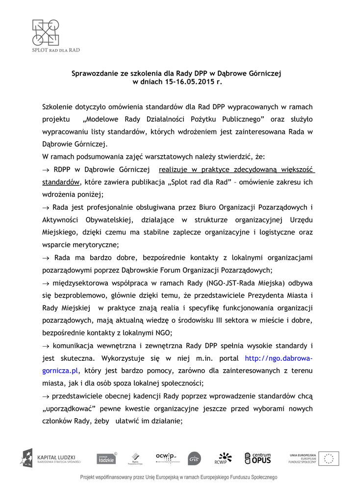 Sprawozdanie ze szkolenia dla Rady DPP w Dąbrowe Górniczej w dniach 15-16.05.2015 r. Szkolenie dotyczyło omówienia standardów dla Rad DPP wypracowanych w ramach projektu „Modelowe Rady Działalności Pożytku Publicznego” oraz służyło wypracowaniu listy standardów, których wdrożeniem jest zainteresowana Rada w Dąbrowie Górniczej. W ramach podsumowania zajęć warsztatowych należy stwierdzić, że: → RDPP w Dąbrowie Górniczej realizuje w praktyce zdecydowaną większość standardów, które zawiera publikacja „Splot rad dla Rad” – omówienie zakresu ich wdrożenia poniżej; → Rada jest profesjonalnie obsługiwana przez Biuro Organizacji Pozarządowych i Aktywności Obywatelskiej, działające w strukturze organizacyjnej Urzędu Miejskiego, dzięki czemu ma stabilne zaplecze organizacyjne i logistyczne oraz wsparcie merytoryczne; → Rada ma bardzo dobre, bezpośrednie kontakty z lokalnymi organizacjami pozarządowymi poprzez Dąbrowskie Forum Organizacji Pozarządowych; → międzysektorowa współpraca w ramach Rady (NGO-JST-Rada Miejska) odbywa się bezproblemowo, głównie dzięki temu, że przedstawiciele Prezydenta Miasta i Rady Miejskiej w praktyce znają realia i specyfikę funkcjonowania organizacji pozarządowych, mają aktualną wiedzę o środowisku III sektora w mieście i dobre, bezpośrednie kontakty z lokalnymi NGO; → komunikacja wewnętrzna i zewnętrzna Rady DPP spełnia wysokie standardy i jest skuteczna. Wykorzystuje się w niej m.in. portal http://ngo.dabrowagornicza.pl, który jest bardzo pomocy, zarówno dla zainteresowanych z terenu miasta, jak i dla osób spoza lokalnej społeczności; → przedstawiciele obecnej kadencji Rady poprzez wprowadzenie standardów chcą „uporządkować” pewne kwestie organizacyjne jeszcze przed wyborami nowych członków Rady, żeby ułatwić im działanie; → pewne rozwiązania, które w praktyce stosuje Rada mogą stanowić uzupełnienie listy proponowanych w „Splot rad dla Rad” i mogą być rekomendowane do wdrożenie w innych radach (opis poniżej); W oparciu o ustalenia z uczestnikami rekomendowane dla Rady poniższe działania: KWESTIE ISTOTNE I PILNE Działanie wg. standardów: Komentarz: Oddzielenie Regulaminu rady od Uchwały o jej powołaniu To standard, który rekomenduje publikacja „Slot rad dla Rad”: Regulamin rady powinien być oddzielony od uchwały o trybie powoływania rady i podstawowych warunków trybu pracy. W tym celu członkowie Rady: 1) przeanalizują obecny Regulaminie pod kątem zalecanych przez ekspertów zapisów i zawartości (m.in. zadania osób funkcyjnych, informacja o możliwości udziału w posiedzeniach osób spoza rady, opis obiegu informacji, zakres obsługi administracyjnej itp.) 2) przeanalizują Regulamin w kontekście spójności z zapisami w rocznym programie współpracy JST-NGO i innych dokumentach strategicznych np. Strategii Rozwiązywania Problemów Społecz.; 3) skonsultują planowane zmiany Regulaminie Rady z lokalnymi NGO, przede wszystkim w ramach Dąbrowskim FOP; 4) przedstawią propozycję nowego (uzupełnionego) Regulaminu członkom nowej kadencji rady i oni podejmą ostatecznie decyzję; 5) zwrócą się do Prezydentowi miasta z wnioskiem do o akceptację tych zmian poprzez zmianę stosownego Zarządzenia; 6) zarekomendują własny „Regulaminu opiniowania przez Radę Działalności Pożytku Publicznego Miasta Dąbrowa Górnicza uchwał i aktów prawa miejscowego” jako zalecany standard dla innych rad; Standardy komunikacji wewnętrznej i zewnętrznej: Komunikacja wewnętrzna i zewnętrzna działa w praktyce bardzo dobrze, ale można sformalizować (opisać) m.in. dla nowej rady pewne kwestie np. zakres obsługi w tym zakresie ze strony Biura OP i AO, obowiązki i dobre praktyki ze strony członków Rady (potwierdzanie obecności, usprawiedliwianie itp.), sposób obiegu informacji i powiadamiania itp. Standardy ewaluacji: W tym celu członkowie Rady: 1) wypełnią Indeks samooceny (załącznik do Splot rad dla Rad) i omówią wspólnie wyniki tej analizy na możliwie najbliższym spotkaniu Rady; 2) opracują listę wskaźników efektywności (podmurowania pracy rady) na wzór wskaźników oceniających realizację rocznych programów współpracy 3) opracują sprawozdania z kadencji wg. tych wskaźników Przygotowanie „procedury” wyboru przedstawicieli NGO do Rady Procedura taka w praktyce jest, bo przedstawiciele lokalnych organizacji są wybierani do rady w ramach FOP, ale trzeba ją „wyodrębnić” i upublicznić na stronie ngo.dabrowa-gornicza.pl, w tym: kwestie zgłaszania i prezentacji kandydatów, głosowania na nich itp. KWESTIE ISTOTNE ALE MNIEJ PILNE (np. w ramach nowej kadencji RDPP) Działanie wg. standardów: Komentarz: Standard tworzenia rad: Opracowanie Planu Pracy Rady na 2016 Standard edukacji: Opracowanie programu szkoleń dla nowych członków Rad i pakietu „minimum now-how” To standard obligatoryjny, który powinien obejmować: 1) analizę dokumentów strategicznych, 2) konsultacje z NGO 3) uzgodnienie z JST i Radą Miejską Plan może mieć charakter ramowy, ale uwzględniający stałe (powtarzające) się działania rady jak: praca nad rocznym programem współpracy, zaangażowanie w otwarte konkursy ofert itp. Plan będzie musiał być aktualizowany i uzupełniany o bieżące (trudne na początku roku do przewidzenia) działania Rady. Plan pracy powinien być dostępny na stronie ngo.dabrowagornicza.pl 1) przygotowanie przez Biuro i obecną Radę zawartości pakietu startowego dla każdego członka RDPP (konieczne materiały na USB m.in.: Regulamin rady, standardy działania rady, standardy współpracy, roczny program współpracy, kompendium wiedzy i NGO i JST itp.) 2) opracowanie programu i przeprowadzenie szkoleń dla członków rady (min. 2 dni, najlepiej w formie wyjazdowej, żeby oderwać członków Rady od obowiązków służbowych) 3) opracowanie programu i zaplanowanie szkoleń uaktualniając