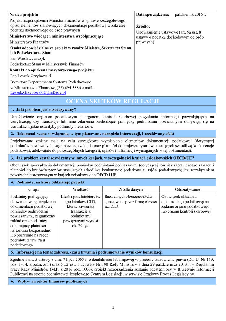 Nazwa projektu Projekt rozporządzenia Ministra Finansów w sprawie szczegółowego opisu elementów stanowiących dokumentację podatkową w zakresie podatku dochodowego od osób prawnych Ministerstwo wiodące i ministerstwa współpracujące Ministerstwo Finansów Osoba odpowiedzialna za projekt w randze Ministra, Sekretarza Stanu lub Podsekretarza Stanu Pan Wiesław Janczyk Podsekretarz Stanu w Ministerstwie Finansów Kontakt do opiekuna merytorycznego projektu Pan Leszek Grzybowski Dyrektora Departamentu Systemu Podatkowego w Ministerstwie Finansów, (22) 694-3886 e-mail: [email protected] Data sporządzenia: październik 2016 r. Źródło: Upoważnienie ustawowe (art. 9a ust. 8 ustawy o podatku dochodowym od osób prawnych) OCENA SKUTKÓW REGULACJI 1. Jaki problem jest rozwiązywany? Umożliwienie organom podatkowym i organom kontroli skarbowej pozyskania informacji pozwalających na weryfikację, czy transakcje lub inne zdarzenia zachodzące pomiędzy podmiotami powiązanymi odbywają się na warunkach, jakie ustaliłyby podmioty niezależne. 2. Rekomendowane rozwiązanie, w tym planowane narzędzia interwencji, i oczekiwany efekt Projektowane zmiany mają na celu szczegółowe wymienienie elementów dokumentacji podatkowej (dotyczącej podmiotów powiązanych, zagranicznego zakładu oraz płatności do krajów/terytoriów stosujących szkodliwą konkurencję podatkową), adekwatnie do poszczególnych kategorii, opisów i informacji wymaganych w tej dokumentacji. 3. Jak problem został rozwiązany w innych krajach, w szczególności krajach członkowskich OECD/UE? Obowiązek sporządzania dokumentacji pomiędzy podmiotami powiązanymi (dotyczącej również zagranicznego zakładu i płatności do krajów/terytoriów stosujących szkodliwą konkurencję podatkową tj. rajów podatkowych) jest rozwiązaniem powszechnie stosowanym w krajach członkowskich OECD i UE. 4. Podmioty, na które oddziałuje projekt Grupa Podatnicy podlegający obowiązkowi sporządzania dokumentacji podatkowej pomiędzy podmiotami powiązanymi, zagraniczny zakład oraz podatnicy dokonujący płatności należności bezpośrednio lub pośrednio na rzecz podmiotu z tzw. raju podatkowego Wielkość Źródło danych Liczba przedsiębiorców Baza danych Amadeus/Orbis – (podatników CIT), opracowana przez firmę Bureau którzy zawierają van Dijk transakcje z podmiotami powiązanymi wynosi ok. 20 tys. Oddziaływanie Obowiązek składania dokumentacji podatkowej na żądanie organu podatkowego lub organu kontroli skarbowej 5. Informacje na temat zakresu, czasu trwania i podsumowanie wyników konsultacji Zgodnie z art. 5 ustawy z dnia 7 lipca 2005 r. o działalności lobbingowej w procesie stanowienia prawa (Dz. U. Nr 169, poz. 1414, z późn. zm.) oraz § 52 ust. 1 uchwały Nr 190 Rady Ministrów z dnia 29 października 2013 r. – Regulamin pracy Rady Ministrów (M.P. z 2016 poz. 1006), projekt rozporządzenia zostanie udostępniony w Biuletynie Informacji Publicznej na stronie podmiotowej Rządowego Centrum Legislacji, w serwisie Rządowy Proces Legislacyjny. 6. Wpływ na sektor finansów publicznych 1 Dodatkowe informacje, w tym wskazanie źródeł danych i przyjętych do obliczeń założeń Projekt nie powoduje zwiększenia dochodów lub zmniejszenia wydatków jednostek sektora finansów publicznych, w tym budżetu państwa i budżetów jednostek samorządu terytorialnego, w stosunku do wielkości wynikających z obowiązujących przepisów. 7. Wpływ na konkurencyjność gospodarki i przedsiębiorczość, w tym funkcjonowanie przedsiębiorców oraz na rodzinę, obywateli i gospodarstwa domowe Dodatkowe informacje, w tym wskazanie źródeł danych i przyjętych do obliczeń założeń Zasada stosowania cen rynkowych przez podmioty powiązane, zagraniczne zakłady oraz w zakresie płatności dokonywanych do tzw. rajów podatkowych, o której mowa w art. 11 ustawy o podatku dochodowym od osób prawnych oraz obowiązek dokumentacyjny z tym związany, zapewnia porównywalność warunków transakcji lub innych zdarzeń dotyczących tych podatników z warunkami transakcji zawieranych między podmiotami niezależnymi. 8. Zmiana obciążeń regulacyjnych (w tym obowiązków informacyjnych) wynikających z projektu nie dotyczy Wprowadzane są obciążenia poza bezwzględnie wymaganymi przez UE (szczegóły w odwróconej tabeli zgodności). zmniejszenie liczby dokumentów zmniejszenie liczby procedur skrócenie czasu na załatwienie sprawy inne: tak nie nie dotyczy zwiększenie liczby dokumentów zwiększenie liczby procedur wydłużenie czasu na załatwienie sprawy inne: Wprowadzane obciążenia są przystosowane do ich elektronizacji. tak nie nie dotyczy Komentarz: Projekt nie zmienia obciążeń regulacyjnych – przepisy rozporządzenia mają na celu szczegółowe wymienienie elementów dokumentacji podatkowej adekwatnie do poszczególnych kategorii, opisów i informacji wymaganych w tej dokumentacji. 9. Wpływ na rynek pracy Brak wpływu na rynek pracy. 10. Wpływ na pozostałe obszary środowisko naturalne sytuacja i rozwój regionalny inne: Omówienie wpływu demografia mienie państwowe informatyzacja zdrowie Rozporządzenie nie wpływa na ww. obszary. 11. Planowane wykonanie przepisów aktu prawnego Planuje się, że rozporządzenie będzie obowiązywać od dnia 1 stycznia 2017 r. 12. W jaki sposób i kiedy nastąpi ewaluacja efektów projektu oraz jakie mierniki zostaną zastosowane? W zakresie obowiązku dokumentacyjnego podmiotów powiązanych ewaluacja nastąpi po 3 latach od wejścia w życie – na podstawie sprawozdań sporządzonych przez organy podatkowe, dotyczących kontroli rzetelności deklarowanych podstaw opodatkowania u podmiotów powiązanych (w tym zawierające liczbę kontroli zakończonych doszacowaniem w podziale na różne podstawy prawne szacowania, efekt procedur wzajemnego porozumiewania się pomiędzy administracjami różnych jurysdykcji podatkowych dotyczących unikania podwójnego