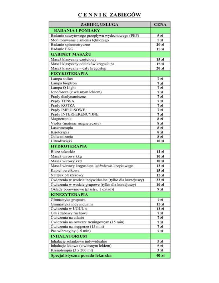 C E N N I K ZABIEGÓW ZABIEG, USŁUGA BADANIA I POMIARY Badanie szczytowego przepływu wydechowego (PEF) Monitorowanie ciśnienia tętniczego Badanie spirometryczne Badanie EKG CENA 5 zł 5 zł 20 zł 15 zł GABINET MASAśU MasaŜ klasyczny częściowy MasaŜ klasyczny odcinków kręgosłupa MasaŜ klasyczny – cały kręgosłup 15 zł 15 zł 20 zł FIZYKOTERAPIA Lampa sollux Lampa bioptron Lampa Q Light Jonoforeza (z własnym lekiem) Prądy diadynamiczne Prądy TENSA Prądy KOTZA Prądy IMPULSOWE Prądy INTERFERENCYJNE Magnetronic Viofor (materac magnetyczny) Laseroterapia Krioterapia Galwanizacja Ultradźwięki 7 zł 7 zł 7 zł 7 zł 7 zł 7 zł 7 zł 7 zł 7 zł 8 zł 8 zł 8 zł 8 zł 8 zł 10 zł HYDROTERAPIA Bicze szkockie MasaŜ wirowy kkg MasaŜ wirowy kkd MasaŜ wirowy kręgosłupa lędźwiowo-krzyŜowego Kąpiel perełkowa Natrysk płaszczowy Ćwiczenia w wodzie indywidualne (tylko dla kuracjuszy) Ćwiczenia w wodzie grupowe (tylko dla kuracjuszy) Okłady borowinowe (plastry, 1 okład)) 12 zł 10 zł 10 zł 12 zł 15 zł 15 zł 22 zł 10 zł 9 zł KINEZYTERAPIA Gimnastyka grupowa Gimnastyka indywidualna Ćwiczenia w UGUL-u Gry i zabawy ruchowe Ćwiczenia na atlasie Ćwiczenia na rowerze treningowym (15 min) Ćwiczenia na stepperze (15 min) Pas wibracyjny (15 min) 7 zł 15 zł 12 zł 7 zł 7 zł 7 zł 7 zł 7 zł INHALATORIUM Inhalacje solankowe indywidualne Inhalacje lekowe (z własnym lekiem) Krenoterapia (3 x 200 ml) 5 zł 5 zł 3 zł Specjalistyczna porada lekarska 40 zł C E N N I K ZABIEGÓW ZABIEG, USŁUGA BADANIA I POMIARY Badanie szczytowego przepływu wydechowego (PEF) Monitorowanie ciśnienia tętniczego Badanie spirometryczne Badanie EKG CENA 5 zł 5 zł 20 zł 15 zł GABINET MASAśU MasaŜ klasyczny częściowy MasaŜ klasyczny odcinków kręgosłupa MasaŜ klasyczny – cały kręgosłup 15 zł 15 zł 20 zł FIZYKOTERAPIA Lampa sollux Lampa bioptron Lampa Q Light Jonoforeza (z własnym lekiem) Prądy diadynamiczne Prądy TENSA Prądy KOTZA Prądy IMPULSOWE Prądy INTERFERENCYJNE Magnetronic Viofor (materac magnetyczny) Laseroterapia Krioterapia Galwanizacja Ultradźwięki 7 zł 7 zł 7 zł 7 zł 7 zł 7 zł 7 zł 7 zł 7 zł 8 zł 8 zł 8 zł 8 zł 8 zł 10 zł HYDROTERAPIA Bicze szkockie MasaŜ wirowy kkg MasaŜ wirowy kkd MasaŜ wirowy kręgosłupa lędźwiowo-krzyŜowego Kąpiel perełkowa Natrysk płaszczowy Ćwiczenia w wodzie indywidualne (tylko dla kuracjuszy) Ćwiczenia w wodzie grupowe (tylko dla kuracjuszy) Okłady borowinowe (plastry, 1 okład)) 12 zł 10 zł 10 zł 12 zł 15 zł 15 zł 22 zł 10 zł 9 zł KINEZYTERAPIA Gimnastyka grupowa Gimnastyka indywidualna Ćwiczenia w UGUL-u Gry i zabawy ruchowe Ćwiczenia na atlasie Ćwiczenia na rowerze treningowym (15 min) Ćwiczenia na stepperze (15 min) Pas wibracyjny (15 min) 7 zł 15 zł 12 zł 7 zł 7 zł 7 zł 7 zł 7 zł INHALATORIUM Inhalacje solankowe indywidualne Inhalacje lekowe (z własnym lekiem) Krenoterapia (3 x 200 ml) 5 zł 5 zł 3 zł Specjalistyczna porada lekarska 40 zł