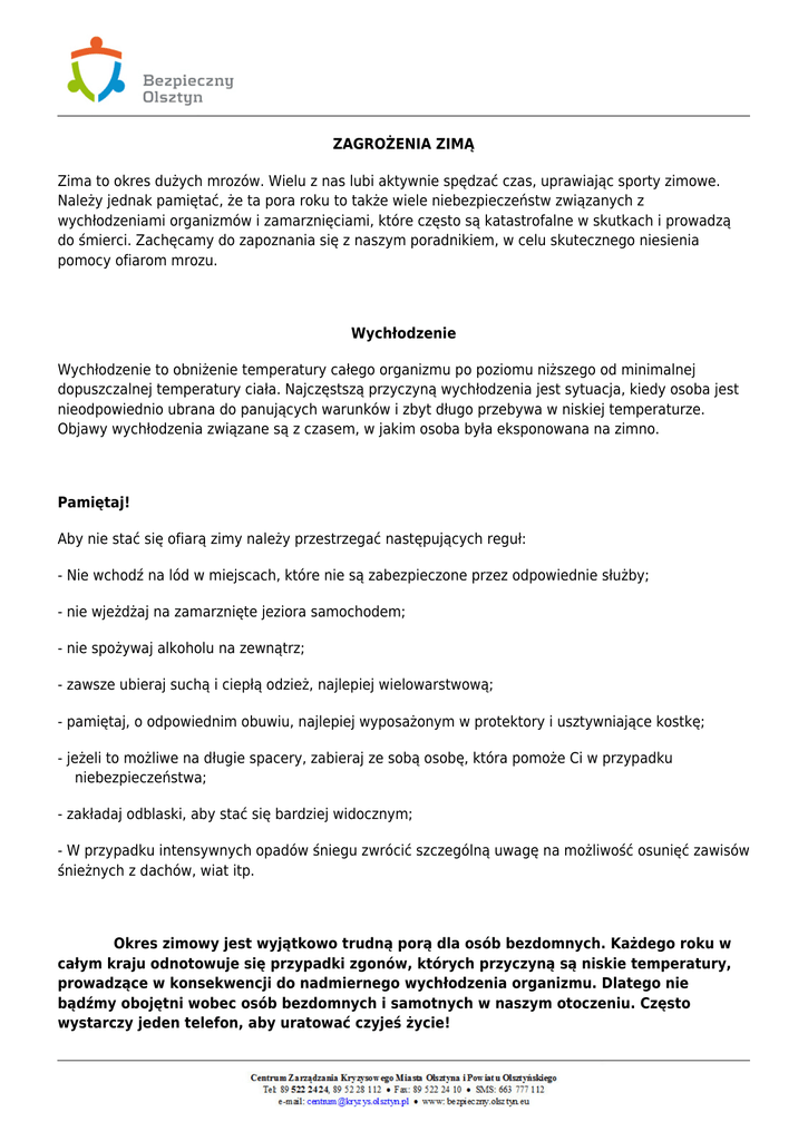 ZAGROŻENIA ZIMĄ Zima to okres dużych mrozów. Wielu z nas lubi aktywnie spędzać czas, uprawiając sporty zimowe. Należy jednak pamiętać, że ta pora roku to także wiele niebezpieczeństw związanych z wychłodzeniami organizmów i zamarznięciami, które często są katastrofalne w skutkach i prowadzą do śmierci. Zachęcamy do zapoznania się z naszym poradnikiem, w celu skutecznego niesienia pomocy ofiarom mrozu. Wychłodzenie Wychłodzenie to obniżenie temperatury całego organizmu po poziomu niższego od minimalnej dopuszczalnej temperatury ciała. Najczęstszą przyczyną wychłodzenia jest sytuacja, kiedy osoba jest nieodpowiednio ubrana do panujących warunków i zbyt długo przebywa w niskiej temperaturze. Objawy wychłodzenia związane są z czasem, w jakim osoba była eksponowana na zimno. Pamiętaj! Aby nie stać się ofiarą zimy należy przestrzegać następujących reguł: - Nie wchodź na lód w miejscach, które nie są zabezpieczone przez odpowiednie służby; - nie wjeżdżaj na zamarznięte jeziora samochodem; - nie spożywaj alkoholu na zewnątrz; - zawsze ubieraj suchą i ciepłą odzież, najlepiej wielowarstwową; - pamiętaj, o odpowiednim obuwiu, najlepiej wyposażonym w protektory i usztywniające kostkę; - jeżeli to możliwe na długie spacery, zabieraj ze sobą osobę, która pomoże Ci w przypadku niebezpieczeństwa; - zakładaj odblaski, aby stać się bardziej widocznym; - W przypadku intensywnych opadów śniegu zwrócić szczególną uwagę na możliwość osunięć zawisów śnieżnych z dachów, wiat itp. Okres zimowy jest wyjątkowo trudną porą dla osób bezdomnych. Każdego roku w całym kraju odnotowuje się przypadki zgonów, których przyczyną są niskie temperatury, prowadzące w konsekwencji do nadmiernego wychłodzenia organizmu. Dlatego nie bądźmy obojętni wobec osób bezdomnych i samotnych w naszym otoczeniu. Często wystarczy jeden telefon, aby uratować czyjeś życie! W sytuacjach zagrożenia zadzwoń po pomoc 997- Policja 986-Straż Miejska 999- Pogotowie Ratunkowe 112- Służby Ratownicze 89 522-81-12 Dyżurny Miasta Postępowanie ratunkowe 1. Zabezpieczyć poszkodowanego przed dalszym spadkiem temperatury! Najlepiej przenieść do pomieszczenia, w którym panuje niska temperatura pokojowa, jeżeli jest to nie możliwe postaraj się odizolować ofiarę od zimnego podłoża. 1. Jeśli jest nieprzytomny, nie oddycha i nie da się wyczuć tętna – należy jak najszybciej wezwać pogotowie ratunkowe i przystąpić do akcji resuscytacyjnej. 1. Jeśli jest nieprzytomny, ale ma zachowany oddech i tętno, należy zdjąć z niego mokrą odzież, okryć suchymi kocami i ułożyć w pozycji bocznej bezpiecznej. Trzeba wezwać pogotowie ratunkowe i monitorować stan poszkodowanego. UWAGA! W żadnym wypadku nie wolno go zanurzać w gorącej wodzie! 1. Gdy wychłodzona osoba jest przytomna, można jej podać gorący słodki napój (dostarczy szybko przyswajalnych kalorii i rozgrzeje „od środka”). Opracował: Damian Pachałko