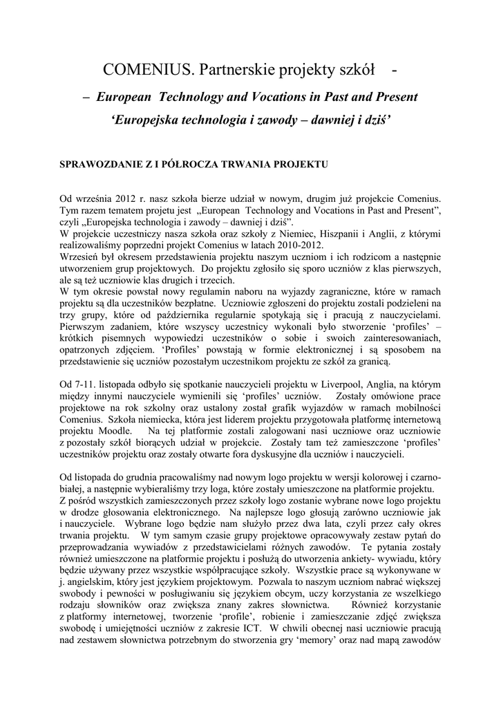 COMENIUS. Partnerskie projekty szkół - – European Technology and Vocations in Past and Present ‘Europejska technologia i zawody – dawniej i dziś’ SPRAWOZDANIE Z I PÓŁROCZA TRWANIA PROJEKTU Od września 2012 r. nasz szkoła bierze udział w nowym, drugim już projekcie Comenius. Tym razem tematem projetu jest „European Technology and Vocations in Past and Present”, czyli „Europejska technologia i zawody – dawniej i dziś”. W projekcie uczestniczy nasza szkoła oraz szkoły z Niemiec, Hiszpanii i Anglii, z którymi realizowaliśmy poprzedni projekt Comenius w latach 2010-2012. Wrzesień był okresem przedstawienia projektu naszym uczniom i ich rodzicom a następnie utworzeniem grup projektowych. Do projektu zgłosiło się sporo uczniów z klas pierwszych, ale są też uczniowie klas drugich i trzecich. W tym okresie powstał nowy regulamin naboru na wyjazdy zagraniczne, które w ramach projektu są dla uczestników bezpłatne. Uczniowie zgłoszeni do projektu zostali podzieleni na trzy grupy, które od października regularnie spotykają się i pracują z nauczycielami. Pierwszym zadaniem, które wszyscy uczestnicy wykonali było stworzenie ‘profiles’ – krótkich pisemnych wypowiedzi uczestników o sobie i swoich zainteresowaniach, opatrzonych zdjęciem. ‘Profiles’ powstają w formie elektronicznej i są sposobem na przedstawienie się uczniów pozostałym uczestnikom projektu ze szkół za granicą. Od 7-11. listopada odbyło się spotkanie nauczycieli projektu w Liverpool, Anglia, na którym między innymi nauczyciele wymienili się ‘profiles’ uczniów. Zostały omówione prace projektowe na rok szkolny oraz ustalony został grafik wyjazdów w ramach mobilności Comenius. Szkoła niemiecka, która jest liderem projektu przygotowała platformę internetową projektu Moodle. Na tej platformie zostali zalogowani nasi uczniowe oraz uczniowie z pozostały szkół biorących udział w projekcie. Zostały tam też zamieszczone ‘profiles’ uczestników projektu oraz zostały otwarte fora dyskusyjne dla uczniów i nauczycieli. Od listopada do grudnia pracowaliśmy nad nowym logo projektu w wersji kolorowej i czarnobiałej, a następnie wybieraliśmy trzy loga, które zostały umieszczone na platformie projektu. Z pośród wszystkich zamieszczonych przez szkoły logo zostanie wybrane nowe logo projektu w drodze głosowania elektronicznego. Na najlepsze logo głosują zarówno uczniowie jak i nauczyciele. Wybrane logo będzie nam służyło przez dwa lata, czyli przez cały okres trwania projektu. W tym samym czasie grupy projektowe opracowywały zestaw pytań do przeprowadzania wywiadów z przedstawicielami różnych zawodów. Te pytania zostały również umieszczone na platformie projektu i posłużą do utworzenia ankiety- wywiadu, który będzie używany przez wszystkie współpracujące szkoły. Wszystkie prace są wykonywane w j. angielskim, który jest językiem projektowym. Pozwala to naszym uczniom nabrać większej swobody i pewności w posługiwaniu się językiem obcym, uczy korzystania ze wszelkiego rodzaju słowników oraz zwiększa znany zakres słownictwa. Również korzystanie z platformy internetowej, tworzenie ‘profile’, robienie i zamieszczanie zdjęć zwiększa swobodę i umiejętności uczniów z zakresie ICT. W chwili obecnej nasi uczniowie pracują nad zestawem słownictwa potrzebnym do stworzenia gry ‘memory’ oraz nad mapą zawodów w naszym kraju. W niedługim czasie zostanie również wywieszona lista najbardziej aktywnych uczestników projektu, którzy wezmą udział w pierwszej mobilności zaplanowanej na ten rok szkolny, czyli wyjadą spotkać się z kolegami i koleżankami ze szkoły w Navarcles, Hiszpania.