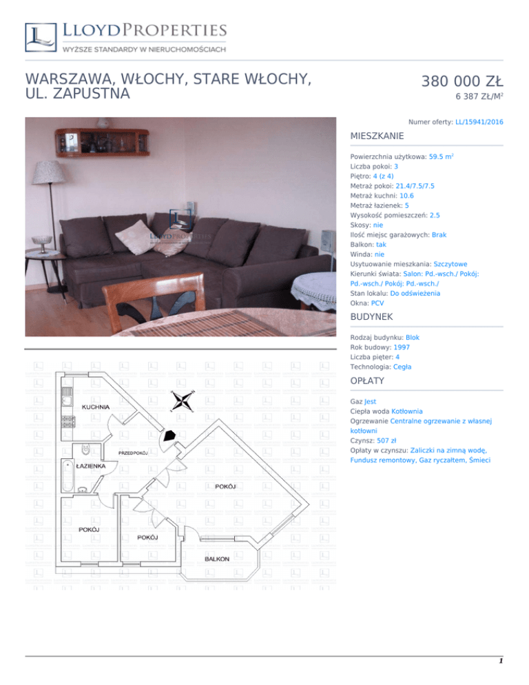 WARSZAWA, WŁOCHY, STARE WŁOCHY, UL. ZAPUSTNA 380 000 ZŁ 6 387 ZŁ/M2 Numer oferty: LL/15941/2016 MIESZKANIE Powierzchnia użytkowa: 59.5 m2 Liczba pokoi: 3 Piętro: 4 (z 4) Metraż pokoi: 21.4/7.5/7.5 Metraż kuchni: 10.6 Metraż łazienek: 5 Wysokość pomieszczeń: 2.5 Skosy: nie Ilość miejsc garażowych: Brak Balkon: tak Winda: nie Usytuowanie mieszkania: Szczytowe Kierunki świata: Salon: Pd.-wsch./ Pokój: Pd.-wsch./ Pokój: Pd.-wsch./ Stan lokalu: Do odświeżenia Okna: PCV BUDYNEK Rodzaj budynku: Blok Rok budowy: 1997 Liczba pięter: 4 Technologia: Cegła OPŁATY Gaz Jest Ciepła woda Kotłownia Ogrzewanie Centralne ogrzewanie z własnej kotłowni Czynsz: 507 zł Opłaty w czynszu: Zaliczki na zimną wodę, Fundusz remontowy, Gaz ryczałtem, Śmieci 1 Hanna Ćwikła Senior Property Advisor +48 533 340 327 [email protected] OPIS To rozkładowe mieszkanie o pow. 59,5 / 64 m2, składa się z 3 pokoi, oddzielnej, widnej kuchni, łazienki z WC oraz przestronnego przedpokoju, który posiada szafy w zabudowie. Ustawny salon (21,4 m2) zwrócony jest na południowy wschód, a jego przestrzeń powiększa dodatkowo balkon (ok. 5 m2). Kuchnia (10,6 m2) odrębna, widna z ekspozycję zachodnią. Dwie ustawne sypialnie (4m2 /8m2) skierowane na północny wschód . Łazienka (5m2) wykończona glazurą i terakotą posiada wannę i toaletę. W salonie i pokoju zostały położone deski Berlineckie, w trzecim pokoju zastaniemy mozaikę w kuchni i przedpokoju (10m2) na podłogę położono gres. Mieszkanie wymaga jedynie odświeżenia. Do mieszkania przynależy wyjątkowo duża piwnica (5,5 m2). Stan prawny: spółdzielcze własnościowe. Na terenie osiedla znajduje się sporo ogólnodostępnych miejsc parkingowych i miejsc spacerowych. W pobliżu znajduje się przystanek autobusowy. W bezpośredniej okolicy są osiedlowe sklepiki, punkty usługowo-handlowe, kościół, przedszkole, szkoła, plac zabaw. Lokalizacja z tak doskonałą infrastrukturą i komunikacją sprawia, że codzienne życie w tej części Włoch jest przyjemne i wygodne Kameralny budynek z 1997 r. z cegły (bez windy), położony jest na przyjemnym, spokojnym osiedlu. Jest ocieplony i zadbany. Klatki schodowe są przestronne i czyste. 2