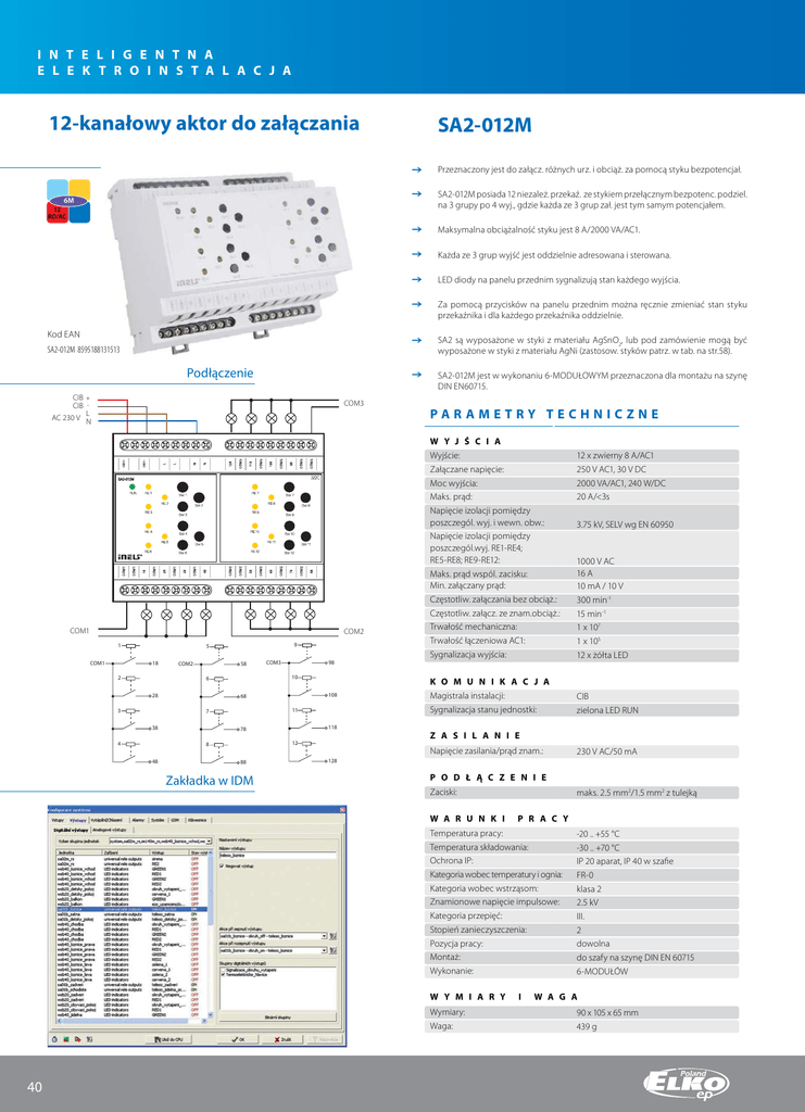I NTEL I GENTNA ELEKTRO I NSTALA C JA 12-kanałowy aktor do załączania 6M SA2-012M Z Przeznaczony jest do załącz. różnych urz. i obciąż. za pomocą styku bezpotencjał. Z SA2-012M posiada 12 niezależ. przekaź. ze stykiem przełącznym bezpotenc. podziel. na 3 grupy po 4 wyj., gdzie każda ze 3 grup zał. jest tym samym potencjałem. Z Maksymalna obciążalność styku jest 8 A/2000 VA/AC1. Z Każda ze 3 grup wyjść jest oddzielnie adresowana i sterowana. Z LED diody na panelu przednim sygnalizują stan każdego wyjścia. Z Za pomocą przycisków na panelu przednim można ręcznie zmieniać stan styku przekaźnika i dla każdego przekaźnika oddzielnie. Z SA2 są wyposażone w styki z materiału AgSnO2, lub pod zamówienie mogą być wyposażone w styki z materiału AgNi (zastosow. styków patrz. w tab. na str.58). Z SA2-012M jest w wykonaniu 6-MODUŁOWYM przeznaczona dla montażu na szynę DIN EN60715. 12 RO/AC Kod EAN SA2-012M 8595188131513 Podłączenie CIB + CIB L AC 230 V N COM3 P a r a m e t r y t e c h n ic z n e w y j ś ci a COM1 COM2 1 18 COM1 9 5 2 58 COM2 28 3 38 11 118 78 12 8 48 108 68 7 4 98 COM3 10 6 88 Zakładka w IDM Wyjście: Załączane napięcie: Moc wyjścia: Maks. prąd: Napięcie izolacji pomiędzy poszczegól. wyj. i wewn. obw.: Napięcie izolacji pomiędzy poszczegól.wyj. RE1-RE4; RE5-RE8; RE9-RE12: Maks. prąd wspól. zacisku: Min. załączany prąd: Częstotliw. załączania bez obciąż.: Częstotliw. załącz. ze znam.obciąż.: Trwałość mechaniczna: Trwałość łączeniowa AC1: Sygnalizacja wyjścia: k o mu n i k a c j a Magistrala instalacji: Sygnalizacja stanu jednostki: 3.75 kV, SELV wg EN 60950 1000 V AC 16 A 10 mA / 10 V 300 min-1 15 min-1 1 x 107 1 x 105 12 x żółta LED CIB zielona LED RUN z a s i l a n i e Napięcie zasilania/prąd znam.: 230 V AC/50 mA 128 P OD Ł Ą C ZEN I E Zaciski: WAR U NK I maks. 2.5 mm2/1.5 mm2 z tulejką P RA C Y Temperatura pracy: Temperatura składowania: Ochrona IP: Kategoria wobec temperatury i ognia: Kategoria wobec wstrząsom: Znamionowe napięcie impulsowe: Kategoria przepięć: Stopień zanieczyszczenia: Pozycja pracy: Montaż: Wykonanie: WY M I ARY Wymiary: Waga: 40 12 x zwierny 8 A/AC1 250 V AC1, 30 V DC 2000 VA/AC1, 240 W/DC 20 A/<3s I -20 .. +55 °C -30 .. +70 °C IP 20 aparat, IP 40 w szafie FR-0 klasa 2 2.5 kV III. 2 dowolna do szafy na szynę DIN EN 60715 6-MODUŁÓW WAGA 90 x 105 x 65 mm 439 g