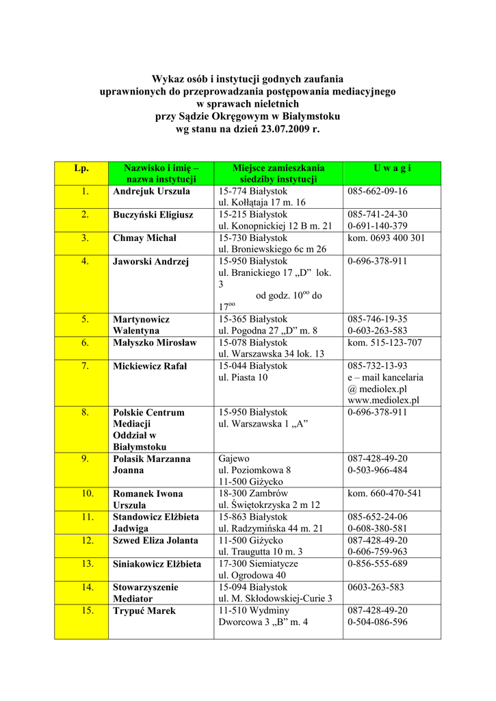 Wykaz osób i instytucji godnych zaufania uprawnionych do przeprowadzania postępowania mediacyjnego w sprawach nieletnich przy Sądzie Okręgowym w Białymstoku wg stanu na dzień 23.07.2009 r. 1. Nazwisko i imię – nazwa instytucji Andrejuk Urszula 2. Buczyński Eligiusz 3. Chmay Michał 4. Jaworski Andrzej 5. 6. Martynowicz Walentyna Małyszko Mirosław 7. Mickiewicz Rafał 8. Polskie Centrum Mediacji Oddział w Białymstoku Polasik Marzanna Joanna Lp. 9. 10. 12. Romanek Iwona Urszula Standowicz Elżbieta Jadwiga Szwed Eliza Jolanta 13. Siniakowicz Elżbieta 14. Stowarzyszenie Mediator Trypuć Marek 11. 15. Miejsce zamieszkania siedziby instytucji 15-774 Białystok ul. Kołłątaja 17 m. 16 15-215 Białystok ul. Konopnickiej 12 B m. 21 15-730 Białystok ul. Broniewskiego 6c m 26 15-950 Białystok ul. Branickiego 17 „D” lok. 3 od godz. 10oo do oo 17 15-365 Białystok ul. Pogodna 27 „D” m. 8 15-078 Białystok ul. Warszawska 34 lok. 13 15-044 Białystok ul. Piasta 10 15-950 Białystok ul. Warszawska 1 „A” Gajewo ul. Poziomkowa 8 11-500 Giżycko 18-300 Zambrów ul. Świętokrzyska 2 m 12 15-863 Białystok ul. Radzymińska 44 m. 21 11-500 Giżycko ul. Traugutta 10 m. 3 17-300 Siemiatycze ul. Ogrodowa 40 15-094 Białystok ul. M. Skłodowskiej-Curie 3 11-510 Wydminy Dworcowa 3 „B” m. 4 Uwagi 085-662-09-16 085-741-24-30 0-691-140-379 kom. 0693 400 301 0-696-378-911 085-746-19-35 0-603-263-583 kom. 515-123-707 085-732-13-93 e – mail kancelaria @ mediolex.pl www.mediolex.pl 0-696-378-911 087-428-49-20 0-503-966-484 kom. 660-470-541 085-652-24-06 0-608-380-581 087-428-49-20 0-606-759-963 0-856-555-689 0603-263-583 087-428-49-20 0-504-086-596 16. Zarzycki Wiesław 10-100 Sokółka ul. Grodzieńska 150 2 d. 085 675-20-87
