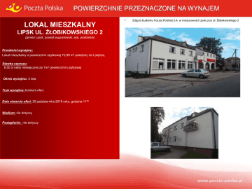 POWIERZCHNIE PRZEZNACZONE NA WYNAJEM - LOKAL MIESZKALNY LIPSK UL. ŻŁOBIKOWSKIEGO 2 (gmina Lipsk, powiat augustowski, woj. podlaskie) Przedmiot wynajmu: Lokal mieszkalny o powierzchni użytkowej 73,99 m² położony na I piętrze, Stawka czynszu: 8,50 zł netto miesięcznie za 1m2 powierzchni użytkowej Okres wynajmu: 3 lata Tryb wynajmu: konkurs ofert. Data otwarcia ofert: 25 października 2016 roku, godzina 11 00 Wadium: nie dotyczy Postąpienie: nie dotyczy • Zdjęcia budynku Poczty Polskiej S.A. w miejscowości Lipsk przy ul. Żłobikowskiego 2 Kliknij i zlokalizuj na mapie Opis przedmiotu wynajmu: • Pokój nr 1 Lokal mieszkalny o powierzchni użytkowej 73,99 m2 usytuowany jest na I piętrze budynku stanowiącego własność Poczty Polskiej S.A. Składa się z 3 pokoi, kuchni, łazienki, wc i przedpokoju. Do lokalu przynależy pomieszczenie w piwnicy o powierzchni użytkowej 9,35 m2 Lokal mieszkalny wyposażony jest w instalacje: elektryczną, centralnego ogrzewania i wodno-kanalizacyjną. Niezależnie od czynszu Najemca będzie ponosił opłaty za dostawę: energii cieplnej, wody zimnej, odprowadzania ścieków. Opłaty za energię elektryczną oraz opłaty za wywóz nieczystości stałych, Najemca uiszczać będzie na podstawie umów zawartych odrębnie z dostawcami tych usług. • Pokój nr 2 Pokój nr 3 Opis nieruchomości: Miejscowość Ulica, nr budynku Lipsk Żłobikowskiego 2 Powierzchnia budynku, w których zlokalizowany jest przedmiot wynajmu 741,11 m² Nr działki ewidencyjnej, obręb 559 0001 Lipsk Księga wieczysta, Sąd Rejonowy, Nr Wydziału SU1A/00009024/3 prowadzona przez Sąd Rejonowy w Augustowie, IV Wydział Ksiąg Wieczystych. Stan prawny gruntu Działka będąca w użytkowaniu wieczystym Poczty Polskiej S.A. Lokalizacja i dostępność komunikacyjna: Nieruchomość położona jest w miejscowości gminnej Lipsk przy ul. Żłobikowskiego 2. W pobliżu znajdują się: Urząd Miejski,Bank Spółdzielczy, Gminny Ośrodek Kultury, Biedronka, Sklep Spożywczo-Przemysłowy. Gmina Lipsk sąsiaduje z granicą polsko-białoruską. Miejscowość położona jest przy drodze wojewódzkiej nr 664, nad rzeką Biebrzą na historycznej Suwalszczyźnie, jest ośrodkiem sztuki ludowej tj: pisankarstwo, tkactwo, Zespół Regionalny Lipsk. Opis nieruchomości: Nieruchomość zabudowana jest budynkiem eksploatacyjno-mieszkalnym. OBWIESZCZENIE O KONKURSIE OFERT NA NAJEM CZĘŚCI NIERUCHOMOŚCI Wynajmujący: POCZTA POLSKA S.A. z siedzibą w Warszawie, 00-940 Warszawa, ul. Rodziny Hiszpańskich 8. Prowadzący konkurs ofert: Poczta Polska S.A., Pion Infrastruktury Obszar Operacyjny ds. Nieruchomości w Białymstoku, ul. Kolejowa 26, 15-959 Białystok. Miejsce otwarcia ofert: 16-400 Suwałki, ul. Pułaskiego 52, II piętro pokój nr 301. Poczta Polska S.A. Pion Infrastruktury Obszar Operacyjny ds. Nieruchomości w Białymstoku ogłasza Konkurs ofert na: Najem lokalu mieszkalnego usytuowanego na I piętrze budynku eksploatacyjno-mieszkalnego położonego przy ul. Żłobikowskiego 2 w Lipsku. Okres trwania umowy – 3 lata. Charakterystyka nieruchomości: Nieruchomość położona jest w miejscowości gminnej Lipsk przy ul. Żłobikowskiego 2. W pobliżu znajdują się: Urząd Miejski,Bank Spółdzielczy, Gminny Ośrodek Kultury, Biedronka, Sklep Spożywczo-Przemysłowy. Gmina Lipsk sąsiaduje z granicą polsko-białoruską. Miejscowość położona jest przy drodze wojewódzkiej nr 664, nad rzeką Biebrzą na historycznej Suwalszczyźnie, jest ośrodkiem sztuki ludowej tj: pisankarstwo, tkactwo, Zespół Regionalny Lipsk. Na parterze mieści się Placówka Pocztowa. Przedmiot najmu: Lokal mieszkalny o łącznej powierzchni użytkowej – 73,99 m2, składający się z 3 pokoi, kuchni, łazienki, wc i przedpokoju. Do lokalu przynależy pomieszczenie w piwnicy o powierzchni użytkowej 9,35 m 2, Wywoławcza stawka czynszu netto wynosi: 8,50 PLN/m2 miesięcznie, Stawka czynszu nie obejmuje opłat za dostawę: energii elektrycznej, energii cieplnej, wody zimnej, odprowadzania ścieków, opłat z tytułu wywozu nieczystości stałych. Wadium: nie dotyczy Szczegółowe informacje na temat warunków najmu zostały zawarte w projekcie umowy najmu z którym można się zapoznać siedzibie Pionu Infrastruktury w Suwałkach przy ul. Pułaskiego 52, pokój nr 307 tel. (87) 621 53 31, pokój nr 306 tel. (87) 565 04 66 kom. 516 178 396 w godzinach od 800 do 1400 Termin i miejsce składania ofert: Ofertę w zaklejonej kopercie z napisem na kopercie „ Wynajem lokalu mieszkalnego Lipsk przy ul. Żłobikowskiego 2” należy składać do dnia 24.10.2016 r. osobiście lub drogą pocztową na adres: Poczta Polska S.A. Pion Infrastruktury, Wydział Zarządzania Nieruchomościami ul. Pułaskiego 52, 16-400 Suwałki, pokój nr 307. Termin otwarcia ofert: 25 października 2016 r. godzina 11 00. Warunkiem przystąpienia do konkursu ofert jest: Złożenie oferty wraz załącznikami: - oświadczenie o zapoznaniu się z ogłoszeniem o przetargu, warunkami przetargu, ze stanem technicznym lokalu mieszkalnego przeznaczonego do wynajmu, z treścią projektu umowy i przyjęciu je bez zastrzeżeń (dokumenty do pobrania u osób wskazanych do kontaktu), - czytelna kserokopia dowodu osobistego., Okres związania ofertą wynosi 60 dni. Jedna złożona oferta wystarcza do odbycia przetargu. Informacje na temat stanu technicznego lokalu mieszkalnego oraz termin oględzin można uzgodnić w dni powszednie w godz. od 8 00 do 1400 tel. (87) 565 04 66, kom. 502 516 178 396, lub (87) 565 03 91. Pomieszczenia można oglądać do dnia 24.10.2016 r. POCZTA POLSKA S.A. ZASTRZEGA SOBIE PRAWO UNIEWAŻNIENIA PRZETARGU W KAŻDYM CZASIE BEZ PODANIA PRZYCZYN I PONOSZENIA SKUTKÓW PRAWNYCH I FINANSOWYCH Z TEGO TYTUŁU. Formularz zgłoszenia uczestnictwa w przetargu Dotyczy wynajmu części nieruchomości: Lokal mieszkalny o powierzchni użytkowej 73,99 m2 usytuowany na I piętrze w budynku PP SA w miejscowości Lipsk przy ul. Żłobikows