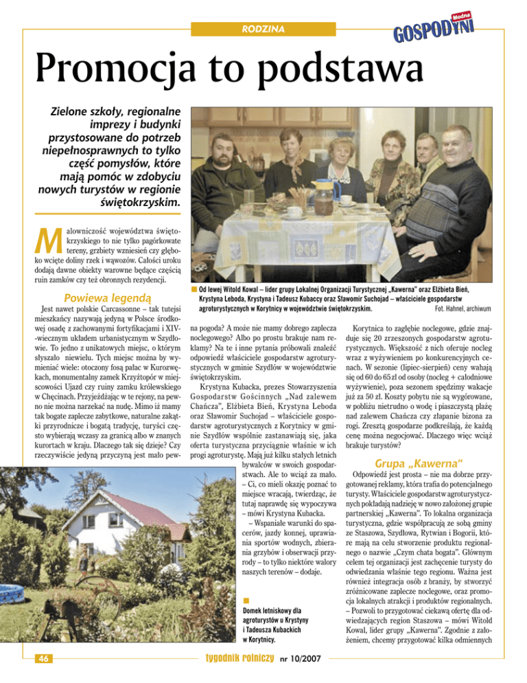 RODZINA Promocja to podstawa Zielone szkoły, regionalne imprezy i budynki przystosowane do potrzeb niepełnosprawnych to tylko część pomysłów, które mają pomóc w zdobyciu nowych turystów w regionie świętokrzyskim. M alowniczość województwa świętokrzyskiego to nie tylko pagórkowate tereny, grzbiety wzniesień czy głęboko wcięte doliny rzek i wąwozów. Całości uroku dodają dawne obiekty warowne będące częścią ruin zamków czy też obronnych rezydencji. Powiewa legendą Jest nawet polskie Carcassonne – tak tutejsi mieszkańcy nazywają jedyną w Polsce środkowej osadę z zachowanymi fortyfikacjami i XIV-wiecznym układem urbanistycznym w Szydłowie. To jedno z unikatowych miejsc, o którym słyszało niewielu. Tych miejsc można by wymieniać wiele: otoczony fosą pałac w Kurozwękach, monumentalny zamek Krzyżtopór w miejscowości Ujazd czy ruiny zamku królewskiego w Chęcinach. Przyjeżdżając w te rejony, na pewno nie można narzekać na nudę. Mimo iż mamy tak bogate zaplecze zabytkowe, naturalne zakątki przyrodnicze i bogatą tradycję, turyści często wybierają wczasy za granicą albo w znanych kurortach w kraju. Dlaczego tak się dzieje? Czy rzeczywiście jedyną przyczyną jest mało pew- ¢ Od lewej Witold Kowal – lider grupy Lokalnej Organizacji Turystycznej „Kawerna” oraz Elżbieta Bień, Krystyna Leboda, Krystyna i Tadeusz Kubaccy oraz Sławomir Suchojad – właściciele gospodarstw agroturystycznych w Korytnicy w województwie świętokrzyskim. Fot. Hahnel, archiwum na pogoda? A może nie mamy dobrego zaplecza noclegowego? Albo po prostu brakuje nam reklamy? Na te i inne pytania próbowali znaleźć odpowiedź właściciele gospodarstw agroturystycznych w gminie Szydłów w województwie świętokrzyskim. Krystyna Kubacka, prezes Stowarzyszenia Gospodarstw Gościnnych „Nad zalewem Chańcza”, Elżbieta Bień, Krystyna Leboda oraz Sławomir Suchojad – właściciele gospodarstw agroturystycznych z Korytnicy w gminie Szydłów wspólnie zastanawiają się, jaka oferta turystyczna przyciągnie właśnie w ich progi agroturystę. Mają już kilku stałych letnich bywalców w swoich gospodarstwach. Ale to wciąż za mało. – Ci, co mieli okazję poznać to miejsce wracają, twierdząc, że tutaj naprawdę się wypoczywa – mówi Krystyna Kubacka. – Wspaniałe warunki do spacerów, jazdy konnej, uprawiania sportów wodnych, zbierania grzybów i obserwacji przyrody – to tylko niektóre walory naszych terenów – dodaje. ¢ Domek letniskowy dla agroturystów u Krystyny i Tadeusza Kubackich w Korytnicy. 46 tygodnik rolniczy nr 10/2007 Korytnica to zagłębie noclegowe, gdzie znajduje się 20 zrzeszonych gospodarstw agroturystycznych. Większość z nich oferuje nocleg wraz z wyżywieniem po konkurencyjnych cenach. W sezonie (lipiec-sierpień) ceny wahają się od 60 do 65 zł od osoby (nocleg + całodniowe wyżywienie), poza sezonem spędzimy wakacje już za 50 zł. Koszty pobytu nie są wygórowane, w pobliżu nietrudno o wodę i piaszczystą plażę nad zalewem Chańcza czy złapanie bizona za rogi. Zresztą gospodarze podkreślają, że każdą cenę można negocjować. Dlaczego więc wciąż brakuje turystów? Grupa „Kawerna“ Odpowiedź jest prosta – nie ma dobrze przygotowanej reklamy, która trafia do potencjalnego turysty. Właściciele gospodarstw agroturystycznych pokładają nadzieję w nowo założonej grupie partnerskiej „Kawerna”. To lokalna organizacja turystyczna, gdzie współpracują ze sobą gminy ze Staszowa, Szydłowa, Rytwian i Bogorii, które mają na celu stworzenie produktu regionalnego o nazwie „Czym chata bogata”. Głównym celem tej organizacji jest zachęcenie turysty do odwiedzania właśnie tego regionu. Ważna jest również integracja osób z branży, by stworzyć zróżnicowane zaplecze noclegowe, oraz promocja lokalnych atrakcji i produktów regionalnych. – Pozwoli to przygotować ciekawą ofertę dla odwiedzających region Staszowa – mówi Witold Kowal, lider grupy „Kawerna”. Zgodnie z założeniem, chcemy przygotować kilka odmiennych RODZINA ¢ Szydłów i jego okolice usłane są licznymi zabytkami. Należą do nich pałac w Kurozwękach, obecnie zagospodarowany przez prawowitych właścicieli – rodzinę Popielów – oraz Brama Krakowska w Szydłowie, która stanowi jeden z najwartościowszych przykładów rozwinięcia systemu obronnego. ofert dla turystów, tak by każdy znalazł tu coś dla siebie. Jedni preferują aktywny wypoczynek, inni z zainteresowaniem odkrywają tajemnice historii, są też tacy, którzy chcą nadrobić zaległości ulubionej lektury – podkreśla pan Kowal. – Stawiamy nie tylko na piękne krajobrazy, ale i bogatą kuchnię regionalną. Chcemy rozpropagować pyszną kaszę z suszonymi śliwkami, stek z bizona, zalewajkę świętokrzyską i tradycyjną śliwowicę. To nasze asy w kiesze¢ ZDANIEM WÓJTA JAN KLAMCZYŃSKI wójt gminy Szydłów: – W roku 2008 planujemy rozpocząć renowację dawnych murów obronnych. Wiele zabytkowych odcinków wymaga natychmiastowych remontów, a z roku na rok miejsc do renowacji przybywa, niestety, coraz więcej. Mamy już przygotowaną koncepcję i jesteśmy w trakcie przygotowywania dokumentacji potrzebnej do rozpoczęcia prac. To konieczność, jeśli chcemy, by odwiedzało nas coraz więcej turystów. Musimy zabiegać o poprawę wizerunku średniowiecznego Szydłowa. W niedalekiej przyszłości czeka nas również modernizacja rynku. Chcę również zwiększyć nacisk na promocję naszej gminy oraz zachęcić potencjalnych inwestorów do rozwijania działalności gospodarczej, poprzez przyjazną politykę podatkową. ni! – przekonuje lider organizacji. Większość tych przysmaków można spróbować podczas imprez smakowych, np. na Dniu Śliwiki w Szydłowie, Dniu Chleba w Staszowie czy podczas nowo organizowanego spotkania o nazwie „Pan Karp” w Rytwianach. Imprezy mają zostać usystematyzowa