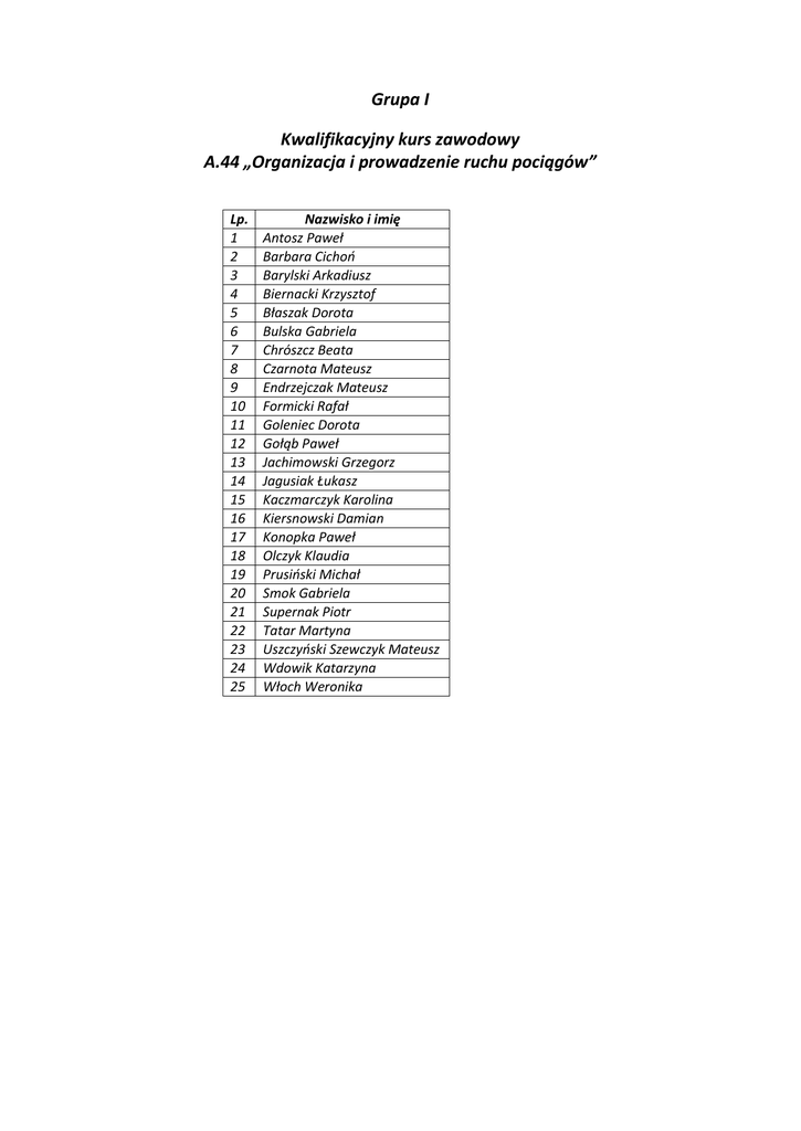 Grupa I Kwalifikacyjny kurs zawodowy A.44 „Organizacja i prowadzenie ruchu pociągów” Lp. 1 2 3 4 5 6 7 8 9 10 11 12 13 14 15 16 17 18 19 20 21 22 23 24 25 Nazwisko i imię Antosz Paweł Barbara Cichoo Barylski Arkadiusz Biernacki Krzysztof Błaszak Dorota Bulska Gabriela Chrószcz Beata Czarnota Mateusz Endrzejczak Mateusz Formicki Rafał Goleniec Dorota Gołąb Paweł Jachimowski Grzegorz Jagusiak Łukasz Kaczmarczyk Karolina Kiersnowski Damian Konopka Paweł Olczyk Klaudia Prusioski Michał Smok Gabriela Supernak Piotr Tatar Martyna Uszczyoski Szewczyk Mateusz Wdowik Katarzyna Włoch Weronika