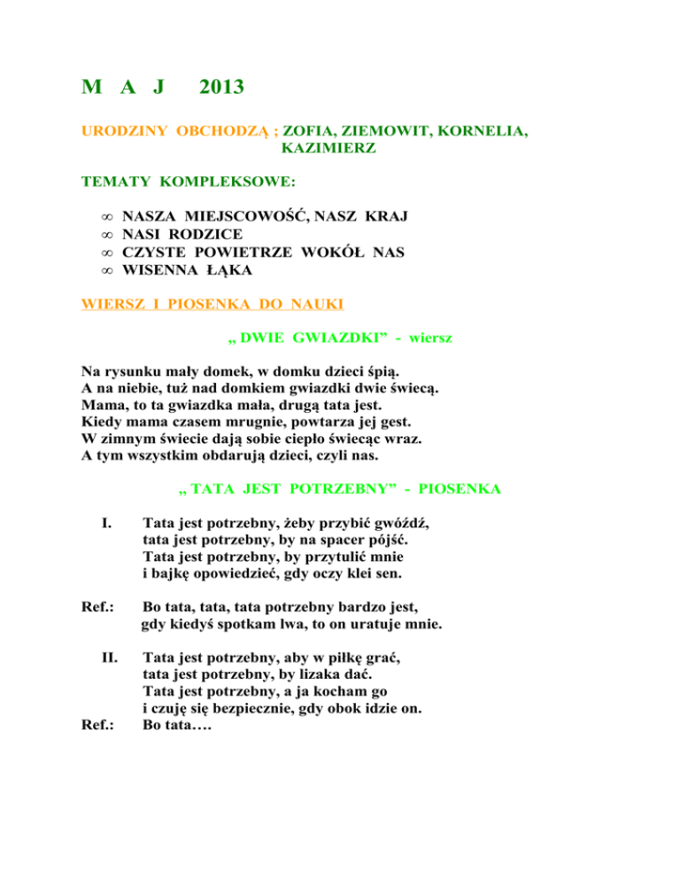 M A J 2013 URODZINY OBCHODZĄ ; ZOFIA, ZIEMOWIT, KORNELIA, KAZIMIERZ TEMATY KOMPLEKSOWE: • • • • NASZA MIEJSCOWOŚĆ, NASZ KRAJ NASI RODZICE CZYSTE POWIETRZE WOKÓŁ NAS WISENNA ŁĄKA WIERSZ I PIOSENKA DO NAUKI ,, DWIE GWIAZDKI” - wiersz Na rysunku mały domek, w domku dzieci śpią. A na niebie, tuż nad domkiem gwiazdki dwie świecą. Mama, to ta gwiazdka mała, drugą tata jest. Kiedy mama czasem mrugnie, powtarza jej gest. W zimnym świecie dają sobie ciepło świecąc wraz. A tym wszystkim obdarują dzieci, czyli nas. ,, TATA JEST POTRZEBNY” - PIOSENKA I. Ref.: II. Ref.: Tata jest potrzebny, żeby przybić gwóźdź, tata jest potrzebny, by na spacer pójść. Tata jest potrzebny, by przytulić mnie i bajkę opowiedzieć, gdy oczy klei sen. Bo tata, tata, tata potrzebny bardzo jest, gdy kiedyś spotkam lwa, to on uratuje mnie. Tata jest potrzebny, aby w piłkę grać, tata jest potrzebny, by lizaka dać. Tata jest potrzebny, a ja kocham go i czuję się bezpiecznie, gdy obok idzie on. Bo tata…. Uwaga! Serdecznie zapraszam Rodziców ,,Jeżyków” na ostatnie spotkanie, które odbędzie się 14 maja (wtorek) 2013r. o godzinie 15.30. Liczę na wysoką frekwencję. Jadwiga Nowosad
