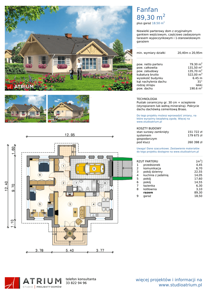Fanfan 89,30 m2 plus garaż 18.50 m2 Niewielki parterowy dom z oryginalnym gankiem wejściowym, częściowo zadaszonym tarasem wypoczynkowym i 1-stanowiskowym garażem min. wymiary działki pow. netto parteru pow. całkowita pow. zabudowy kubatura brutto wysokość budynku kąt nachylenia dachu rodzaj stropu pow. dachu 20,40m x 20,95m 79.30 m2 131,50 m2 135,70 m2 522,00 m3 6.45 m 31° lekki 190.6 m2 TECHNOLOGIA Pustak ceramiczny gr. 30 cm + ocieplenie (styropianem lub wełną mineralną). Pokrycie dachu dachówką cementową Braas. Do tego projektu możesz wprowadzić zmiany, na które wyrazimy bezpłatną zgodę. Więcej na www.studioatrium.pl KOSZTY BUDOWY stan surowy zamknięty systemem gospodarczym pod klucz 151 722 zł 179 675 zł 260 398 zł Uwaga! Dane szacunkowe. Zestawienie materiałów do tego projektu dostępne na www.studioatrium.pl RZUT PARTERU 1 przedsionek 2 komunikacja 3 pokój dzienny 4 kuchnia z jadalnią 5 pokój 6 pokój 7 łazienka 8 kotłownia razem 9 garaż telefon konsultanta 33 822 94 96 Powered by TCPDF (www.tcpdf.org) [m2] 4,45 6,70 22,55 14,05 17,60 14,55 6,30 3,10 89,30 18,50 więcej projektów i informacji na www.studioatrium.pl