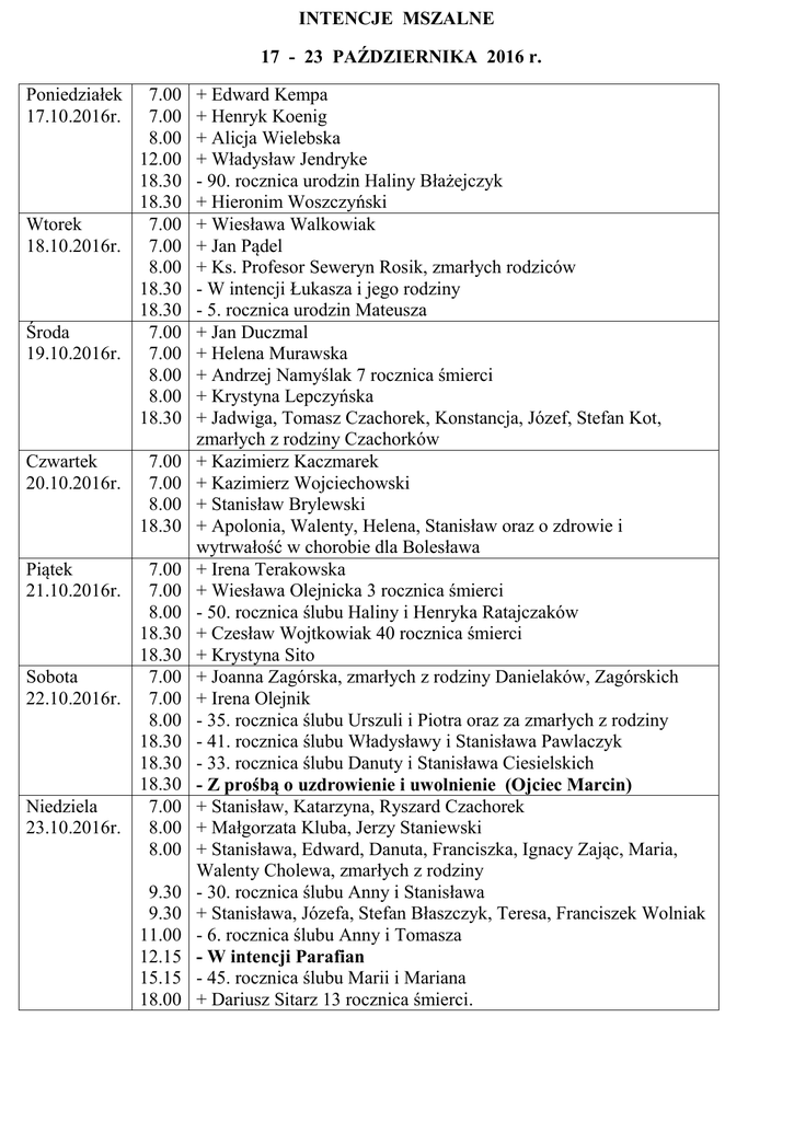 INTENCJE MSZALNE 17 - 23 PAŹDZIERNIKA 2016 r. Poniedziałek