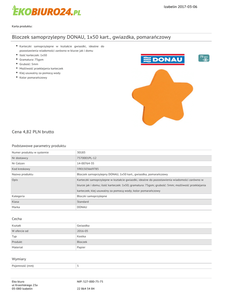 Izabelin 2017-03-06 Karta produktu: Bloczek samoprzylepny DONAU, 1x50 kart., gwiazdka, pomarańczowy Karteczki samoprzylepne w kształcie gwiazdki, idealne do pozostawienia wiadomości zarówno w biurze jak i domu Ilość karteczek: 1x50 Gramatura: 75gsm Grubość: 5mm Możliwość przeklejania karteczek Klej usuwalny za pomocą wody Kolor pomarańczowy Cena 4,82 PLN brutto Podstawowe parametry produktu Numer produktu w systemie 30183 Nr dostawcy 7570001PL-12 Nr Celcen 14-00764-35 Kod kreskowy 5901503669785 Nazwa produktu Bloczek samoprzylepny DONAU, 1x50 kart., gwiazdka, pomarańczowy Opis Karteczki samoprzylepne w kształcie gwiazdki, idealne do pozostawienia wiadomości zarówno w biurze jak i domu; ilość karteczek: 1x50; gramatura: 75gsm; grubość: 5mm; możliwość przeklejania karteczek; klej usuwalny za pomocą wody; kolor pomarańczowy Kategoria Bloczki samoprzylepne Klasa Standard Marka DONAU Cecha Kształt Gwiazdka W ofercie od 2016-05 Typ Kostka Produkt Bloczek Materiał Papier Wymiary Pojemność (mm) 5 Eko biuro ul Krasińskiego 23a 05-080 Izabelin NIP: 527-000-75-75 22 864 54 84 Izabelin 2017-03-06 Karta katalogowa produktu cd. Bloczek samoprzylepny DONAU, 1x50 kart., gwiazdka, pomarańczowy Gramatura (g/m2) 75 Wspólny słownik zamówień CPV 22816300-6 Bloczki samoprzylepnych karteczek na notatki Certyfikaty Nowy produkt w ofercie Standard Hit Standard Ilość Ilość kartek 50 Kolor Kolor Pomarańczowy Serdecznie zapraszamy do współpracy Eko biuro zespół. Eko biuro ul Krasińskiego 23a 05-080 Izabelin NIP: 527-000-75-75 22 864 54 84