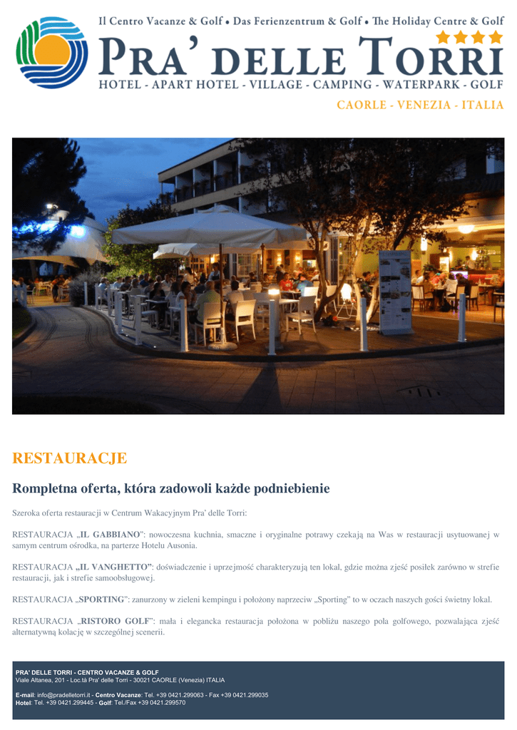 RESTAURACJE Rompletna oferta, która zadowoli każde podniebienie Szeroka oferta restauracji w Centrum Wakacyjnym Pra’ delle Torri: RESTAURACJA „IL GABBIANO”: nowoczesna kuchnia, smaczne i oryginalne potrawy czekają na Was w restauracji usytuowanej w samym centrum ośrodka, na parterze Hotelu Ausonia. RESTAURACJA „IL VANGHETTO”: doświadczenie i uprzejmość charakteryzują ten lokal, gdzie można zjeść posiłek zarówno w strefie restauracji, jak i strefie samoobsługowej. RESTAURACJA „SPORTING”: zanurzony w zieleni kempingu i położony naprzeciw „Sporting” to w oczach naszych gości świetny lokal. RESTAURACJA „RISTORO GOLF”: mała i elegancka restauracja położona w pobliżu naszego pola golfowego, pozwalająca zjeść alternatywną kolację w szczególnej scenerii. PRA' DELLE TORRI - CENTRO VACANZE & GOLF Viale Altanea, 201 - Loc.tà Pra' delle Torri - 30021 CAORLE (Venezia) ITALIA E-mail: [email protected] - Centro Vacanze: Tel. +39 0421.299063 - Fax +39 0421.299035 Hotel: Tel. +39 0421.299445 - Golf: Tel./Fax +39 0421.299570 KIOSK-RESTAURACJA „CHIRINGUITO”: bezpośrednio na brzegu morza, oferuje menu od przekąsek po doskonałe grillowane mięsa. PRA' DELLE TORRI - CENTRO VACANZE & GOLF Viale Altanea, 201 - Loc.tà Pra' delle Torri - 30021 CAORLE (Venezia) ITALIA E-mail: [email protected] - Centro Vacanze: Tel. +39 0421.299063 - Fax +39 0421.299035 Hotel: Tel. +39 0421.299445 - Golf: Tel./Fax +39 0421.299570 Powered by TCPDF (www.tcpdf.org)
