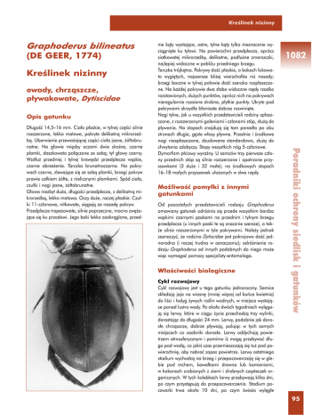 Nazwa KreÊlinek zwierzaka nizinny Graphoderus bilineatus (DE GEER, 1774) KreÊlinek nizinny owady, chrzàszcze, p∏ywakowate, Dytiscidae Opis gatunku Mo˝liwoÊç pomy∏ki z innymi gatunkami Od pozosta∏ych przedstawicieli rodzaju Graphoderus omawiany gatunek odró˝nia si´ przede wszystkim bardzo wàskimi czarnymi paskami na przednim i tylnym brzegu przedplecza (u innych paski te sà znacznie szersze), a tak˝e silnie rozszerzonymi w tyle pokrywami. Nale˝y jednak zaznaczyç, ˝e rodzina Dytiscidae jest pokrojowo doÊç jednorodna (i raczej trudna w oznaczaniu); odró˝nienie rodzaju Graphoderus od innych podobnych do niego mo˝e wi´c wymagaç pomocy specjalisty-entomologa. W∏aÊciwoÊci biologiczne Cykl rozwojowy Cykl rozwojowy jest u tego gatunku jednoroczny. Samice sk∏adajà jaja na wiosn´ (mniej wi´cej od koƒca kwietnia) do liÊci i ∏odyg ˝ywych roÊlin wodnych, w miejsca wystajàce ponad lustro wody. Po oko∏o dwóch tygodniach wyl´gajà si´ larwy, które w ciàgu ˝ycia przechodzà trzy wylinki, dorastajàc do d∏ugoÊci 24 mm. Larwy, podobnie jak doros∏e chrzàszcze, dobrze p∏ywajà, polujàc w tych samych miejscach co osobniki doros∏e. Larwy oddychajà powietrzem atmosferycznym i pomimo i˝ mogà przebywaç d∏ugo pod wodà, co jakiÊ czas przemieszczajà si´ tu˝ pod powierzchni´, aby nabraç zapas powietrza. Larwy ostatniego stadium wychodzà na brzeg i przepoczwarczajà si´ w glebie pod mchem, kawa∏kami drewna lub kamieniami, w kokonach zrobionych z ziemi i drobnych czàsteczek organicznych. W tych kolebkach larwy przebywajà kilka dni, po czym przyst´pujà do przepoczwarczenia. Stadium poczwarki trwa oko∏o 10 dni, po czym Êwie˝o wyl´g∏e 1082 Poradniki ochrony siedlisk i gatunków D∏ugoÊç 14,5–16 mm. Cia∏o p∏askie, w tylnej cz´Êci silnie rozszerzone, lekko matowe, pokryte delikatnà mikrorzeêbà. Ubarwienie przewa˝ajàcej cz´Êci cia∏a jasne, ˝ó∏tobrunatne. Na g∏owie mi´dzy oczami dwie skoÊne, czarne plamki, daszkowato po∏àczone ze sobà; ty∏ g∏owy czarny. Wzd∏u˝ przedniej i tylnej kraw´dzi przedplecza wàskie, czarne obrze˝enie. Tarczka brunatnoczarna. Na pokrywach czarne, zlewajàce si´ ze sobà plamki, brzegi pokryw prawie ca∏kiem ˝ó∏te, z nielicznymi plamkami. Spód cia∏a, czu∏ki i nogi jasne, ˝ó∏tobrunatne. G∏owa niezbyt du˝a, d∏ugoÊci przedplecza, z delikatnà mikrorzeêbà, lekko matowa. Oczy du˝e, raczej p∏askie. Czu∏ki 11-cz∏onowe, nitkowate, si´gajà za nasad´ pokryw. Przedplecze trapezowate, silnie poprzeczne, mocno zw´˝ajàce si´ ku przodowi. Jego boki lekko zaokràglone, przed- nie kàty wystajàce, ostre, tylne kàty tylko nieznacznie wyciàgni´te ku ty∏owi. Na powierzchni przedplecza, oprócz siatkowatej mikrorzeêby, delikatne, pod∏u˝ne zmarszczki, najlepiej widoczne w pobli˝u przedniego brzegu. Tarczka trójkàtna. Pokrywy doÊç p∏askie, o bokach ∏ukowato wygi´tych, najszersze bli˝ej wierzcho∏ka ni˝ nasady; brzegi boczne w tylnej po∏owie doÊç szeroko rozp∏aszczone. Na ka˝dej pokrywie dwa s∏abo widoczne rz´dy rzadko rozstawionych, du˝ych punktów, oprócz nich na pokrywach nieregularnie rozsiane drobne, p∏ytkie punkty. Ukryte pod pokrywami skrzyd∏a b∏oniaste dobrze rozwini´te. Nogi tylne, jak u wszystkich przedstawicieli rodziny sp∏aszczone, z rozszerzonymi goleniami i cz∏onami stóp, s∏u˝à do p∏ywania. Na stopach znajdujà si´ tam ponadto po obu stronach d∏ugie, g´ste w∏osy p∏ywne. Przednie i Êrodkowe nogi niesp∏aszczone, zbudowane standardowo, s∏u˝à do chwytania zdobyczy. Stopy wszystkich nóg 5-cz∏onowe. Dymorfizm p∏ciowy wyraêny. U samców trzy pierwsze cz∏ony przednich stóp sà silnie rozszerzone i opatrzone przyssawkami (3 du˝e i 32 ma∏e); na Êrodkowych stopach 16–18 ma∏ych przyssawek u∏o˝onych w dwa rz´dy. 95 Gatunki zwierzàt (z wyjàtkiem ptaków) – Bezkr´gowce Poradniki ochrony siedlisk i gatunków 1082 chrzàszcze jeszcze kilka dni pozostajà w kokonach, zanim je opuszczà. Ca∏y okres rozwoju od jaja do poczwarki trwa od 2 do 2,5 miesiàca, przy czym niskie temperatury powodujà wyd∏u˝enie cyklu rozwojowego, a cieplejsze warunki jego przyspieszenie. Póênym latem lub na poczàtku jesieni, po opuszczeniu kolebek, chrzàszcze zimujà, a na wiosn´ przyst´pujà do rozrodu. WÊród specjalistów nie ma zgodnoÊci co do miejsca zimowania osobników doros∏ych. Cz´Êç autorów uwa˝a, ˝e zimujà na làdzie, w glebie, w Êció∏ce lub pod kawa∏kami drewna, ale sà te˝ przes∏anki, ˝e zimowanie mo˝e odbywaç si´ w wodzie. Doros∏e chrzàszcze ˝yjà zwykle oko∏o roku, polujàc w wodzie, w strefie roÊlinnoÊci przybrze˝nej. Podobnie jak larwy, co pewien czas podp∏ywajà ku powierzchni, aby odnowiç zapas powietrza przechowywany pod pokrywami. W razie zaistnienia niesprzyjajàcych warunków (wysychanie zbiorników, brak pokarmu, przeg´szczenie) mogà przelatywaç do innych zbiorników wodnych, chocia˝ zdolnoÊç lotu majà mniejszà ni˝ inne p∏ywakowate i latajà niech´tnie. Wra˝liwoÊç Brak danych – nie prowadzono ˝adnych badaƒ. AktywnoÊç Nie ma dok∏adnych danych odnoÊnie do dobowego cyklu aktywnoÊci larw i osobników doros∏ych. Chrzàszcze w czasie odbywania przelotów bywajà wabione do êróde∏ sztucznego Êwiat∏a, co wskazywa∏oby na ich aktywnoÊç równie˝ w nocy. Sposób od˝ywiania Zarówno larwy, jak i doros∏e chrzàszcze sà drapie˝nikami. Od˝ywiajà si´ przede wszystkim drobnymi planktonicznymi skorupiakami. W sk∏ad ich pokarmu wchodzà tak˝e larwy owadów wodnych, np. j´tek (Ephemeroptera) i muchówek z rodziny Chironomidae. Larwy od˝ywiajà si´ p∏ynnym pokarmem. Po schwytaniu zdobyczy nak∏uwajà jej cia∏o d∏ugimi, zakrzywionymi ˝uwaczkami i wstrzykujà do wn´trza ofiary toksycznà wydzielin´, rozpuszczajàcà tkanki mi´kkie, a nast´pnie wsysajà rozpuszczone cz´Êci. Chrzàszcze d