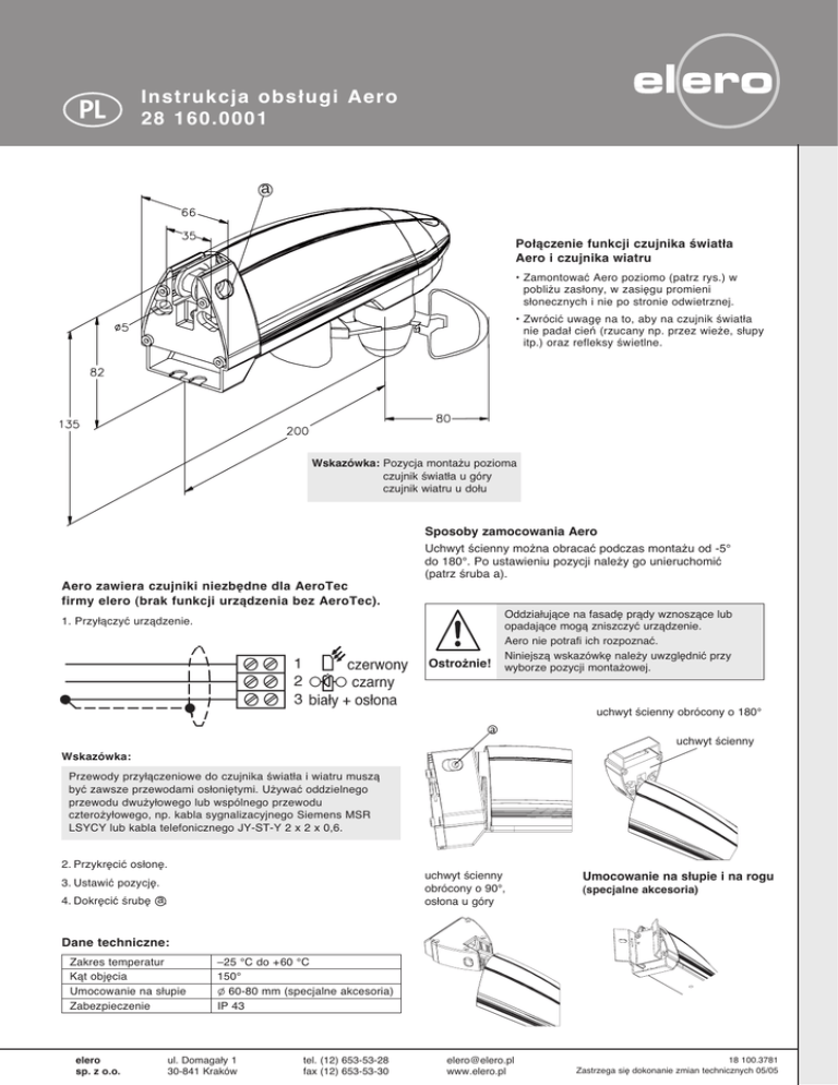PL Instrukcja obs∏ugi Aero 28 160.0001 a Po∏àczenie funkcji czujnika Êwiat∏a Aero i czujnika wiatru • Zamontowaç Aero poziomo (patrz rys.) w pobli˝u zas∏ony, w zasi´gu promieni s∏onecznych i nie po stronie odwietrznej. • Zwróciç uwag´ na to, aby na czujnik Êwiat∏a nie pada∏ cieƒ (rzucany np. przez wie˝e, s∏upy itp.) oraz refleksy Êwietlne. Wskazówka: Pozycja monta˝u pozioma czujnik Êwiat∏a u góry czujnik wiatru u do∏u Sposoby zamocowania Aero Uchwyt Êcienny mo˝na obracaç podczas monta˝u od -5° do 180°. Po ustawieniu pozycji nale˝y go unieruchomiç (patrz Êruba a). Aero zawiera czujniki niezb´dne dla AeroTec firmy elero (brak funkcji urzàdzenia bez AeroTec). 1. Przy∏àczyç urzàdzenie. Ostro˝nie! Oddzia∏ujàce na fasad´ pràdy wznoszàce lub opadajàce mogà zniszczyç urzàdzenie. Aero nie potrafi ich rozpoznaç. Niniejszà wskazówk´ nale˝y uwzgl´dniç przy wyborze pozycji monta˝owej. uchwyt Êcienny obrócony o 180° a X uchwyt Êcienny Wskazówka: Przewody przy∏àczeniowe do czujnika Êwiat∏a i wiatru muszà byç zawsze przewodami os∏oni´tymi. U˝ywaç oddzielnego przewodu dwu˝y∏owego lub wspólnego przewodu cztero˝y∏owego, np. kabla sygnalizacyjnego Siemens MSR LSYCY lub kabla telefonicznego JY-ST-Y 2 x 2 x 0,6. 2. Przykr´ciç os∏on´. uchwyt Êcienny obrócony o 90°, os∏ona u góry 3. Ustawiç pozycj´. a. 4. Dokr´ciç Êrub´ X Umocowanie na s∏upie i na rogu (specjalne akcesoria) Dane techniczne: Zakres temperatur Kàt obj´cia Umocowanie na s∏upie Zabezpieczenie elero 20 sp. z o.o. –25 °C do +60 °C 150° l 60-80 mm (specjalne akcesoria) IP 43 ul. Domaga∏y 1 30-841 Kraków tel. (12) 653-53-28 fax (12) 653-53-30 [email protected] www.elero.pl 18 100.3781 Zastrzega si´ dokonanie zmian technicznych 05/05