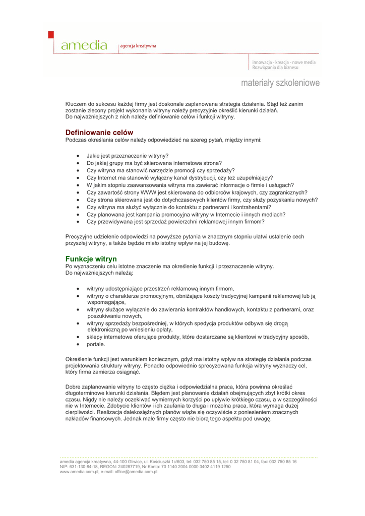 materiały szkoleniowe Kluczem do sukcesu każdej firmy jest doskonale zaplanowana strategia działania. Stąd też zanim zostanie zlecony projekt wykonania witryny należy precyzyjnie określić kierunki działań. Do najważniejszych z nich należy definiowanie celów i funkcji witryny. Definiowanie celów Podczas określania celów należy odpowiedzieć na szereg pytań, między innymi: • • • • • • • • • • Jakie jest przeznaczenie witryny? Do jakiej grupy ma być skierowana internetowa strona? Czy witryna ma stanowić narzędzie promocji czy sprzedaży? Czy Internet ma stanowić wyłączny kanał dystrybucji, czy też uzupełniający? W jakim stopniu zaawansowania witryna ma zawierać informacje o firmie i usługach? Czy zawartość strony WWW jest skierowana do odbiorców krajowych, czy zagranicznych? Czy strona skierowana jest do dotychczasowych klientów firmy, czy służy pozyskaniu nowych? Czy witryna ma służyć wyłącznie do kontaktu z partnerami i kontrahentami? Czy planowana jest kampania promocyjna witryny w Internecie i innych mediach? Czy przewidywana jest sprzedaż powierzchni reklamowej innym firmom? Precyzyjne udzielenie odpowiedzi na powyższe pytania w znacznym stopniu ułatwi ustalenie cech przyszłej witryny, a także będzie miało istotny wpływ na jej budowę. Funkcje witryn Po wyznaczeniu celu istotne znaczenie ma określenie funkcji i przeznaczenie witryny. Do najważniejszych należą: • • • • • • witryny udostępniające przestrzeń reklamową innym firmom, witryny o charakterze promocyjnym, obniżające koszty tradycyjnej kampanii reklamowej lub ją wspomagające, witryny służące wyłącznie do zawierania kontraktów handlowych, kontaktu z partnerami, oraz poszukiwaniu nowych, witryny sprzedaży bezpośredniej, w których spedycja produktów odbywa się drogą elektroniczną po wniesieniu opłaty, sklepy internetowe oferujące produkty, które dostarczane są klientowi w tradycyjny sposób, portale. Określenie funkcji jest warunkiem koniecznym, gdyż ma istotny wpływ na strategię działania podczas projektowania struktury witryny. Ponadto odpowiednio sprecyzowana funkcja witryny wyznaczy cel, który firma zamierza osiągnąć. Dobre zaplanowanie witryny to często ciężka i odpowiedzialna praca, która powinna określać długoterminowe kierunki działania. Błędem jest planowanie działań obejmujących zbyt krótki okres czasu. Nigdy nie należy oczekiwać wymiernych korzyści po upływie krótkiego czasu, a w szczególności nie w Internecie. Zdobycie klientów i ich zaufania to długa i mozolna praca, która wymaga dużej cierpliwości. Realizacja dalekosiężnych planów wiąże się oczywiście z poniesieniem znacznych nakładów finansowych. Jednak małe firmy często nie biorą tego aspektu pod uwagę. ………………………………………………………………………………………………………………………….……….…….… amedia agencja kreatywna, 44-100 Gliwice, ul. Kościuszki 1c/603, tel: 032 750 85 15, tel: 0 32 750 81 04, fax: 032 750 85 16 NIP: 631-130-84-18, REGON: 240287719, Nr Konta: 70 1140 2004 0000 3402 4119 1250 www.amedia.com.pl, e-mail: [email protected] materiały szkoleniowe Zawartość witryny Najważniejszym elementem procesu projektowania witryny jest przygotowanie jej zawartości pod względem umieszczanych informacji, jak i mechanizmów ich obsługi. W tym celu należy określić: • • • • Jakie elementy będą znajdować się na stronie internetowej w dniu jej uruchomienia, a jakie po kilku miesiącach. Zbiór informacji przydatnych z punktu widzenia klienta, które mają znajdować się na stronie. Trzeba pamiętać, że internauta zniecierpliwiony poszukiwaniem potrzebnej informacji zniechęci się i zrezygnuje z oglądania strony. Szczegółową strukturę informacji - która jej część będzie stała, a która będzie się zmieniać. Kto będzie odpowiedzialny za opracowywanie materiałów do publikacji. Interakcja na stronie Częstym błędem czynionym w projektach serwisów internetowych jest dostosowywanie układu plansz dla potrzeb osób odwiedzających stronę po raz pierwszy, czyli nacisk jest położony na atrakcyjny wygląd witryny powitalnej ze szczegółową prezentacją firmy. Internautę w rzeczywistości nie interesuje tak bardzo kto jest właścicielem serwisu, ale co ma do zaoferowania. Nastały czasy, w których nawet najpiękniejsze slogany i posiadane certyfikaty nie stanowią już gwarancji rzetelności przedsiębiorstwa. Oczywiście powinny one być dostępne na stronie, ale nie można nimi zaopatrywać planszy powitalnej. Nie może ona pełnić roli folderu reklamowego. Tego czego potrzebują odwiedzający to przede wszystkim informacje - bazy artykułów, specjalistyczne porady, ciekawostki, wirtualne albumy. To wszystko, co można objąć mianem bazy informacji multimedialnej. W tej sytuacji układ plansz powinien uwzględniać dwie następujące okoliczności: I. W pierwszym przypadku powinien pozwolić na łatwe poruszenie się po serwisie osobom, które zaglądają na stronę po raz pierwszy. W tym celu należy: • • • Wyeksponować informacje w taki sposób, aby odwiedzający w pierwszej kolejności skorzystał z bazy informacji multimedialnej. Jeśli zainteresuje się jej zawartością, to z pewnością zażyczy sobie, aby informowano go o aktualizacjach informacji za pomocą poczty elektronicznej. Zamieścić w tym celu na stronie specjalne pole edycyjne do wprowadzenia adresu e-mail, na który mają być przesyłane komunikaty. Ponieważ ilość informacji zamieszczanych w bazie multimedialnej jest tylko namiastką tego, co znajduje się w opisach produktów oferowanych w sprzedaży, to z dużym prawdopodobieństwem można oczekiwać, że następnym miejscem, do którego zajrzy internauta, będzie sklep internetowy. Przygotować dodatkowe podstrony z konkursami w celu utrzymania kontaktu z osobami, kt