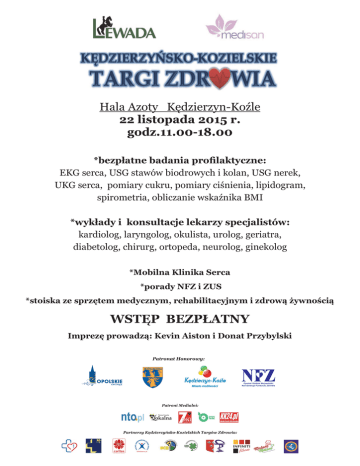 *bezpłatne badania profilaktyczne: EKG serca, USG stawów biodrowych i kolan, USG nerek, UKG serca, pomiary cukru, pomiary ciśnienia, lipidogram, spirometria, obliczanie wskaźnika BMI *wykłady i konsultacje lekarzy specjalistów: kardiolog, laryngolog, okulista, urolog, geriatra, diabetolog, chirurg, ortopeda, neurolog, ginekolog *Mobilna Klinika Serca *porady NFZ i ZUS *stoiska ze sprzętem medycznym, rehabilitacyjnym i zdrową żywnością WSTĘP BEZPŁATNY Imprezę prowadzą: Kevin Aiston i Donat Przybylski