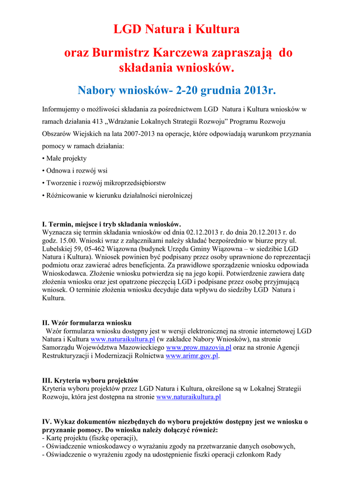 LGD Natura i Kultura oraz Burmistrz Karczewa zapraszają do składania wniosków. Nabory wniosków- 2-20 grudnia 2013r. Informujemy o możliwości składania za pośrednictwem LGD Natura i Kultura wniosków w ramach działania 413 „Wdrażanie Lokalnych Strategii Rozwoju” Programu Rozwoju Obszarów Wiejskich na lata 2007-2013 na operacje, które odpowiadają warunkom przyznania pomocy w ramach działania: • Małe projekty • Odnowa i rozwój wsi • Tworzenie i rozwój mikroprzedsiębiorstw • Różnicowanie w kierunku działalności nierolniczej I. Termin, miejsce i tryb składania wniosków. Wyznacza się termin składania wniosków od dnia 02.12.2013 r. do dnia 20.12.2013 r. do godz. 15.00. Wnioski wraz z załącznikami należy składać bezpośrednio w biurze przy ul. Lubelskiej 59, 05-462 Wiązowna (budynek Urzędu Gminy Wiązowna – w siedzibie LGD Natura i Kultura). Wniosek powinien być podpisany przez osoby uprawnione do reprezentacji podmiotu oraz zawierać adres beneficjenta. Za prawidłowe sporządzenie wniosku odpowiada Wnioskodawca. Złożenie wniosku potwierdza się na jego kopii. Potwierdzenie zawiera datę złożenia wniosku oraz jest opatrzone pieczęcią LGD i podpisane przez osobę przyjmującą wniosek. O terminie złożenia wniosku decyduje data wpływu do siedziby LGD Natura i Kultura. II. Wzór formularza wniosku Wzór formularza wniosku dostępny jest w wersji elektronicznej na stronie internetowej LGD Natura i Kultura www.naturaikultura.pl (w zakładce Nabory Wniosków), na stronie Samorządu Województwa Mazowieckiego www.prow.mazovia.pl oraz na stronie Agencji Restrukturyzacji i Modernizacji Rolnictwa www.arimr.gov.pl. III. Kryteria wyboru projektów Kryteria wyboru projektów przez LGD Natura i Kultura, określone są w Lokalnej Strategii Rozwoju, która jest dostępna na stronie www.naturaikultura.pl IV. Wykaz dokumentów niezbędnych do wyboru projektów dostępny jest we wniosku o przyznanie pomocy. Do wniosku należy dołączyć również: - Kartę projektu (fiszkę operacji), - Oświadczenie wnioskodawcy o wyrażaniu zgody na przetwarzanie danych osobowych, - Oświadczenie o wyrażeniu zgody na udostępnienie fiszki operacji członkom Rady Stowarzyszenia LGD Natura i Kultura, - Oświadczenie o nieubieganiu się o dofinansowanie danej operacji z innych środków pomocowych UE. V. Minimalne wymagania, jakie musi spełnić operacja, aby została wybrana do finansowania przez LGD. 1. Operacja zostanie zakwalifikowana do dofinansowania, jeżeli przyczynia się do osiągnięcia co najmniej jednego celu głównego, co najmniej jednego celu szczegółowego i jest zgodna z co najmniej jednym przedsięwzięciem planowanym w ramach LSR oraz spełnia minimalne wymagania niezbędne do wyboru operacji, które stanowią dla poszczególnych działań: a) Małe projekty - minimum 35 % maksymalnej liczby punktów w ocenie według lokalnych kryteriów wyboru b) Odnowa i rozwój wsi- minimum 45 % maksymalnej liczby punktów w ocenie według lokalnych kryteriów wyboru c) Tworzenie i rozwój mikroprzedsiębiorstw - minimum 45 % maksymalnej liczby punktów w ocenie według lokalnych kryteriów wyboru d) Różnicowanie w kierunku działalności nierolniczej - minimum 45 % maksymalnej liczby punktów w ocenie według lokalnych kryteriów wyboru 2. Pula środków finansowych w ramach naboru nie została wykorzystana na operacje o większej liczbie punktów przyznawanych w ramach oceny zgodności operacji z lokalnymi kryteriami wyboru. VI. Limit dostępnych środków Małe projekty – 76 511,56 zł Odnowa i rozwój wsi- 76 961,30 zł Tworzenie i rozwój mikroprzedsiębiorstw-393 947,54 zł Różnicowanie w kierunku działalności nierolniczej- 226 050,00 zł LGD Natura i Kultura zapewnia bezpłatne doradztwo i pomoc w przygotowaniu wniosku. Adres: ul. Lubelska 59, 05-462 Wiązowna, adres e-mail: [email protected], tel. (22) 610 44 93.