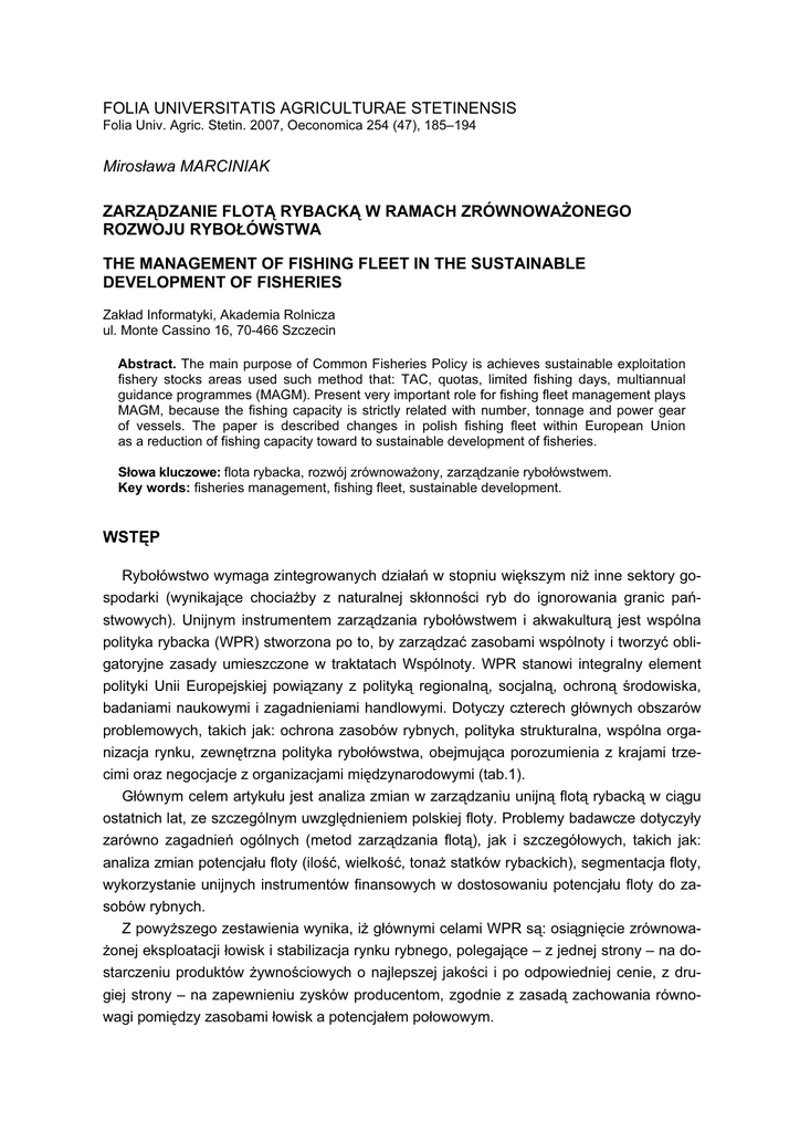 FOLIA UNIVERSITATIS AGRICULTURAE STETINENSIS Folia Univ. Agric. Stetin. 2007, Oeconomica 254 (47), 185–194 Mirosława MARCINIAK ZARZĄDZANIE FLOTĄ RYBACKĄ W RAMACH ZRÓWNOWAŻONEGO ROZWOJU RYBOŁÓWSTWA THE MANAGEMENT OF FISHING FLEET IN THE SUSTAINABLE DEVELOPMENT OF FISHERIES Zakład Informatyki, Akademia Rolnicza ul. Monte Cassino 16, 70-466 Szczecin Abstract. The main purpose of Common Fisheries Policy is achieves sustainable exploitation fishery stocks areas used such method that: TAC, quotas, limited fishing days, multiannual guidance programmes (MAGM). Present very important role for fishing fleet management plays MAGM, because the fishing capacity is strictly related with number, tonnage and power gear of vessels. The paper is described changes in polish fishing fleet within European Union as a reduction of fishing capacity toward to sustainable development of fisheries. Słowa kluczowe: flota rybacka, rozwój zrównoważony, zarządzanie rybołówstwem. Key words: fisheries management, fishing fleet, sustainable development. WSTĘP Rybołówstwo wymaga zintegrowanych działań w stopniu większym niż inne sektory gospodarki (wynikające chociażby z naturalnej skłonności ryb do ignorowania granic państwowych). Unijnym instrumentem zarządzania rybołówstwem i akwakulturą jest wspólna polityka rybacka (WPR) stworzona po to, by zarządzać zasobami wspólnoty i tworzyć obligatoryjne zasady umieszczone w traktatach Wspólnoty. WPR stanowi integralny element polityki Unii Europejskiej powiązany z polityką regionalną, socjalną, ochroną środowiska, badaniami naukowymi i zagadnieniami handlowymi. Dotyczy czterech głównych obszarów problemowych, takich jak: ochrona zasobów rybnych, polityka strukturalna, wspólna organizacja rynku, zewnętrzna polityka rybołówstwa, obejmująca porozumienia z krajami trzecimi oraz negocjacje z organizacjami międzynarodowymi (tab.1). Głównym celem artykułu jest analiza zmian w zarządzaniu unijną flotą rybacką w ciągu ostatnich lat, ze szczególnym uwzględnieniem polskiej floty. Problemy badawcze dotyczyły zarówno zagadnień ogólnych (metod zarządzania flotą), jak i szczegółowych, takich jak: analiza zmian potencjału floty (ilość, wielkość, tonaż statków rybackich), segmentacja floty, wykorzystanie unijnych instrumentów finansowych w dostosowaniu potencjału floty do zasobów rybnych. Z powyższego zestawienia wynika, iż głównymi celami WPR są: osiągnięcie zrównoważonej eksploatacji łowisk i stabilizacja rynku rybnego, polegające – z jednej strony – na dostarczeniu produktów żywnościowych o najlepszej jakości i po odpowiedniej cenie, z drugiej strony – na zapewnieniu zysków producentom, zgodnie z zasadą zachowania równowagi pomiędzy zasobami łowisk a potencjałem połowowym. 186 M. Marciniak Tabela 1. Obszary problemowe wspólnej polityki rybackiej Obszary problemowe Ochrona zasobów rybnych Cele i środki realizacji zadanie: stworzenie takiej ochrony, by narybek nie był wyławiany i mógł swobodnie rosnąć oraz rozmnażać się środki: zbiór zasad zapewniających właściwą ochronę – Kodeks odpowiedzialnego rybołówstwa, Zielona księga rybołówstwa zadanie: dostosowanie struktur (całej infrastruktury: floty, udogodnień portowych, zakładów oraz organizacji procesu produkcyjnego) i zarządzanie ich rozwojem w przemyśle rybnym Polityka strukturalna środki: początkowo modernizacja sektora połowowego (odnowienie floty rybackiej i rozwój akwakultury), od 1983 roku kompleksowa polityka strukturalna obejmująca cały sektor rybołówstwa, polegająca na pomocy w dostosowaniu się do aktualnych warunków poprzez współfinansowanie modernizacji flot połowowych i działań związanych ze zmniejszeniem zdolności połowowej zadanie: zrównoważenie potrzeb rynku Wspólnoty i interesów unijnych rybaków oraz zapewnienie reguł konkurencyjności fair play poprzez utworzenie wspólnego rynku wewnątrz Wspólnoty i dopasowanie wielkości produkcji i popytu Wspólna organizacja rynku środki: wspólne standardy marketingowe dla świeżych produktów oparte na jakości, skali, odpowiednim opakowaniu i etykiecie: – organizacje producenckie, dobrowolne powiązania rybaków umożliwiające stabilizowanie rynku, w tym ochronę przed nagłymi zmianami popytu – system cen (minimalne, wycofania) – reguły handlu z krajami niebędącymi członkami Wspólnoty zadanie: uzyskanie praw do użytkowania łowisk pozaeuropejskich dla unijnych trawlerów Zewnętrzna polityka rybacka środki: negocjacje zasad wynagradzania krajów trzecich za udostępnianie łowisk oraz udział w międzynarodowych negocjacjach z międzynarodowymi i regionalnymi organizacjami rybackimi w zakresie zrównoważonego wykorzystania i zarządzania zasobami rybnymi MATERIAŁ I METODY Materiał badawczy stanowiły raporty i dokumenty europejskich grup roboczych i komitetów działających przy Komisji Europejskiej, dane Ministerstwa Rolnictwa i Rozwoju Wsi, opracowania statystyczne Morskiego Instytutu Rybackiego w Gdyni, Raport NIK z realizacji sektorowego programu operacyjnego dla rybołówstwa, czasopisma branżowe (Wiadomości Rybackie) oraz źródła internetowe. W pracy zastosowano metody statystyki opisowej, analizy porównawczej oraz ogólne metody badawcze (indukcji i dedukcji). WYNIKI I DYSKUSJA W zarządzaniu rybołówstwem stosowane są różne metody, w zależności od stanu zasobów rybnych i potrzeb krajów członkowskich (np. limity połowowe, selektywne narzędzia połowowe, długoletnie programy rozwoju flot rybackich i instrumenty finansowe). W rozwoju zrównoważonym rybołówstwa morskiego szczególnie istotną rolę odgrywają wieloletnie plany rozwoju flot, wspierane finansowo przez rybackie instrumenty finansowe (np. FIFG, EFR). Planowanie zrównoważonego rozwoju flot wszystkich państw członkowskich odbywa się na podstawie wieloletnich programów rozwoju flot MAGP (ang. MultiAnnual Guida