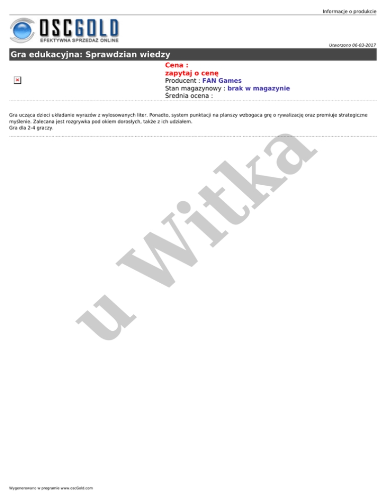Informacje o produkcie Utworzono 06-03-2017 Gra edukacyjna: Sprawdzian wiedzy Cena : zapytaj o cenę Producent : FAN Games Stan magazynowy : brak w magazynie Średnia ocena : u W it ka Gra ucząca dzieci układanie wyrazów z wylosowanych liter. Ponadto, system punktacji na planszy wzbogaca grę o rywalizację oraz premiuje strategiczne myślenie. Zalecana jest rozgrywka pod okiem dorosłych, także z ich udziałem. Gra dla 2-4 graczy. Wygenerowano w programie www.oscGold.com