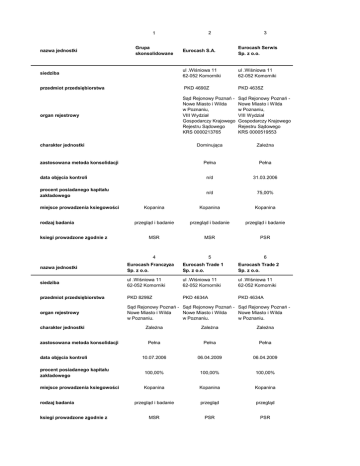 2 1 Eurocash S.A. Eurocash Serwis Sp. z o.o. siedziba ul .Wiśniowa 11 62-052 Komorniki ul .Wiśniowa 11 62-052 Komorniki przedmiot przedsiębiorstwa PKD 4690Z PKD 4635Z organ rejestrowy Sąd Rejonowy Poznań Nowe Miasto i Wilda w Poznaniu, VIII Wydział Gospodarczy Krajowego Rejestru Sądowego KRS 0000213765 Sąd Rejonowy Poznań Nowe Miasto i Wilda w Poznaniu, VIII Wydział Gospodarczy Krajowego Rejestru Sądowego KRS 0000519553 Dominująca Zależna Pełna Pełna data objęcia kontroli n/d 31.03.2006 procent posiadanego kapitału zakładowego n/d 75,00% Kopanina Kopanina Kopanina przegląd i badanie przegląd i badanie przegląd i badanie MSR MSR PSR 4 5 6 nazwa jednostki Grupa skonsolidowane 3 charakter jednostki zastosowana metoda konsolidacji miejsce prowadzenia ksiegowości rodzaj badania ksiegi prowadzone zgodnie z nazwa jednostki Eurocash Franczyza Sp. z o.o. Eurocash Trade 1 Sp. z o.o. Eurocash Trade 2 Sp. z o.o. siedziba ul .Wiśniowa 11 62-052 Komorniki ul .Wiśniowa 11 62-052 Komorniki ul .Wiśniowa 11 62-052 Komorniki przedmiot przedsiębiorstwa PKD 8299Z PKD 4634A PKD 4634A organ rejestrowy Sąd Rejonowy Poznań - Sąd Rejonowy Poznań - Sąd Rejonowy Poznań Nowe Miasto i Wilda Nowe Miasto i Wilda Nowe Miasto i Wilda w Poznaniu, w Poznaniu, w Poznaniu, Zależna Zależna Zależna Pełna Pełna Pełna 10.07.2006 06.04.2009 06.04.2009 procent posiadanego kapitału zakładowego 100,00% 100,00% 100,00% miejsce prowadzenia ksiegowości Kopanina Kopanina Kopanina przegląd i badanie przegląd przegląd MSR PSR PSR charakter jednostki zastosowana metoda konsolidacji data objęcia kontroli rodzaj badania ksiegi prowadzone zgodnie z 7 8 9 nazwa jednostki Eurocash VC2 Sp. z o.o. Premium Distributors Sp. z o.o. Przedsiębiorstwo Handlu Spożywczego Sp. z o.o. siedziba ul .Wiśniowa 11 62-052 Komorniki ul. Bokserska 66a 02-690 Warszawa ul .Wiśniowa 11 62-052 Komorniki przedmiot przedsiębiorstwa PKD 7740Z PKD 4634A PKD 4690Z organ rejestrowy Sąd Rejonowy Poznań Nowe Miasto i Wilda w Poznaniu, VIII Wydział Gospodarczy Krajowego Rejestru Sądowego KRS 0000529945 Sąd Rejonowy dla m. st. Warszawy w Warszawie, XIII Wydział Gospodarczy Krajowego Rejestru Sądowego, KRS 0000287947 Sąd Rejonowy Poznań Nowe Miasto i Wilda w Poznaniu, VIII Wydział Gospodarczy Krajowego Rejestru Sądowego KRS 0000203619 Zależna Zależna Zależna Pełna Pełna Pełna 03.11.2014 02.08.2010 02.08.2010 procent posiadanego kapitału zakładowego 100,00% 100,00% 100,00% miejsce prowadzenia ksiegowości Kopanina Kopanina Kopanina rodzaj badania przegląd przegląd przegląd PSR PSR PSR charakter jednostki zastosowana metoda konsolidacji data objęcia kontroli ksiegi prowadzone zgodnie z 10 nazwa jednostki siedziba przedmiot przedsiębiorstwa organ rejestrowy charakter jednostki zastosowana metoda konsolidacji data objęcia kontroli procent posiadanego kapitału zakładowego miejsce prowadzenia ksiegowości rodzaj badania ksiegi prowadzone zgodnie z DEF Sp. z o.o. ul. Handlowa 6 15-399 Białystok PKD 4639Z Sąd Rejonowy w Białymstoku, XII Wydział Gospodarczy KRS 0000048125 Zależna 11 Detal Podlasie Sp. z o.o. ul. Sokólska 9 15-865 Białystok PKD 4711Z Sąd Rejonowy w Białymstoku, XII Wydział Gospodarczy KRS 0000033766 Zależna 12 Lewiatan Podlasie Sp. z o.o. Porosły 70A 16-070 Choroszcz PKD 47 Sąd Rejonowy w Białymstoku, XII Wydział Gospodarczy KRS 0000508176 Zależna Pełna Pełna Pełna 21.12.2011 21.12.2011 18.03.2014 100,00% 100,00% 100,00% Kopanina przegląd i badanie MSR zewnętrzna, siedziba spółki przegląd i badanie MSR Kopanina przegląd i badanie MSR 13 nazwa jednostki Euro Sklep S.A. siedziba ul. Bystrzańska 94a 43-309 Bielsko-Biała przedmiot przedsiębiorstwa PKD 4711Z organ rejestrowy Sąd Rejonowy w Bielsku Białej, VIII Wydział Gospodarczy KRS 0000012291 charakter jednostki zastosowana metoda konsolidacji data objęcia kontroli procent posiadanego kapitału zakładowego miejsce prowadzenia ksiegowości rodzaj badania ksiegi prowadzone zgodnie z nazwa jednostki siedziba przedmiot przedsiębiorstwa organ rejestrowy charakter jednostki Zależna 14 Ambra Sp. z o.o. 15 Lewiatan Śląsk Sp. z o.o. ul. Hutnicza 7 ul. Lenartowicza 39 43-502 Czechowice41-219 Sosnowiec Dziedzice PKD 4645Z PKD 7022Z Sąd Rejonowy Katowice - Sąd Rejonowy Katowice Wschód Wschód w Katowicach, VIII w Katowicach, VIII Wydział Gospodarczy Wydział Gospodarczy Krajowego Rejestru Krajowego Rejestru Sądowego Sądowego KRS 0000254307 KRS 0000175768 Zależna Zależna Pełna Pełna Pełna 21.12.2011 21.12.2011 21.12.2011 100,00% 100,00% 100,00% przegląd i badanie MSR zewnętrzna, siedziba spółki przegląd i badanie PSR przegląd i badanie MSR 16 17 18 Kopanina Kopanina Lewiatan Orbita Sp. z o.o. Lewiatan Kujawy Sp. z o.o. Lewiatan Wielkopolska Sp. z o.o. ul. Lubelska 33/15 10-410 Olsztyn PKD 4690Z ul. Polna 4-8 87-800 Włocławek PKD 4711Z Os. Winiary 54 60-665 Poznań PKD 7740Z Sąd Rejonowy w Olsztynie, VIII Wydział Gospodarczy Krajowego Rejestru Sądowego, KRS 0000039244 Sąd Rejonowy w Toruniu, VII Wydział Gospodarczy Krajowego Rejestru Sądowego KRS 0000109502 Sąd Rejonowy Poznań Nowe Miasto i Wilda w Poznaniu, VIII Wydział Gospodarczy Krajowego Rejestru Sądowego KRS 0000133384 Zależna Zależna Zależna Pełna Pełna Pełna 21.12.2011 21.12.2011 21.12.2011 100,00% 100,00% 100,00% miejsce prowadzenia ksiegowości Kopanina Kopanina Kopanina rodzaj badania ksiegi prowadzone zgodnie z przegląd PSR przegląd i badanie PSR przegląd PSR zastosowana metoda konsolidacji data objęcia kontroli procent posiadanego kapitału zakładowego 19 nazwa jednostki Lewiatan Opole Sp. z o.o. siedziba ul. Światowida 2 45-325 Opole przedmiot przedsiębiorstwa PKD 7740Z organ rejestrowy Sąd Rejonowy w Opolu, VIII Wydział Gospodarczy Krajowego Rejestru Sądowego KRS 0000043199 20 Lewiatan Zachód Sp. z o.o. ul. Przemysłowa 5 73-110 Stargard Szczeciński PKD 6419Z Sąd Rejonowy w Szczecinie - Centrum w Szczecinie, XIII W