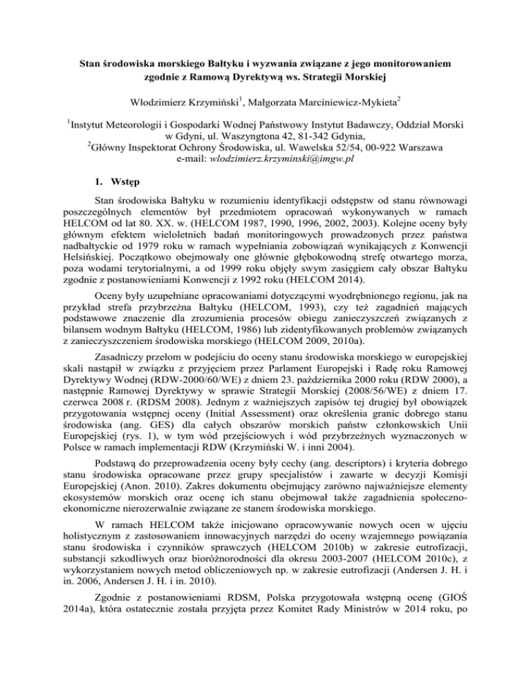 Stan środowiska morskiego Bałtyku i wyzwania związane z jego monitorowaniem zgodnie z Ramową Dyrektywą ws. Strategii Morskiej Włodzimierz Krzymiński1, Małgorzata Marciniewicz-Mykieta2 1 Instytut Meteorologii i Gospodarki Wodnej Państwowy Instytut Badawczy, Oddział Morski w Gdyni, ul. Waszyngtona 42, 81-342 Gdynia, 2 Główny Inspektorat Ochrony Środowiska, ul. Wawelska 52/54, 00-922 Warszawa e-mail: [email protected] 1. Wstęp Stan środowiska Bałtyku w rozumieniu identyfikacji odstępstw od stanu równowagi poszczególnych elementów był przedmiotem opracowań wykonywanych w ramach HELCOM od lat 80. XX. w. (HELCOM 1987, 1990, 1996, 2002, 2003). Kolejne oceny były głównym efektem wieloletnich badań monitoringowych prowadzonych przez państwa nadbałtyckie od 1979 roku w ramach wypełniania zobowiązań wynikających z Konwencji Helsińskiej. Początkowo obejmowały one głównie głębokowodną strefę otwartego morza, poza wodami terytorialnymi, a od 1999 roku objęły swym zasięgiem cały obszar Bałtyku zgodnie z postanowieniami Konwencji z 1992 roku (HELCOM 2014). Oceny były uzupełniane opracowaniami dotyczącymi wyodrębnionego regionu, jak na przykład strefa przybrzeżna Bałtyku (HELCOM, 1993), czy też zagadnień mających podstawowe znaczenie dla zrozumienia procesów obiegu zanieczyszczeń związanych z bilansem wodnym Bałtyku (HELCOM, 1986) lub zidentyfikowanych problemów związanych z zanieczyszczeniem środowiska morskiego (HELCOM 2009, 2010a). Zasadniczy przełom w podejściu do oceny stanu środowiska morskiego w europejskiej skali nastąpił w związku z przyjęciem przez Parlament Europejski i Radę roku Ramowej Dyrektywy Wodnej (RDW-2000/60/WE) z dniem 23. października 2000 roku (RDW 2000), a następnie Ramowej Dyrektywy w sprawie Strategii Morskiej (2008/56/WE) z dniem 17. czerwca 2008 r. (RDSM 2008). Jednym z ważniejszych zapisów tej drugiej był obowiązek przygotowania wstępnej oceny (Initial Assessment) oraz określenia granic dobrego stanu środowiska (ang. GES) dla całych obszarów morskich państw członkowskich Unii Europejskiej (rys. 1), w tym wód przejściowych i wód przybrzeżnych wyznaczonych w Polsce w ramach implementacji RDW (Krzymiński W. i inni 2004). Podstawą do przeprowadzenia oceny były cechy (ang. descriptors) i kryteria dobrego stanu środowiska opracowane przez grupy specjalistów i zawarte w decyzji Komisji Europejskiej (Anon. 2010). Zakres dokumentu obejmujący zarówno najważniejsze elementy ekosystemów morskich oraz ocenę ich stanu obejmował także zagadnienia społecznoekonomiczne nierozerwalnie związane ze stanem środowiska morskiego. W ramach HELCOM także inicjowano opracowywanie nowych ocen w ujęciu holistycznym z zastosowaniem innowacyjnych narzędzi do oceny wzajemnego powiązania stanu środowiska i czynników sprawczych (HELCOM 2010b) w zakresie eutrofizacji, substancji szkodliwych oraz bioróżnorodności dla okresu 2003-2007 (HELCOM 2010c), z wykorzystaniem nowych metod obliczeniowych np. w zakresie eutrofizacji (Andersen J. H. i in. 2006, Andersen J. H. i in. 2010). Zgodnie z postanowieniami RDSM, Polska przygotowała wstępną ocenę (GIOŚ 2014a), która ostatecznie została przyjęta przez Komitet Rady Ministrów w 2014 roku, po przeprowadzeniu konsultacji społecznych, co także było novum w procesie jej przygotowywania. Rys. 1. Zasięg obszarów morskich podlegających monitoringowi i ocenie zgodnie z Ramową Dyrektywą Wodną i Ramową Dyrektywą ws. Strategii Morskich. Źródło: oprac. własne wg RDW i RDSM 2. Ocena stanu „Wstępna ocena stanu środowiska wód morskich polskiej strefy morza Bałtyckiego” (GIOŚ 2014a) będąca kompleksowym opracowaniem dotyczącym polskich obszarów morskich jest wynikiem złożenia trzech prac wykonanych przez różne zespoły specjalistów z Oddziału Morskiego Instytutu Meteorologii i Gospodarki Wodnej PIB i Instytutu Morskiego w Gdańsku, Morskiego Instytutu Badawczego PIB oraz Ogólnopolskiego Towarzystwa Ochrony Ptaków z ramach umów z GIOŚ. Kolejne oceny są to coroczne opracowania wydawane od 2013 roku w formie publikacji książkowej, zawierające odrębne oceny poświęcone wodom przejściowym i przybrzeżnych oraz strefie otwartego morza (GIOŚ 2014b). Wstępna ocena stanu środowiska wód morskich została wykonana dla 11 cech – wskaźników opisowych: C1 – różnorodność biologiczna, C2 – gatunki obce, C3 – komercyjnie eksploatowane gatunki ryb i bezkręgowców, C4 – łańcuchy pokarmowe, C5 – eutrofizacja, C6 – integralność dna morskiego, C7 – warunki hydrograficzne, C8 – substancje zanieczyszczające i efekty zanieczyszczeń, C9 – substancje szkodliwe w rybach i owocach morza, C10 – śmieci w środowisku morskim, C11 – podwodny hałas i inne źródła energii. Wskaźniki opisowe (cechy) można podzielić na dwie grupy: wskaźników stanu (C1, C3, C4 i C6) oraz wskaźników presji (C2, C5, C7, C8, C9, C10 i C11). Wskaźniki opisowe wymienione w Decyzji Komisji (Anon. 2010) zostały zweryfikowane przez grupę roboczą HELCOM CORESET BD, która zaproponowała dla obszaru Morza Bałtyckiego zestaw wskaźników podstawowych tzw. core indicators. Harmonizacja regionalna dotyczyła również wydzielenia w Bałtyku wspólnych większych obszarów (podregionów) podlegających ocenie (rys. 2, tab. 1). Rys. 2. Podakweny Morza Bałtyckiego wyznaczone w polskich obszarach morskich wg HELCOM CORESET BD oraz dodatkowe podakweny 38A i 35A przyjęte w ocenie. Źródło: oprac. własne na podstawie GIOŚ Tabela 1. Podakweny Morza Bałtyckiego wyznaczone wg HELCOM CORESET BD 2/2011 wraz z zaproponowanymi podakwenami w polskich obszarach morskich: 35A – polska część Zalewu Wiślanego i 38A – polska część Zalewu Szczecińskiego (GIOŚ 2014). Nu mer podakwenu Nazwa angielska Eastern Baltic Proper Offshore waters 33 Gulf of Gdańsk Offshore waters Gulf of Gdańsk Polish Coastal 35 waters 36 Bornholm Basin Offshor