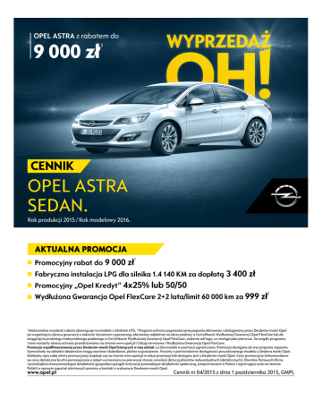 OPEL ASTRA z rabatem do 9 000 zł 1 CENNIK OPEL ASTRA SEDAN. Rok produkcji 2015 / Rok modelowy 2016. AKTUALNA PROMOCJA Promocyjny rabat do 9 000 zł 1 Fabryczna instalacja LPG dla silnika 1.4 140 KM za dopłatą 3 400 zł Promocyjny „Opel Kredyt” 4x25% lub 50/50 Wydłużona Gwarancja Opel FlexCare 2+2 lata/limit 60 000 km za 999 zł 2 1 Maksymalna wysokość rabatu obowiązuje na modele z silnikiem LPG. 2 Program ochrony pogwarancyjnej pojazdu oferowany i obsługiwany przez Dealerów marki Opel po wygaśnięciu okresu gwarancji o zakresie tożsamym z gwarancją, oferowany odpłatnie na okres podany w Certyfikacie Wydłużonej Gwarancji Opel FlexCare lub do osiągnięcia przebiegu maksymalnego podanego w Certyfikacie Wydłużonej Gwarancji Opel FlexCare, zależnie od tego, co nastąpi jako pierwsze. Szczegóły programu i inne warianty okresu ochrony przedstawiamy na stronie www.opel.pl / Usługi serwisowe / Wydłużona Gwarancja Opel FlexCare. Promocja współfinansowana przez Dealerów marki Opel biorących w niej udział. Liczba modeli w promocji ograniczona. Promocja dostępna do wyczerpania zapasów. Samochody na składzie dealerskim mogą zawierać dodatkowe, płatne wyposażenie. Prosimy o potwierdzenie dostępności poszukiwanego modelu u Dealera marki Opel. Dokładny opis całej oferty promocyjnej znajduje się na stronie www.opel.pl w sekcji promocje lub dostępny jest u Dealerów marki Opel. Ceny promocyjne (rekomendowane ceny detaliczne brutto pomniejszone o rabat wymieniony na pierwszej stronie cennika) dotyczą klientów indywidualnych (detalicznych). Klientów flotowych (firmy i przedsiębiorstwa prowadzące działalność gospodarczą bądź instytucje prowadzące działalność społeczną, zarejestrowane w Polsce i rejestrujące auto na terenie Polski) w sprawie zapytań ofertowych prosimy o kontakt z wybranym Dealerem marki Opel. www.opel.pl Cennik nr 04/2015 z dnia 1 października 2015, GMPL Cennik – Opel Astra Sedan Rok produkcji 2015, rok modelowy 2016 Ceny promocyjne* Sedan 1.6 Twinport 115 KM M5 53 900 1.6 Twinport 115 KM A6 58 900 1.4 Turbo 140 KM** M6 58 900 1.4 Turbo 140 KM A6 63 900 1.4 Turbo 140 KM LPGTEC M6 62 300 1.6 CDTI 110 KM Start/Stop M6 65 700 1.6 CDTI 136 KM Start/Stop M6 68 100 * Promocja współfinansowana przez Dealerów marki Opel biorących w niej udział. Liczba modeli w promocji ograniczona. Promocja dostępna do wyczerpania zapasów. Samochody na składzie dealerskim mogą zawierać dodatkowe, płatne wyposażenie. Prosimy o potwierdzenie dostępności poszukiwanego modelu u Dealera marki Opel. Dokładny opis całej oferty promocyjnej znajduje się na stronie www.opel.pl w sekcji promocje lub dostępny jest u Dealerów marki Opel. Ceny promocyjne (rekomendowane ceny detaliczne brutto pomniejszone o rabat wymieniony na pierwszej stronie cennika) dotyczą klientów indywidualnych (detalicznych). Klientów flotowych (firmy i przedsiębiorstwa prowadzące działalność gospodarczą bądź instytucje prowadzące działalność społeczną, zarejestrowane w Polsce i rejestrujące auto na terenie Polski) w sprawie zapytań ofertowych prosimy o kontakt z wybranym Dealerem marki Opel. Ceny katalogowe Sedan 1.6 Twinport 115 KM M5 59 900 1.6 Twinport 115 KM A6 64 900 1.4 Turbo 140 KM** M6 64 900 1.4 Turbo 140 KM A6 69 900 1.4 Turbo 140 KM LPGTEC M6 71 300 1.6 CDTI 110 KM Start/Stop M6 71 700 1.6 CDTI 136 KM Start/Stop M6 74 100 ** Silnik dostępny z systemem Start/Stop – dopłata 1 400 zł . Cennik Opla Astry Sedan, rok produkcji 2015, rok modelowy 2016A, nr 04/2015 z dnia 1 października 2015 1/4 Wyposażenie standardowe Układ stabilizacji toru jazdy ESP z TCS i ABS System monitorujący ciśnienie w oponach Przednie, boczne oraz kurtynowe poduszki powietrzne kierowcy i pasażera Klimatyzacja sterowana ręcznie Elektrycznie sterowane szyby przednie i tylne Elektrycznie sterowane i podgrzewane lusterka zewnętrzne w kolorze nadwozia Tapicerka materiałowa, czarna Fotel kierowcy z regulacją wysokości Tylne siedzenia dzielone w proporcji 40/60 Zaczepy Isofix w oparciach tylnych zewnętrznych siedzeń Aktywne zagłówki foteli przednich Radioodtwarzacz CD/MP3 300 z 4 głośnikami, złączem AUX-in Przyciski sterowania na kierownicy Kolumna kierownicy regulowana w pionie i poziomie Komputer pokładowy, wyświetlacz graficzny wskaźników kierowcy Tempomat z ogranicznikiem prędkości Światła do jazdy dziennej Felgi stalowe 16" Zamek centralny Sedan FX3 UJM AYC C67 AEF/AXG+AER DWE TAJI/TANL AH3 A64 AHN AJF UYB+UW4+TTX UC3 N37 U68 +UDC K33 T3N PWM S S S S S S S S S S S S S S S S S S S Wyposażenie dodatkowe NADWOZIE Lakier metaliczny / perłowy / opalizujący Chromowane zewnętrzne listwy dookoła okien bocznych Elektrycznie składane lusterka boczne Okno dachowe. Zawiera: Lampki do czytania z tyłu. Światła do jazdy dziennej w technologii LED Reflektory przeciwmgielne Reflektory bi-ksenonowe AFL ze spryskiwaczami, automatycznym sterowaniem światłami drogowymi. Światła do jazdy dziennej typu LED. Zawierają: Pakiet Dobrej Widoczności. Felgi aluminiowe 16" Felgi aluminiowe 17" Zapasowe kolo dojazdowe, stalowe 16" Pełnowymiarowe kolo zapasowe, stalowe 16" WNĘTRZE Tapicerka materiałowa, czarna, z ergonomicznymi sportowymi fotelami przednimi (dostępna tylko z „Pakietami Foteli Ergonomicznych”) Klimatyzacja sterowana elektronicznie dwustrefowa Konsola centralna z przesuwanym podłokietnikiem i zamykanym schowkiem Kierownica pokryta skórą Podgrzewane przednie fotele Podgrzewanie kierownicy. Zawiera: podgrzewane fotele przednie (tylko z kierownicą N34) Dodatkowe elektryczne ogrzewanie w systemie nawiewu powietrza (standard tylko z silnikami diesla, niedostępne w wersji LPG) Ogrzewanie postojowe. Zawiera: klimatyzację dwustrefową (niedostępne w wersji LPG) Pakiet dla palących (popielniczka i zapalniczka) Radioodtwarzacz CD400 IntelliLink z łączami Bluetooth®, AUX-in. Zawiera: 6 głośników (standard tylko dla wersji LPG) System 
