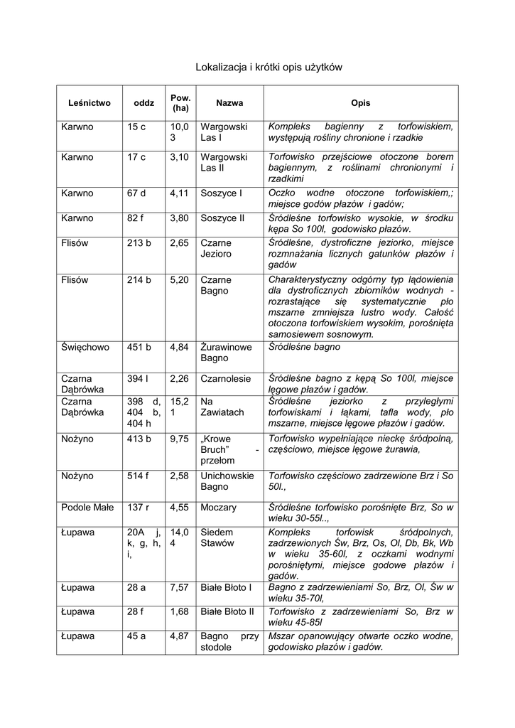 Lokalizacja i krótki opis użytków Leśnictwo oddz Pow. (ha) Nazwa Opis Karwno 15 c 10,0 3 Wargowski Las I Kompleks bagienny z torfowiskiem, występują rośliny chronione i rzadkie Karwno 17 c 3,10 Wargowski Las II Torfowisko przejściowe otoczone borem bagiennym, z roślinami chronionymi i rzadkimi Karwno 67 d 4,11 Soszyce I Karwno 82 f 3,80 Soszyce II Flisów 213 b 2,65 Czarne Jezioro Oczko wodne otoczone torfowiskiem,; miejsce godów płazów i gadów; Śródleśne torfowisko wysokie, w środku kępa So 100l, godowisko płazów. Śródleśne, dystroficzne jeziorko, miejsce rozmnażania licznych gatunków płazów i gadów Flisów 214 b 5,20 Czarne Bagno Święchowo 451 b 4,84 Żurawinowe Bagno Czarna Dąbrówka Czarna Dąbrówka 394 l 2,26 Czarnolesie 398 d, 15,2 404 b, 1 404 h Na Zawiatach Nożyno 413 b 9,75 „Krowe Bruch” przełom Nożyno 514 f 2,58 Unichowskie Bagno Podole Małe 137 r 4,55 Moczary Łupawa 20A j, 14,0 k, g, h, 4 i, Łupawa 28 a 7,57 Łupawa 28 f 1,68 Łupawa 45 a 4,87 Charakterystyczny odgórny typ lądowienia dla dystroficznych zbiorników wodnych rozrastające się systematycznie pło mszarne zmniejsza lustro wody. Całość otoczona torfowiskiem wysokim, porośnięta samosiewem sosnowym. Śródleśne bagno Śródleśne bagno z kępą So 100l, miejsce lęgowe płazów i gadów. Śródleśne jeziorko z przyległymi torfowiskami i łąkami, tafla wody, pło mszarne, miejsce lęgowe płazów i gadów. Torfowisko wypełniające nieckę śródpolną, - częściowo, miejsce lęgowe żurawia, Torfowisko częściowo zadrzewione Brz i So 50l., Śródleśne torfowisko porośnięte Brz, So w wieku 30-55l.., Kompleks torfowisk śródpolnych, Siedem zadrzewionych Św, Brz, Os, Ol, Db, Bk, Wb Stawów w wieku 35-60l, z oczkami wodnymi porośniętymi, miejsce godowe płazów i gadów. Bagno z zadrzewieniami So, Brz, Ol, Św w Białe Błoto I wieku 35-70l, Białe Błoto II Torfowisko z zadrzewieniami So, Brz w wieku 45-85l Bagno przy Mszar opanowujący otwarte oczko wodne, godowisko płazów i gadów. stodole Bocianie Bagno Łąki nad Ciekiem Gogolewskim Śródleśne, zanikające oczko wodne, otoczone płem mszarnym, Przepływowe torfowisko soligeniczne z roślinnością mechowiskową oraz torfowisko fluwiogeniczne z turzycowiskiem, 4,26 Torfowisko Wieliszewo 1 Torfowisko wysokie, z zadrzewieniami So, Brz 100l; 1,39 Torfowisko Wieliszewo 2 Torfowisko Wieliszewo 3 Torfowisko Wieliszewo 4 Torfowisko wysokie, z zadrzewieniami So, Brz 100l, Św 50l; Torfowisko wysokie, z zadrzewieniami So 40l; Torfowisko wysokie, z zadrzewieniami So 40l, 65l, 85l; Torfowisko Wieliszewo 5 Torfowisko Wieliszewo 6 Torfowisko Wieliszewo 7 Torfowisko Wieliszewo 8 Torfowisko Dobra Torfowisko wysokie, z zadrzewieniami So 70l, 110l; Torfowisko wysokie, z zadrzewieniami So 70l, 110l; Torfowisko wysokie, z zadrzewieniami So 60l, 80l, Św 35l; Torfowisko wysokie, z zadrzewieniami So 90l, 130l, Brz 90l; Torfowisko przejściowe, z zadrzewieniami So 50l, Brz 30l oraz samosiewem So i Brz 5-20l; 1,93 Torfowisko Flisów 1 Dystroficzne, śródleśne jeziorko z fragmentami pła mszarnego, miejsce godowe płazów i gadów. 0,20 Torfowisko Flisów 2 Niewielkie oczko wodne, zarastające mszarem przejściowym; stanowisko płazów i gadów. Gogolewo 91 b Gogolewo 332 A 22,8 c, d, f, 8 g, i, j, k, l, m, o, p, ~a, ~b, ~c, Podole Małe 100 b Podole Małe 100 j Podole Małe Podole Małe 101 f 0,50 01 101 f 1,22 99, 146 a 146 k 0,60 Podole Małe 187 b 0,37 Podole Małe 187 j 0,60 Podole Małe 286 i 3,45 Podole Małe 137 g 0,83 Flisów 192 c Flisów 236 c Podole Małe 2,57