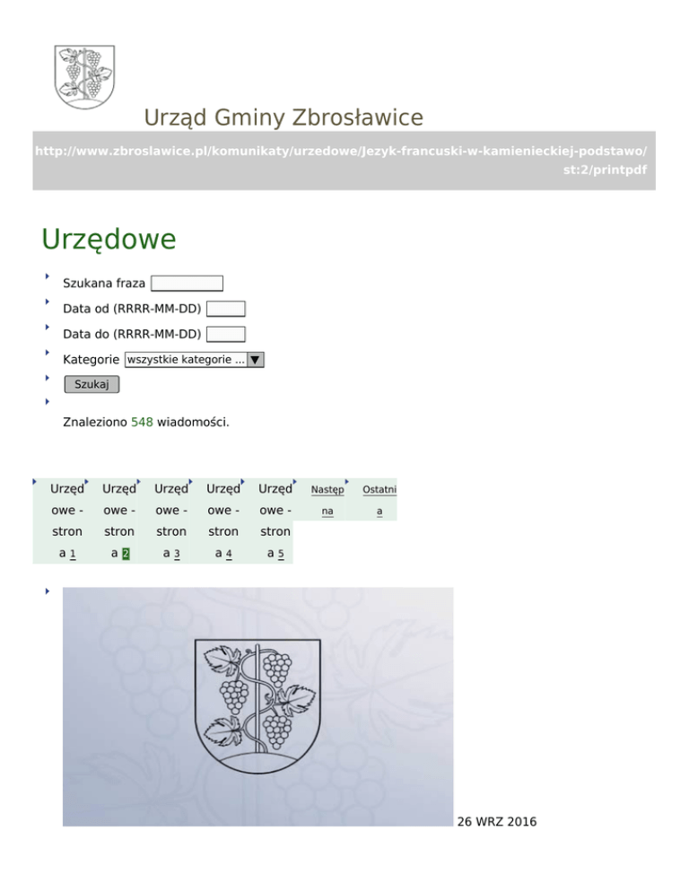 Urząd Gminy Zbrosławice http://www.zbroslawice.pl/komunikaty/urzedowe/Jezyk-francuski-w-kamienieckiej-podstawo/ st:2/printpdf Urzędowe Szukana fraza Data od (RRRR-MM-DD) Data do (RRRR-MM-DD) Kategorie wszystkie kategorie ... ▼ Szukaj Znaleziono 548 wiadomości. Urzęd Urzęd Urzęd Urzęd Urzęd Następ Ostatni owe - owe - owe - owe - owe - na a stron stron stron stron stron a3 a4 a5 a1 a 2 26 WRZ 2016 INFORMACJA - SPADEK CIŚNIENIA WODY W MIEDARACH kategoria: Aktualności Zakład Gospodarki Komunalnej i Mieszkaniowej w Zbrosławicach zawiadamia, że w dniach: 27 i 28.09.2016 w godzinach od 9 00 w dniu 27.09-2016 do godziny 17 00 w dniu 28.09.2016 wystąpi spadek ciśnienia wody na sieci z powodu prac na ujęciu wody. 23 WRZ 2016 Bezpłatne badania profilaktyczne USG piersi kategoria: Aktualności Dla kobiet z terenu Gminy Zbrosławice w wieku od 20 do 49 roku życia (rocznik:1967-1996) 21 WRZ 2016 Sprzedzaż nieruchomości - w Łubiu i Szałszy kategoria: Aktualności W dniu 27 października 2016r. w Centrum Usług Publicznych w Zbrosławicach, przy ul. Oświęcimskiej 2, rozpocznie się pierwszy ustny przetarg nieograniczony na sprzedaż prawa własności nieruchomości gruntowych niezabudowanych położonych w obrębie Łubie (k.m. 1) określonych następującymi numerami działek: 20 WRZ 2016 kategoria: Szansa na remont łazienki szkolnej w Wieszowie Komunikaty urzędowe Szkoła w Wieszowie przystąpiła do konkursu WZOROWA ŁAZIENKA. Konkurs wygrywa szkoła, która uzyska największą liczbę głosów w głosowaniu internetowym. Przekażcie znajomym i przyjaciołom! Głosujcie na Szkołę w Wieszowie codziennie do 30.10.2016 Link do strony: https://www.wzorowalazienka.pl/ 19 WRZ 2016 Przerwa w dostawie wody w Ptakowicach kategoria: Komunikaty urzędowe Zakład Gospodarki Komunalnej i Mieszkaniowej zawiadamia, że w dniu: 20.09.2016 w godzinach od 8 00 do 15 00 wystąpi przerwa w dostawie wody w Ptakowicach, z powodu prac na sieci wodociągowej. W wyniku wykonywanych prac mogą wystąpić zabrudzenia wody spowodowane zaburzeniami przepływów na sieci. Przepraszamy za utrudnienia. 16 WRZ 2016 kategoria: Zebrania Wiejskie Komunikaty urzędowe Prezentujemy listę pozostałych zebrań wiejskich. 19 września o godz. 18:00 w Kamieńcu (Zespół Szkół Ogólnokształcących w Kamieńcu), 20 września o godz. 18:00 w Karchowicach (Zajaz u Rysia), 21 września o godz. 17:00 w Zawadzie (Plac Zabaw), 21 września o godz. 18:00 w Łubiu (Dom Parafialny), 22 września o godz. 17:45 w Zbrosławicach (Centrum Usług Publicznych), 22 września o godz. 18:00 w 16 WRZ 2016 Działo się! kategoria: Aktualności TRZECIA EDYCJA ŚWIĘTA GMINY ZBROSŁAWICE PRZESZŁA DO HISTORII. BYŁO BARWNIE, RÓŻNORODNIE, TŁOCZNO I UROCZYŚCIE. 09 WRZ 2016 kategoria: Zebrania Wiejskie Komunikaty urzędowe Prezentujemy listę najbliższych zebrań wiejskich. Terminy pozostałych można odszukać w kalendarzu w lewej części strony. 12 września o godz. 18:00 w Boniowicach (Zespół Szkół Ogólnokształcących w Kamieńcu), 13 września o godz. 18:00 w Przezchlebiu (świetlica), 14 września o godz. 18:00 w Łubkach (siedziba Koła Łowieckiego), 15 września o godz. 18:00 w Szałszy (siedziba OSP), 16 września 05 WRZ 2016 Zebrania Wiejskie kategoria: Komunikaty urzędowe Rozpoczął się cykl zebrań wiejskich w sołectwach Gminy Zbrosławice, których głównym celem będzie rozdysponowanie funduszu sołeckiego na rok 2017. Za nami zebrania w Świętoszowicach i Ziemięcicach, a w tym tygodniu odbędzie się pięć kolejnych spotkań: 5 września o godz. 18:00 w Księżym Lesie (siedziba OSP), 6 września o godz. 18:00 w Miedarach (świetlica), 7 września o godz. 18:00 w Jasionie 02 WRZ 2016 kategoria: Opóźnienie w wydawaniu kart śKUP Komunikaty urzędowe W związku z kłopotami technicznymi wynikającymi z przyłączenia MZKP do systemu ŚKUP nastąpiło opóźnienie w wydawaniu przez MZKP kart ŚKUP z biletem szkolnym dla uczniów szkół podstawowych i gimnazjów zlokalizowanych na terenie gmin należących do MZKP. W związku z powyższym Dyrekcja MZKP informuje, że uczniowie ww. szkół będą mogli korzystać od 1.09.2016r do 16.09.2016r z przejazdów komunikacją miejską na trasie Urzęd Urzęd Urzęd Urzęd Urzęd Następ Ostatni owe - owe - owe - owe - owe - na a stron stron stron stron stron a3 a4 a5 a1 a 2