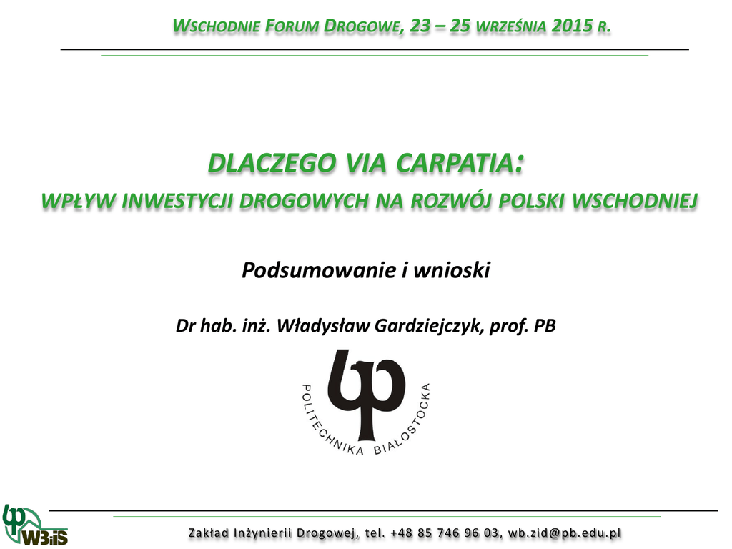 WSCHODNIE FORUM DROGOWE, 23 – 25 WRZEŚNIA 2015 R. DLACZEGO VIA CARPATIA: WPŁYW INWESTYCJI DROGOWYCH NA ROZWÓJ POLSKI WSCHODNIEJ Podsumowanie i wnioski Dr hab. inż. Władysław Gardziejczyk, prof. PB Zakład Inżynierii Drogowej, tel. +48 85 746 96 03, [email protected] WSCHODNIE FORUM DROGOWE Dlaczego Via Carpatia: Wpływ inwestycji drogowych na rozwój Polski Wschodniej Sesje (wygłoszono łącznie 13 referatów + 2 panele dyskusyjne) I. Inwestycje transportowe w woj. podlaskim II. Obwodnica Augustowa – wnioski po latach (dyskusja panelowa) III. Korytarze transeuropejskiej sieci transportowej a polska sieć drogowa IV. Znaczenie drogi S19 dla rozwoju Podlasia (dyskusja panelowa) V. Innowacje technologiczne w budownictwie drogowym VI. Wpływ inwestycji drogowych na rozwój Polski Wschodniej A) Zagadnienia poruszane w referatach: -Inwestycje drogowe w Polsce w kontekście transeuropejskich szlaków transportowych oraz wpływ inwestycji na rozwój regionalny (prof. Wojciech Suchorzewski, prof. Tomasz Komornicki, dr Agnieszka Domańska) -Droga S19 na tle sieci dróg krajowych w Polsce, próby oceny jej przebiegu, stosowanych rozwiązań, jej wpływ na rozwój Polski Wschodniej (referat GDDKiA Oddział w Białymstoku, referaty Politechniki Białostockiej i Politechniki Rzeszowskiej, Zarządu Województwa Lubelskiego, Zarządu Województwa Podkarpackiego) B) Zagadnienia poruszane w referatach: - Projekt Via Baltica i Via Carpatia – spojrzenie ze strony litewskiej (Arunas Rutka) - Inwestycje kolejowe w obecnej perspektywie budżetowej w Polsce Wschodniej (naczelnik Wydziału Projektowego centrum Unijnych Projektów Transportowych Agnieszka Szymańska) - Inwestycje na drogach wojewódzkich Podlasia (Józef Sulima) - Wykorzystanie zasobów kruszyw naturalnych w budownictwie drogowym (dr Marta Wasilewska) - referaty partnerów. C) Dyskusje panelowe: Obwodnica Augustowa – wnioski po latach Znaczenie drogi S19 dla rozwoju Podlasia. Wnioski: 1. Via Carpatia jest ważnym korytarzem transportowym z punktu widzenia rozwoju gospodarczego wielu krajów, w tym także Polski. Połączenie drogą o wysokich standardach technicznych krajów nadbałtyckich, Polski, Słowacji, Węgier, Rumunii, Bułgarii i Grecji stworzy możliwość poprawy międzynarodowej współpracy handlowej, wymiany turystycznej pomiędzy krajami wschodniej części Unii Europejskiej, a także z Białorusią i Ukrainą. 2. Na obszarze województwa podlaskiego włączenie odcinka drogi krajowej nr 8, na odcinku Białystok – Augustów, do sieci kompleksowej TEN-T (ciągu transportowego Via Carpatia) jest bardzo wskazane i należy dołożyć wszelkich starań, aby nastąpiło to w możliwie krótkim okresie. 3. Droga krajowa nr19/S19, o długości około 600 km, jest jednym z głównych elementów szlaku Via Carpatia. Jej parametry techniczne są obecnie bardzo zróżnicowane i na znaczącej części jej przebiegu nie są spełnione wymagania w zakresie planu sytuacyjnego, przekroju podłużnego i przekroju poprzecznego w odniesieniu do klasy technicznej S, a nawet GP. Wnioski (c.d.): 4. Droga krajowa nr 19 na obszarze województwa podlaskiego na 23,5% długości obecnie przebiega przez tereny zabudowy i na 23,9% - przez tereny leśne. Charakteryzuje się zbyt dużą dostępnością (duża liczba skrzyżowań i zjazdów), brakiem obwodnic, co stwarza, że należy do najbardziej niebezpiecznych w grupie dróg krajowych w województwie podlaskim. 5. Generalna Dyrekcja Dróg Krajowych i Autostrad Oddział w Białymstoku, podobnie jak i inne oddziały GDDKiA, przez obszar działalności których przebiega DK nr 19, prowadzą intensywne działania na rzecz przygotowania dokumentacji pozwalającej na przystąpienie do przebudowy/budowy poszczególnych odcinków S19. 6. W opinii uczestników Wschodniego Forum Drogowego powodzenie projektu polegającego na dostosowaniu drogi krajowej nr 19 do parametrów drogi ekspresowej S19 na całej długości na obszarze Polski do 2025 roku wymaga spełnienia bardzo wielu warunków, między innymi związanych ze środkami finansowymi i uzgodnieniami w zakresie ochrony środowiska. Warto przy tym zwrócić uwagę na potrzebę przeprowadzenia szczegółowych analiz pod kątem włączenia w optymalny sposób powstałych inwestycji drogowych w okresie przesuwania w czasie budowy drogi S19. Debata w ramach WSCHODNIEGO KONGRESU GOSPODARCZEGO: 1. Istniejąca sieć transportu we wschodniej części Unii Europejskiej – połączenia drogowe i kolejowe 2. Krytyczne miejsca w transgranicznych powiązaniach transportowych między krajami bałtyckimi a południowo-wschodnią Europą 3. Aktualne problemy inwestycyjne i potrzeby nieujęte w planach 4. Szlak Via Carpatia w europejskiej sieci transportowej – jego elementy, powiązania i funkcje 5. Znaczenie szlaku dla dostępności transportowej wschodniej części Polski 6. Via Carpatia a międzynarodowa wymiana handlowa i współpraca gospodarcza Droga krajowa nr 19 na tle sieci drogowej Polski i TEN-T ? Przebieg DK19 na obszarze woj. podlaskiego – stan obecny Budzisko (PL/LT) 8 S 61 Ogrodniki (PL/LT) Suwałki 16 8 Augustów Kuźnica (PL/BY) Grajewo 61 19 8 Kuźnica Sokółka 65 63 Łomża Straż Czarna Białostocka 64 61 65 ` S8 Bobrowniki (PL/BY) BIAŁYSTOK Zabłudów 8 Zambrów Ryboły 19 Proniewicze 8 66 Bielsk Podlaski 66 Boćki Dziadkowice Warszawa (DK8) 62 Lublin (DK19) Połowce (PL/BY) Siemiatycze Przebieg DK19 na obszarze woj. podlaskiego – stan obecny Długość przejścia DK19 przez Długość przejścia DK19 przez tereny leśne: 23,9% 23,5% źródło: http://www.skyscrapercity.com tereny zabudowy: Ocena dostępności do drogi krajowej nr 19 na obszarze województwa podlaskiego Skrzyżowania w ciągu DK19 na obszarze województwa podlaskiego (bez skrzyżowań i węzłów drogowych na obszarze Białegostoku) 94 skrzyżowania zwykłe 82 5 skrzyżowania skanalizowane 25 1 ronda 3 4 węzły drogowe 0 0 przejazdy kolejowe 2 0 10 20 30 40 50 poza te