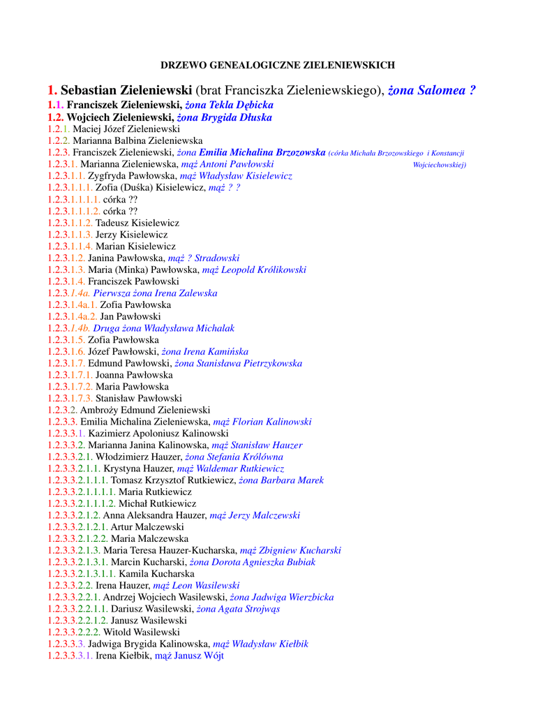 DRZEWO GENEALOGICZNE ZIELENIEWSKICH 1. Sebastian Zieleniewski (brat Franciszka Zieleniewskiego), żona Salomea ? 1.1. Franciszek Zieleniewski, żona Tekla Dębicka 1.2. Wojciech Zieleniewski, żona Brygida Dłuska 1.2.1. Maciej Józef Zieleniewski 1.2.2. Marianna Balbina Zieleniewska 1.2.3. Franciszek Zieleniewski, żona Emilia Michalina Brzozowska (córka Michała Brzozowskiego i Konstancji 1.2.3.1. Marianna Zieleniewska, mąż Antoni Pawłowski Wojciechowskiej) 1.2.3.1.1. Zygfryda Pawłowska, mąż Władysław Kisielewicz 1.2.3.1.1.1. Zofia (Duśka) Kisielewicz, mąż ? ? 1.2.3.1.1.1.1. córka ?? 1.2.3.1.1.1.2. córka ?? 1.2.3.1.1.2. Tadeusz Kisielewicz 1.2.3.1.1.3. Jerzy Kisielewicz 1.2.3.1.1.4. Marian Kisielewicz 1.2.3.1.2. Janina Pawłowska, mąż ? Stradowski 1.2.3.1.3. Maria (Minka) Pawłowska, mąż Leopold Królikowski 1.2.3.1.4. Franciszek Pawłowski 1.2.3.1.4a. Pierwsza żona Irena Zalewska 1.2.3.1.4a.1. Zofia Pawłowska 1.2.3.1.4a.2. Jan Pawłowski 1.2.3.1.4b. Druga żona Władysława Michalak 1.2.3.1.5. Zofia Pawłowska 1.2.3.1.6. Józef Pawłowski, żona Irena Kamińska 1.2.3.1.7. Edmund Pawłowski, żona Stanisława Pietrzykowska 1.2.3.1.7.1. Joanna Pawłowska 1.2.3.1.7.2. Maria Pawłowska 1.2.3.1.7.3. Stanisław Pawłowski 1.2.3.2. Ambroży Edmund Zieleniewski 1.2.3.3. Emilia Michalina Zieleniewska, mąż Florian Kalinowski 1.2.3.3.1. Kazimierz Apoloniusz Kalinowski 1.2.3.3.2. Marianna Janina Kalinowska, mąż Stanisław Hauzer 1.2.3.3.2.1. Włodzimierz Hauzer, żona Stefania Królówna 1.2.3.3.2.1.1. Krystyna Hauzer, mąż Waldemar Rutkiewicz 1.2.3.3.2.1.1.1. Tomasz Krzysztof Rutkiewicz, żona Barbara Marek 1.2.3.3.2.1.1.1.1. Maria Rutkiewicz 1.2.3.3.2.1.1.1.2. Michał Rutkiewicz 1.2.3.3.2.1.2. Anna Aleksandra Hauzer, mąż Jerzy Malczewski 1.2.3.3.2.1.2.1. Artur Malczewski 1.2.3.3.2.1.2.2. Maria Malczewska 1.2.3.3.2.1.3. Maria Teresa Hauzer-Kucharska, mąż Zbigniew Kucharski 1.2.3.3.2.1.3.1. Marcin Kucharski, żona Dorota Agnieszka Bubiak 1.2.3.3.2.1.3.1.1. Kamila Kucharska 1.2.3.3.2.2. Irena Hauzer, mąż Leon Wasilewski 1.2.3.3.2.2.1. Andrzej Wojciech Wasilewski, żona Jadwiga Wierzbicka 1.2.3.3.2.2.1.1. Dariusz Wasilewski, żona Agata Strojwąs 1.2.3.3.2.2.1.2. Janusz Wasilewski 1.2.3.3.2.2.2. Witold Wasilewski 1.2.3.3.3. Jadwiga Brygida Kalinowska, mąż Władysław Kiełbik 1.2.3.3.3.1. Irena Kiełbik, mąż Janusz Wójt 1.2.3.3.3.1.1. Zbigniew Wójt, żona Jolanta Bernard 1.2.3.3.3.1.1.1. Krzysztof Wójt 1.2.3.3.3.1.1.2. Maciej Wójt 1.2.3.3.3.1.2. Jerzy Kiełbik, żona Krystyna Dzióbek 1.2.3.3.3.1.2.1. Marta Kiełbik 1.2.3.3.3.1.2.2. Agata Kiełbik 1.2.3.3.3.2. Zofia Kiełbik, mąż Marian Wierzbowski 1.2.3.3.3.2.1. Anna Wierzbowska, mąż Andrzej Kolawski 1.2.3.3.3.2.1.1. Agnieszka Kolawska 1.2.3.3.3.2.1.2. Aleksander Kolawski 1.2.3.3.3.3. Zdzisław Kiełbik, żona Alicja Ulasińska 1.2.3.3.3.3.1. Jagoda Kiełbik, mąż Janusz Matyjaszek 1.2.3.3.3.3.1.1. Piotr Matyjaszek 1.2.3.3.3.3.1.2. Agnieszka Matyjaszek 1.2.3.3.3.3.2. Bogdan Kiełbik: 1.2.3.3.3.3.2a. Pierwsza żona Barbara ? 1.2.3.3.3.3.2b. Druga żona Alicja ? 1.2.3.3.3.3.2b.1. Agnieszka Kiełbik 1.2.3.3.4. Henryk Kalinowski, żona Marianna Helena Wróblewska 1.2.3.3.4.1. Jadwiga Marianna Kalinowska mąż Ireneusz Michał Henryk Klemens Janusz Ihnatowicz 1.2.3.3.4.1.1. Ewa Jadwiga Ihnatowicz 1.2.3.3.4.2. Maria Florentyna Kalinowska, mąż Józef Pacak 1.2.3.3.4.2.1. Piotr Pacak 1.2.3.3.4.2.2. Michał Henryk Pacak, żona Barbara Kaszubska 1.2.3.3.4.2.2.1. Malwina Dominika Pacak, mąż Jarosław Tomasz Rachowski 1.2.3.3.4.2.2.1.1. Pawełek Rachowski 1.2.3.3.4.2.3. Tomasz Pacak 1.2.3.3.4.2.3a. Pierwsza żona Henryka Zasadzka 1.2.3.3.4.2.3a.1. Janusz Zasadzki, żona Małgorzata Matysiak 1.2.3. 3.4.2.3a.1.1. Marianna Zasadzka 1.2.3.3.4.2.3b. Druga żona Alicja Wandke 1.2.3.3.4.2.3b.1. Szymon Arkadiusz Pacak 1.2.3.3.4.2.3b.2. Błażej Pacak I Małgorzata Ziobro (córka Alicji Wandke z I małżeństwa z Ryszardem Ziobro), mąż Marko Hoffmann II. Adrian Valentin Hoffmann 1.2.3.3.4.3. Janusz Stanisław Kalinowski, żona Janina Karpińska 1.2.3.3.4.3.1. Elżbieta Kalinowska, mąż Wojciech Niedźwiecki 1.2.3.3.4.3.1.1. Maciej Niedźwiecki, żona Agnieszka Przyłudzka 1.2.3.3.4.3.1.1.1. Franciszek Niedźwiecki 1.2.3.3.4.3.1.2. Ewa Niedźwiecka 1.2.3.3.5. Helena Kalinowska 1.2.3.3.6. Stanisław Karol Kalinowski, żona Anna Wieczorek 1.2.3.3.6.1. Bogdan Kalinowski, żona Bronisława Żydziak 1.2.3.3.6.1.1. Sławomir Kalinowski 1.2.3.3.6.1.1a. Pierwsza żona Romualda Sztyk 1.2.3.3.6.1.1a.1. Magdalena Kalinowska 1.2.3.3.6.1.1b. Druga żona Lidia Pyka 1.2.3.3.6.1.1b.1. Michał Kalinowski 1.2.3.3.6.1.2. Ewa Kalinowska, mąż Andrzej Adamowski 1.2.3.3.6.1.2.1. Katarzyna Adamowska 1.2.3.3.6.1.3. Bogdan Kalinowski, żona Violetta ? 1.2.3.3.6.1.3.1. Aleksander Kalinowski 1.2.3.3.6.1.3.2. Anna Kalinowska 1.2.3.3.6.2. Henryka Kalinowska 1.2.3.3.6.2a. Pierwszy mąż Tadeusz Pawlisz 1.2.3.3.6.2a.1. Bogumiła Pawlisz, mąż Zbigniew Mitraszewski 1.2.3.3.6.2a.1.1. Leszek Mitraszewski, żona ? 1.2.3.3.6.2a.1.1.1. Wiktoria Mitraszewska 1.2.3.3.6.2a.1.2. Anna Mitraszewska, mąż Piotr Biernacki 1.2.3.3.6.2a.1.2.1. Piotr Biernacki 1.2.3.3.6.2a.1.3. Marcin Mitraszewski 1.2.3.3.6.2a.1.4. Bartosz Mitraszewski, żona Weronika Haręza 1.2.3.3.6.2a.1.4.1. Wiktoria Mitraszewska 1.2.3.3.6.2a.2. Marek Pawlisz, żona Wanda Lala (Sławomir Lala - syn Wandy z 1 małżeństwa) 1.2.3.3.6.2a.2.1. Małgorzata Pawlisz 1.2.3.3.6.2b. Drugi mąż Zygmunt Skowronek 1.2.3.3.7. Leon Antoni Kalinowski, żona Zofia ? 1.2.3.3.7.1. Maria Julita Kalinowska, mąż Andrzej Rogalka 1.2.3.3.7.2. Liliana Kalinowska, mąż Aleksander Mańkowski 1.2.3.3.7.2.1. Gabriela Mańkowska 1.2.3.3.7.3. Danuta Kalinowska, mąż ? 1.2.3.3.7.3.1. Kuba 1.2.3.3.7.3.2. Bartek 1.2.3.3.8. Janina Kalinowska, mąż Bronisław Sawicki 1.2.3.3.8.1. Barbara Sawicka, mąż Ireneusz Wojciech Szyszka 1.2.3.3.8.1.1. Maciej Szyszka, żona Anna Gadek 1.2.3.3.8.1.1.1. Wojciech Szyszka 1.2.3.3.8.1.
