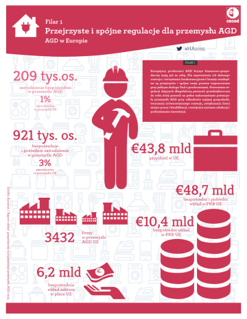 Filar 1 Przejrzyste i spójne regulacje dla przemysłu AGD AGD w Europie #HA2025 FILAR 1 209 tys.os. Europejscy producenci AGD kryzys finansowo-gospodarczy mają już za sobą. Dla zapewnienia ich dalszego rozwoju i utrzymania konkurencyjności branży niezbędne są przejrzyste i spójne ramy prawne wypracowane przy pełnym dialogu Unii z producentami. Stworzenie regulacji dających długofalową pewność przedsiębiorcom do roku 2025 pozwoli na pełne wykorzystanie potencjału przemysłu AGD przy odbudowie unijnej gospodarki, tworzeniu zrównoważonego rozwoju, zwiększaniu ilości miejsc pracy i kwalifikacji, rozwijaniu systemu edukacji i podwyższaniu inwestycji. zatrudnienie bezpośrednie w przemyśle AGD 1% zatrudnienia w przemyśle UE 921 tys. os. €43,8 mld bezpośrednie i pośrednie zatrudnienie w przemyśle AGD przychód w UE 3% zatrudnienia w przemyśle UE Źródło: Eurostat / Raport wkład gospodarczy europejskiego przemysłu AGD 2015 €48,7 mld bezpośredni i pośredni wkład w PKB UE 3432 6,2 mld bezpośrednia wkład sektora w płace UE firmy w przemyśle AGD UE € €10,4 mld bezpośredni wkład w PKB UE Filar 2 Rozwój zrównoważonej konsumpcji AGD w Europie #HA2025 FILAR 2 W 2013, prawie 100% lodówek na rynku było w klasie energetycznej Sources: Eurostat / WEEE Forum / 2015 report on the Economic Impact of the Home Appliances Industry in Europe 75% zmywarek na rynku było w klasie energetycznej 91% A+ A+ lub 40% A+++ pralek na rynku było w najwyższej klasie energetycznej lub 9,45 mln ton wytworzonych e-odpadów w UE 28 9,45 poziom odzysku żutego dużego AGD mln ton "./&)*%+$,'.-+ 87% Zrównoważony rozwój zaczyna się w naszych domach. Urządzenia AGD oszczędzając czas i zasoby wpływają na styl życia konsumentów. Dla osiągnięcia w pełni zrównoważonego stylu życia niezbędna jest współpraca UE z przemysłem w celu zapewnienia świadomych ekologicznie wyborów konsumenckich oraz pełnego wykorzystania potencjału oszczędności zasobów. Branża AGD dokonała znaczących inwestycji stwarzając infrastrukturę zarządzania elektroodpadami. Jako jedna z pierwszych branż w pełni realizujemy rozszerzoną odpowiedzialność producenta wspierając gospodarkę obiegu zamkniętego. !""#$%&'()*#)"#+'*,$&'()-,,,)&..,(!.)*$!%,) poziom odzysku żutego małego AGD CWIT project 3,3 mln ton zaraportowano do systemu 0,75 mln ton trafiło na składowiska 2,2 mln ton zmieszano ze złomem brak informacji 3,2 mln ton Filar 3 Inteligentne AGD AGD w Europie #HA2025 FILAR 3 €1,4 mld wydatki na R&D Branża AGD jest sektorem innowacyjnych rozwiązań stale inwestując w badania i rozwój. Jednym z wyzwań jest projektowanie inteligentnych urządzeń AGD, które zapewnią nie tylko komfort, ale także zrównoważony styl życia gospodarstw domowych. Przemysł AGD potrzebuje wsparcia ze strony decydentów, włączając w to stworzenie Platformy inteligentnych urządzeń w ramach unijnego Jednolitego Rynku Cyfrowego oraz ustanowienie jasnej i spójnej polityki dla zapewnienia dalszych inwestycji w rozwój inteligentnych urządzeń. Niezbędna jest także współpraca z przemysłem w celu dostosowania inwestycji w inteligentne urządzenia do tworzonej infrastruktury. C 11,6 tys. złożonych patentów 8% Sources: Eurostat / CECED Membership / European Patent Office / GfK Wartość sprzedażna inteligentnego AGD wszystkich wniosków patentowych w 2013 pochodziło z AGD €225 mln (2Q 2016) Wartość rynku inteligentnego AGD w 2016 wzrosła kilkakrotnie Filar 4 Przyśpieszanie wzrostu gospodarczego UE AGD w Europie #HA2025 FILAR 4 W 2015 w Europie sprzedano 125 mln & 100 mln szt. małego AGD Europejski wzrost gospodarczy oraz konkurencyjność zależą od stopnia swobody, otwartości i równowagi w handlu. Dlatego naszym zdaniem należy wspierać strategię UE, która koncentruje się na utrzymaniu otwartych rynków. Jako znaczący uczestnik unijnego handlu widzimy także potrzebę wzmacniania nadzoru rynku poprzez współpracę z rządami Państw członkowskich UE oraz wymianę najlepszych praktyk. Lepsze egzekwowanie przepisów pozwoli naszym zdaniem wykorzystać potencjał obecnych regulacji prawnych i zapewni równe warunki rozwoju dla całej branży AGD. szt. dużego AGD EUROPA AMERYKA PN. 2014 2015 49.508 52.934 Europa to 2 największy rynek dużego AGD na świecie 2014 2015 + 2,45% KOREA + 6,92% 2014 2015 CHINY 2014 2015 75.277 77.124 5.200 5.250 + 0,96% 93.273 95.564 JAPONIA 2014 + 2,46% Sources: Eurostat / CECED Membership / IRHMA 2015 13.267 12.144 - 8,46% 75% eksportu dużego AGD pozostaje w UE 80% eksportu małego AGD pozostaje w UE €11,1 mld €8,4 mld import wewnątrzunijny dużego AGD import wewnątrzunijny małego AGD