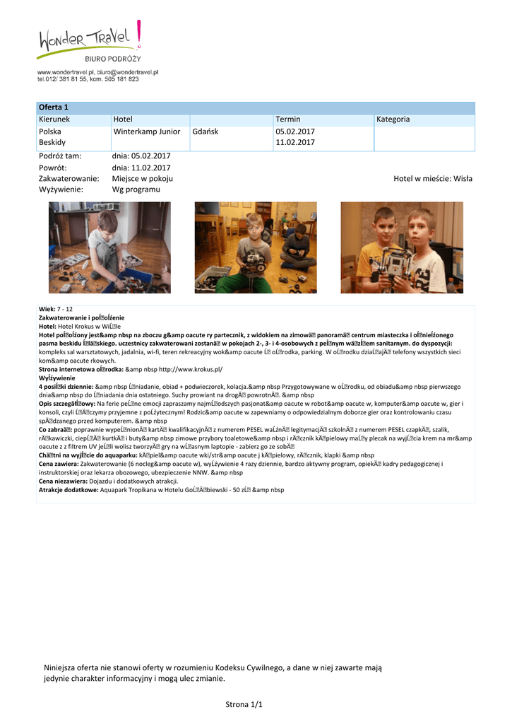 Oferta 1 Kierunek Polska Beskidy Hotel Winterkamp Junior Podróż tam: Powrót: Zakwaterowanie: Wyżywienie: dnia: 05.02.2017 dnia: 11.02.2017 Miejsce w pokoju Wg programu Termin 05.02.2017 11.02.2017 Gdańsk Kategoria Hotel w mieście: Wisła Wiek: 7 - 12 Zakwaterowanie i poĺoĺźenie Hotel: Hotel Krokus w WiĹle Hotel poĺoĺźony jest& nbsp na zboczu g& oacute ry partecznik, z widokiem na zimowä panoramä centrum miasteczka i oĺnieĺźonego pasma beskidu ĺlä skiego. uczestnicy zakwaterowani zostanä w pokojach 2-, 3- i 4-osobowych z peĺnym wäzĺem sanitarnym. do dyspozycji: kompleks sal warsztatowych, jadalnia, wi-fi, teren rekreacyjny wok& oacute Ĺ oĹrodka, parking. W oĹrodku dziaĹajÄ telefony wszystkich sieci kom& oacute rkowych. Strona internetowa oĺrodka: & nbsp http://www.krokus.pl/ Wyĺźywienie 4 posiĺki dziennie: & nbsp Ĺniadanie, obiad + podwieczorek, kolacja.& nbsp Przygotowywane w oĹrodku, od obiadu& nbsp pierwszego dnia& nbsp do Ĺniadania dnia ostatniego. Suchy prowiant na drogÄ powrotnÄ . & nbsp Opis szczegăłĺowy: Na ferie peĹne emocji zapraszamy najmĹodszych pasjonat& oacute w robot& oacute w, komputer& oacute w, gier i konsoli, czyli ĹÄ czymy przyjemne z poĹźytecznym! Rodzic& oacute w zapewniamy o odpowiedzialnym doborze gier oraz kontrolowaniu czasu spÄdzanego przed komputerem. & nbsp Co zabraä: poprawnie wypeĹnionÄ kartÄ kwalifikacyjnÄ z numerem PESEL waĹźnÄ legitymacjÄ szkolnÄ z numerem PESEL czapkÄ, szalik, rÄkawiczki, ciepĹÄ kurtkÄ i buty& nbsp zimowe przybory toaletowe& nbsp i rÄcznik kÄ pielowy maĹy plecak na wyjĹcia krem na mr& oacute z z filtrem UV jeĹli wolisz tworzyÄ gry na wĹasnym laptopie - zabierz go ze sobÄ Chätni na wyjĺcie do aquaparku: kÄ piel& oacute wki/str& oacute j kÄ pielowy, rÄcznik, klapki & nbsp Cena zawiera: Zakwaterowanie (6 nocleg& oacute w), wyĹźywienie 4 razy dziennie, bardzo aktywny program, opiekÄ kadry pedagogicznej i instruktorskiej oraz lekarza obozowego, ubezpieczenie NNW. & nbsp Cena niezawiera: Dojazdu i dodatkowych atrakcji. Atrakcje dodatkowe: Aquapark Tropikana w Hotelu GoĹÄbiewski - 50 zĹ & nbsp Niniejsza oferta nie stanowi oferty w rozumieniu Kodeksu Cywilnego, a dane w niej zawarte mają jedynie charakter informacyjny i mogą ulec zmianie. Strona 1/1 Powered by TCPDF (www.tcpdf.org)