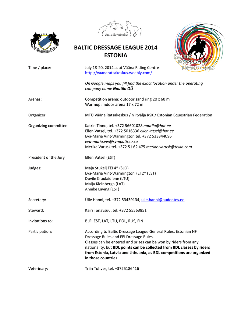 BALTIC DRESSAGE LEAGUE 2014 ESTONIA Time / place: July 18-20, 2014.a. at Vääna Riding Centre http://vaanaratsakeskus.weebly.com/ On Google maps you fill find the exact location under the operating company name Nautilo OÜ Arenas: Competition arena: outdoor sand ring 20 x 60 m Warmup: indoor arena 17 x 72 m Organizer: MTÜ Vääna Ratsakeskus / Niitvälja RSK / Estonian Equestrian Federation Organizing committee: Katrin Tinno, tel. +372 56601028 [email protected] Ellen Vatsel, tel. +372 5016336 [email protected] Eva-Maria Vint-Warmington tel. +372 533344095 [email protected] Merike Varusk tel. +372 51 62 475 [email protected] President of the Jury Ellen Vatsel (EST) Judges: Maja Štukelj FEI 4* (SLO) Eva-Maria Vint-Warmington FEI 2* (EST) Dovilė Kraulaidienė (LTU) Maija Kleinberga (LAT) Annike Laving (EST) Secretary: Ülle Hanni, tel. +372 53439134, [email protected] Steward: Kairi Tänavsuu, tel. +372 55563851 Invitations to: BLR, EST, LAT, LTU, POL, RUS, FIN Participation: According to Baltic Dressage League General Rules, Estonian NF Dressage Rules and FEI Dressage Rules. Classes can be entered and prizes can be won by riders from any nationality, but BDL points can be collected from BDL classes by riders from Estonia, Latvia and Lithuania, as BDL competitions are organized in those countries. Veterinary: Triin Tohver, tel. +3725186416 Specific Technical Conditions: Opening of stables 17/07/14 from 12:00 Veterinary Horse Inspection – 18/07/14 at 18:30 Prize for the best presented participant at vet inspection! Draw for starting order – 18/07/14 after horse Inspection Competition arena can be used for training until 15:00 on 18/07/14 The competitions are held according to the FEI GR. Dress & Saddlery: Protective Headgear or top hat - according to Art.427.1 FEI Dressage Rules. Dress – according to Art.427.2 and Art.427.4 FEI Dressage Rules and Art.P-18 (for Children’s classes) Saddlery according to Art. 428. FEI Dressage Rules. Whip is not allowed whilst competing, (only during warm up). Entries: Riders from LAT, LTU, FIN, POL, etc.: Before 03/07/14 through your National Federation, sent to [email protected]. Estonian riders submit entries through https://ratsanet.ee/ Entries must include the following information on horses and athletes: Horses: name of horse; year of birth; breed; country of birth; sex; sire; sire of dam; Athletes: name of athlete; year of birth (for children, juniors, young riders) Passports of horses – National or FEI Vaccination against Influenza required as per National Rules. After the registration deadline the organizer reserves the right to charge entry fees in double. Masterlist and starting lists: Confirmed schedule and masterlist will be available by 14/07/14 at http://balticriders.com Riding times will be posted after the draw in the evening of July 18th. Prizes: After each class. Ribbons for 25% horses but not less than 3 for each class. Coolers for winners of each division (1st day + 2nd day) BDL Seniors PSG + Inter I Freestyle (or Inter I) BDL Young Riders M class (1st day + 2nd day) BDL Juniors L class (1st day + 2nd day BDL Children A + L (1st day + 2nd day) BDL Amateurs A + L (1st day + 2nd day) Open class M (1st day + 2nd day) Open class L (1st day + 2nd day) Open class A (1st day + 2nd day) Grand Prix (1st day) 400.-EUR 300.-EUR 200.-EUR 200.-EUR 200.-EUR Prizes of kind Prizes of kind Prizes of kind Prizes of kind Special prize by Mõisahobused MTÜ for the highest score in a musical freestyle. Stalls for horses: Booking by email only, by 03/07/14 [email protected] Upon booking, please indicate the sex of the horse and the approx.. time of arrival. Info: Birgit Pulk, +372 55666829 Price for 4 days: 17/0714 – 20/07/14 - 50 €, incl. initial bedding, additional bedding can be purchased for 9€ per package. If available, stalls can be also booked at 15 € per day. Stabling does not include feed, hay can be purchased at 6€ per package (ca 15-17kg). The number of stalls is limited, preference is given to horses from outside Estonia and for bookings for the whole competition period. More info: Horses have to carry COMPETITION NUMBERS at all times while being outside the stall. Electricity – 20 EUR on request NB! Saturday evening everyone is invited to the RIDERS PARTY!!!! Exact time to be advised. Fun, games, new friends, a draw for prizes and food for everyone! Participation fee 5 EUR The Organizer cannot take responsibility of material of physical damage (accidents, theft, illness etc.) that can happen to horses, competitors, grooms, horse owners at the show grounds before, during or after the competition. Purchasing insurance coverage is strongly recommended. Competition Schedule Friday, July 18th 11.00 - 17.00 Seminar with FEI 4* judge and trainer Maja Štukelj Topic: How judges and coaches can work together to help the athlete ride the perfect test! Participation fee: 30 € NB! Fee includes a possibility to do shadow judging with Maja Štukelj on Saturday, July 19th at PSG, M, L and A levels. Please let us know about your wish for SJ with the required level on the registration form! Please register for the seminar through this online FORM by July 12th, 2014! Please note that the order of the tests will be changed, the actual schedule will be published on July 14th at http://balticriders.com Saturday, July 19th Approx. start @ 9:00 Program Nr. 1, Prix St. Georges (2009) BDL Seniors Class, Entry fee 30 € Program Nr. 2, FEI Juniors Preliminary Test (2009) BDL Young Riders Class, Entry fee 25 € Program Nr. 3, FEI Children Individual Test (2009) BDL Juniors Class, Entry fee 25 € Program Nr. 4, FEI WDC Preliminary Test (2011) BDL Children’s Class, Entry fee 25 € Program Nr. 5, FEI WDC Preliminary Test (2011) BDL Amateurs Class, Entry fee 30 € Program Nr. 6, FEI Juniors Preliminary Test (2009) Open Class M, Entry fee 30 € Program Nr. 7, L level test L32 (2013) Open Class L, Entry fee 25 € Program Nr. 8, FEI Children Pre
