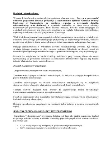 Dodatek mieszkaniowy: Wypłata dodatków mieszkaniowych jest zadaniem własnym gminy. Decyzje o przyznaniu/ odmowie przyznania dodatku podejmuje z upoważnienia dyrektor Ośrodka Pomocy Społecznej w Sandomierzu na podstawie wniosku o przyznanie dodatku mieszkaniowego oraz deklaracji o wysokości dochodów za okres trzech miesięcy kalendarzowych poprzedzających dzień złożenia wniosku. Ponadto osoba ubiegająca się o dodatek mieszkaniowy ma obowiązek przedstawić do wglądu dokumenty potwierdzające wykazany w deklaracji dochód gospodarstwa domowego. Właściciel domu jednorodzinnego powinien dodatkowo dołączyć do wniosku zaświadczenie Starostwa Powiatowego potwierdzającego tytuł prawny do zajmowanego budynku, wielkość powierzchni użytkowej domu jednorodzinnego i stan wyposażenia technicznego budynku. Decyzja administracyjna o przyznaniu dodatku mieszkaniowego powinna być wydana w ciągu jednego miesiąca od daty złożenia wniosku. Odwołanie od decyzji wnosi się do samorządowego kolegium odwoławczego za pośrednictwem organu, który wydał decyzję. Dodatek jest wypłacany do 10 dnia każdego miesiąca z góry zarządcy domu lub osobie upoważnionej do pobierania należności za mieszkanie. Bezpośrednio wypłaca się dodatki jedynie właścicielom domu jednorodzinnego. Dodatek mieszkaniowy przysługuje: 1)najemcom oraz podnajemcom lokali mieszkalnych, 2)osobom mieszkającym w lokalach mieszkalnych, do których przysługuje im spółdzielcze prawo do lokalu mieszkalnego, 3)osobom mieszkającym w lokalach mieszkalnych znajdujących się w budynkach stanowiących ich własność i właścicielom samodzielnych lokali mieszkalnych, 4)innym osobom mającym tytuł prawny do zajmowanego i ponoszącym wydatki związane z jego zajmowaniem, lokalu mieszkalnego 5)osobom zajmującym lokal mieszkalny bez tytułu prawnego, oczekującym na przysługujący im lokal zamienny albo socjalny. Dodatek mieszkaniowy przysługuje na podstawie tylko jednego z tytułów wymienionych wyżej WARUNKI PRZYZNANIA DODATKU MIESZKANIOWEGO Warunkiem “ dochodowym” przyznania dodatku jest fakt, aby średni miesięczny dochód na jednego członka rodziny w okresie 3 miesięcy poprzedzających dzień złożenia wniosku, nie przekraczał: 175% kwoty najniższej emerytury w gospodarstwie jednoosobowym 125% najniższej emerytury w gospodarstwie wieloosobowym, Najniższa emerytura od 1 marca 2014r. wynosi 844,45 zł. Dochód gospodarstwa domowego stanowią wszelkie przychody po odliczeniu kosztów ich uzyskania i składek na ubezpieczenia emerytalne, rentowe oraz ubezpieczenia chorobowe. Do dochodu nie wlicza się świadczeń pomocy materialnej dla uczniów, dodatków dla sierot zupełnych, jednorazowych zapomóg z tytułu urodzenia się dziecka, dodatku z tytułu urodzenia dziecka, pomocy w zakresie dożywiania, zasiłków pielęgnacyjnych, zasiłków okresowych z pomocy społecznej, jednorazowych świadczeń pieniężnych i świadczeń w naturze z pomocy społecznej, dodatku mieszkaniowego, dodatku energetycznego oraz zapomogi pieniężnej, o której mowa w przepisach o zapomodze pieniężnej dla niektórych emerytów, rencistów i osób pobierających świadczenie przedemerytalne albo zasiłek przedemerytalny w 2007r. Warunkiem do przyznania dodatku mieszkaniowego jest m. in.: oprócz kryterium dochodu na osobę w rodzinie - warunek “powierzchniowy“. W przeliczeniu na liczbę członków gospodarstwa domowego, powierzchnia ta nie może przekraczać: 35 m2 dla jednej osoby, 40 m2 dla 2 osób, 45 m2 dla 3 osób, 55 m2 dla 4 osób, 65 m2 dla 5 osób, 70 m2 dla 6 osób. W przypadku zamieszkiwania w mieszkaniu większej liczby osób, dla każdej kolejnej osoby powiększa się powierzchnię normatywną o 5 m2. Normatywną powierzchnię powiększa się o 15 m2, jeżeli w lokalu mieszkalnym zamieszkuje osoba niepełnosprawna poruszająca się na wózku lub osoba niepełnosprawna, której niepełnosprawność wymaga zamieszkiwania w oddzielnym pokoju. O wymogu zamieszkiwania w oddzielnym pokoju orzekają powiatowe zespoły do spraw orzekania o niepełnosprawności, o których mowa w ustawie z dnia 27 sierpnia 1997 r. o rehabilitacji zawodowej i społecznej oraz zatrudnianiu osób niepełnosprawnych Nie ogranicza uprawnienia do dodatku mieszkaniowego sytuacja, gdy powierzchnia użytkowa mieszkania nie przekracza powierzchni normatywnej o więcej niż 30% lub 50 % jeśli powierzchnia pokoi i kuchni nie przekracza 60 % powierzchni użytkowej lokalu. WYDATKI NA MIESZKANIE MIESZKANIOWEGO WPŁYWAJĄ NA WYSOKOŚĆ DODATKU Przy obliczaniu wysokości dodatku mieszkaniowego bierze się pod uwagę wydatki, jakie ponosi osoba ubiegająca się o dodatek w związku z zajmowaniem lokalu. Wydatkami, o których mowa są: 1) czynsz, 2) opłaty związane z eksploatacją i utrzymaniem nieruchomości w częściach przypadających na lokale mieszkalne w spółdzielni mieszkaniowej z wyłączeniem opłat za wieczyste użytkowanie gruntów 3) zaliczki na koszty zarządu nieruchomością wspólną, 4) odszkodowanie za zajmowanie lokalu bez tytułu prawnego, 5) inne niż wymienione w pkt 1-4 opłaty za używanie lokalu mieszkalnego, 6) opłaty za energię cieplną, wodę, odbiór nieczystości stałych i płynnych, 7) wydatek stanowiący podstawę obliczania ryczałtu na zakup opału. Nie stanowią wydatków, wydatki poniesione z tytułu: 1) ubezpieczeń, podatku od nieruchomości, opłat za wieczyste użytkowanie gruntów, 2) opłat za gaz przewodowy, energię elektryczną, dostarczane do lokalu mieszkalnego (domu jednorodzinnego) na cele bytowe. Jeżeli osoba ubiegająca się o dodatek mieszkaniowy zamieszkuje w lokalu mieszkalnym lub domu niewchodzącym w skład mieszkaniowego zasobu gminy, do wydatków przyjmowanych dla celów obliczenia dodatku mieszkaniowego zalicza się: 1) wydatki, które w wypadku najmu lokalu mieszkalnego byłyby pokrywane w ramach czynszu, lecz wyłącznie do wysokości czynszu, jaki obowiązywałby dla 